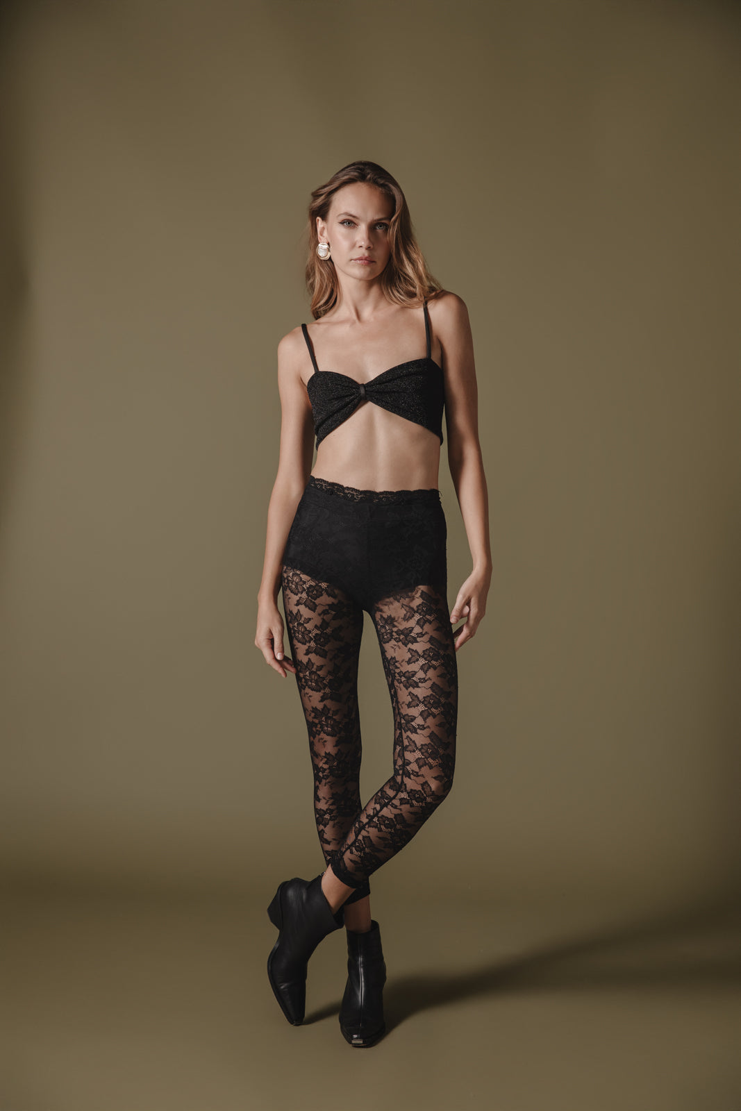 These mid-waisted lace leggings feature an intricate floral pattern in a forever black, adding a bold yet elegant touch to any outfit. The semi-sheer design balances sultry and sophisticated, making them perfect for layering under dresses, skirts, or oversized tops. Crafted with a figure-flattering silhouette, they offer both comfort and style. Ideal for creating statement looks, whether for a night out or a chic everyday ensemble.