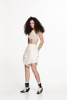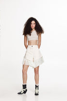 These tailored shorts combine clean lines with playful movement. Crafted in a soft cream tone, they feature a flattering high-waisted fit and a structured silhouette that enhances the shape while remaining comfortable.