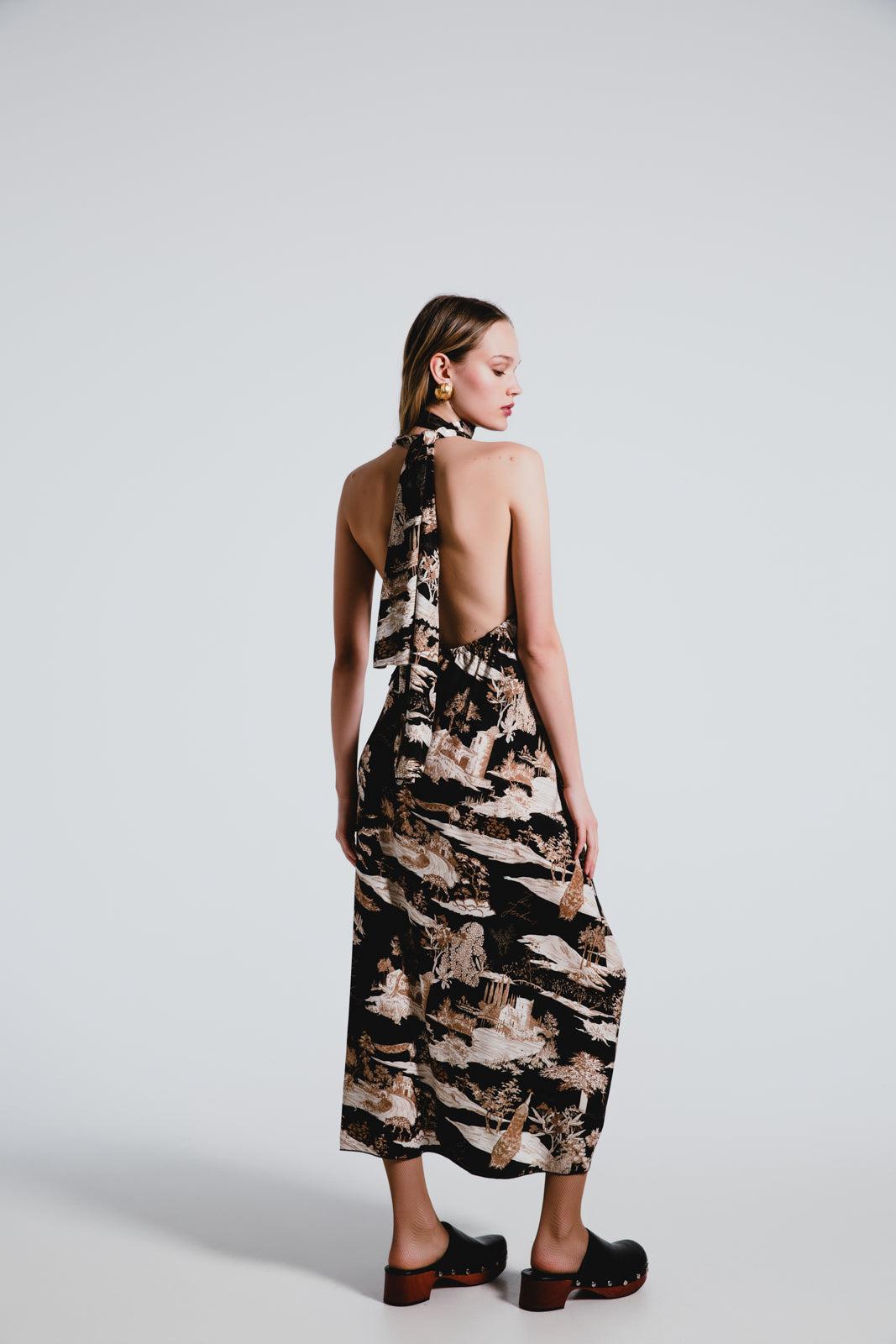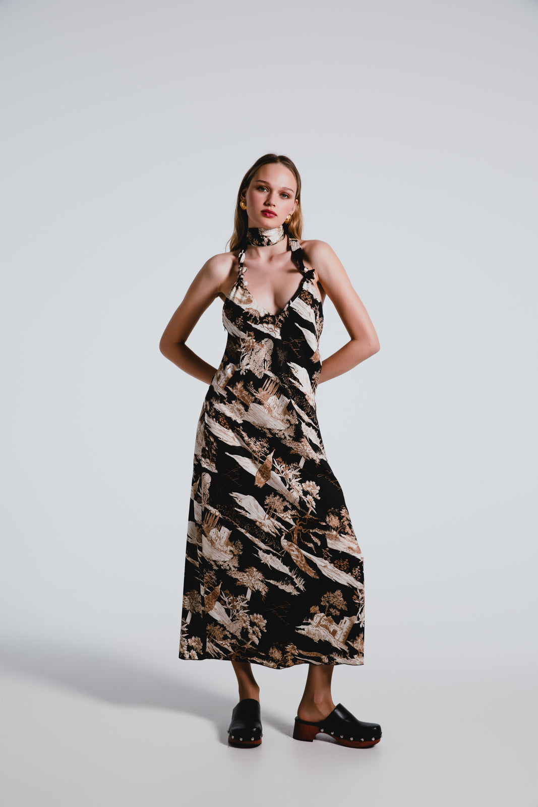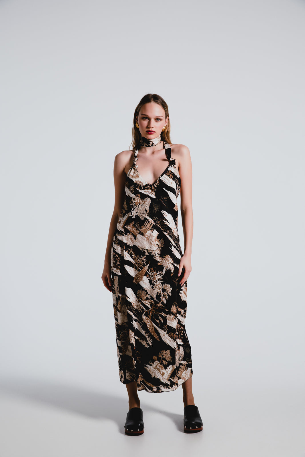 This elegant slip dress features a captivating Oasia print, adding a touch of exotic allure to its design. The dress boasts a backless cut offering a bold and stylish statement. It comes with long, thick straps that can be creatively wrapped around the neck, adding versatility to your look. The ankle-length hem and relaxed fit make it perfect for both casual and formal occasions, while the deep V-neckline adds a hint of allure. Paired with clogs or sandals, it strikes a perfect balance between comfort and chick fashion.