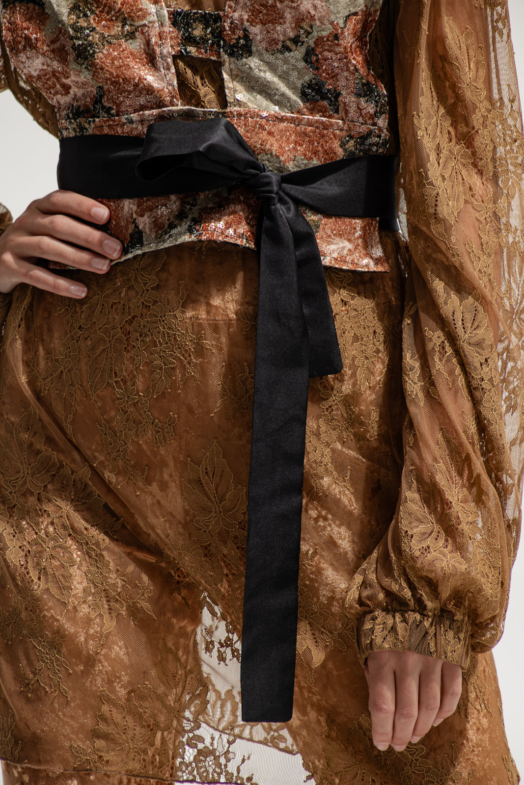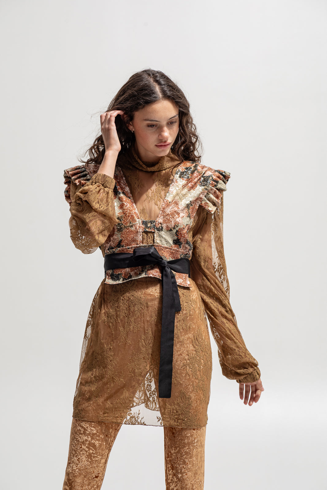 The design features statement pleated shoulders, a plunging V-neckline and an adjustable waist tie that defines the silhouette. The open-back construction with criss-cross straps adds a modern, sensual twist, making it a standout piece for styling day or night.
