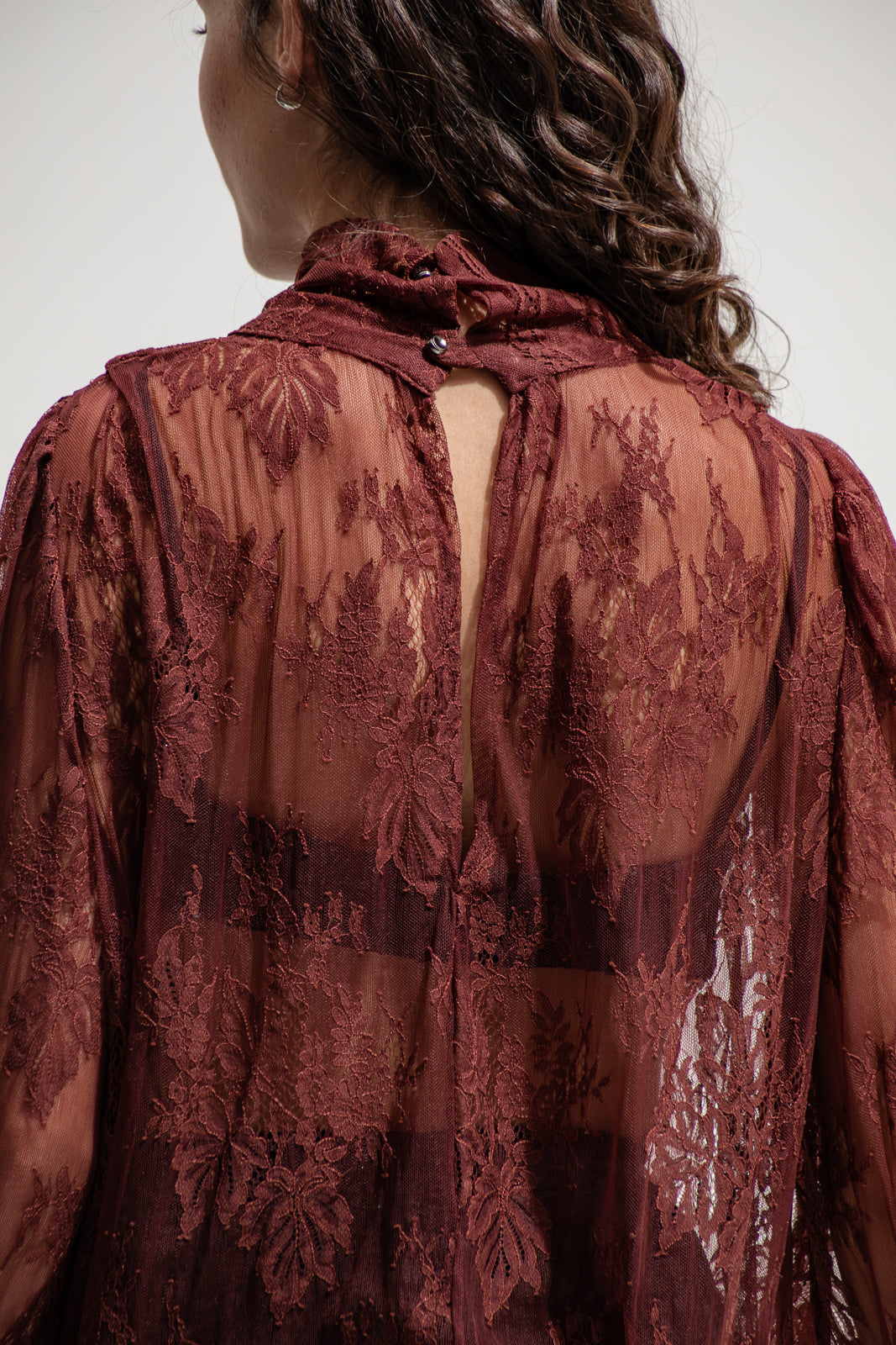 Sensual, effortless and unapologetically bold. This sheer burgundy lace mini dress combines romance with The Jerkins’ signature attitude. Designed with a relaxed silhouette, voluminous sleeves and a soft draped neckline, it’s a versatile layering piece that moves between elegance and rebellion — pair it with bralettes, shorts or slip dresses for an elevated statement.