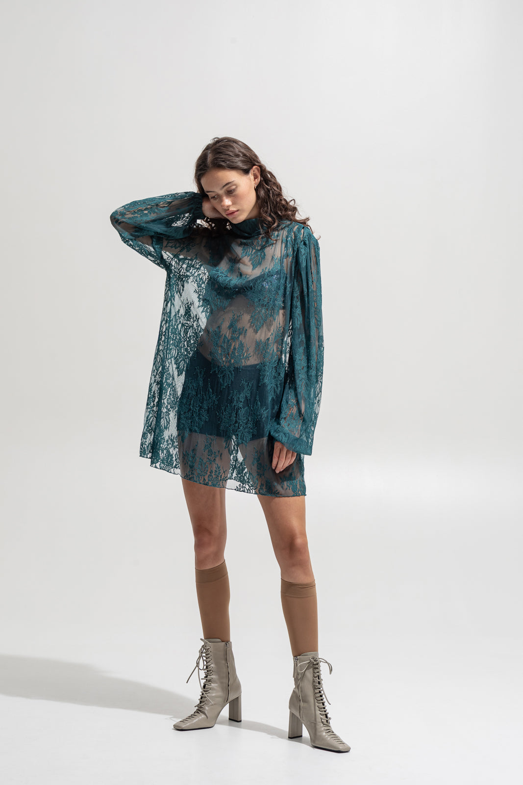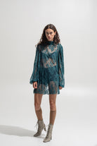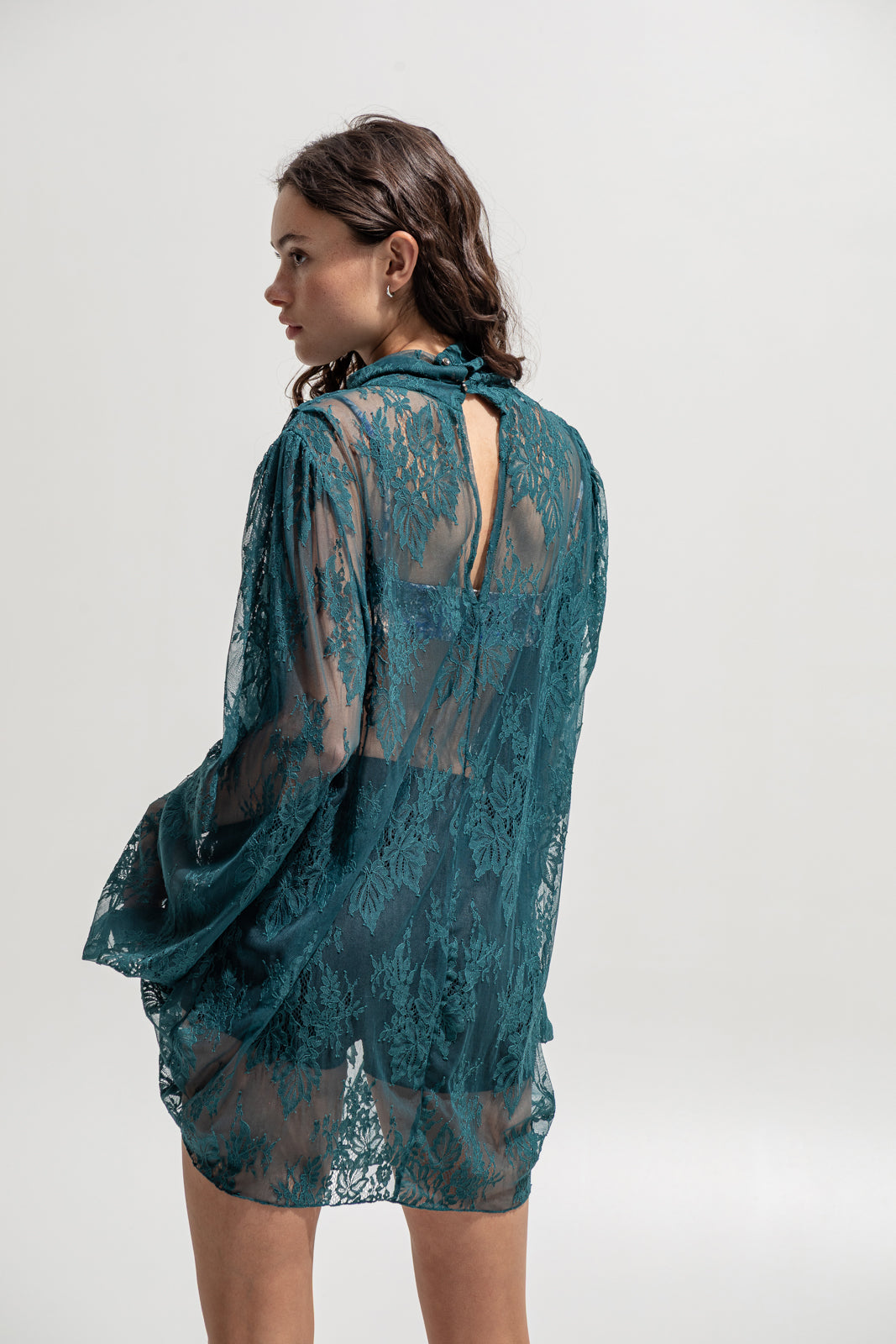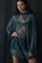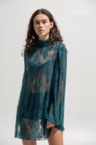 A sheer statement piece that captures femininity with attitude. Crafted from intricate teal lace, this mini dress drapes fluidly over the body with a romantic yet daring touch. Designed with long puff sleeves, a gathered neckline, and a subtle keyhole at the back, it’s the ultimate layering piece — wear it with a bralette and shorts, or style it over a slip dress for evening.