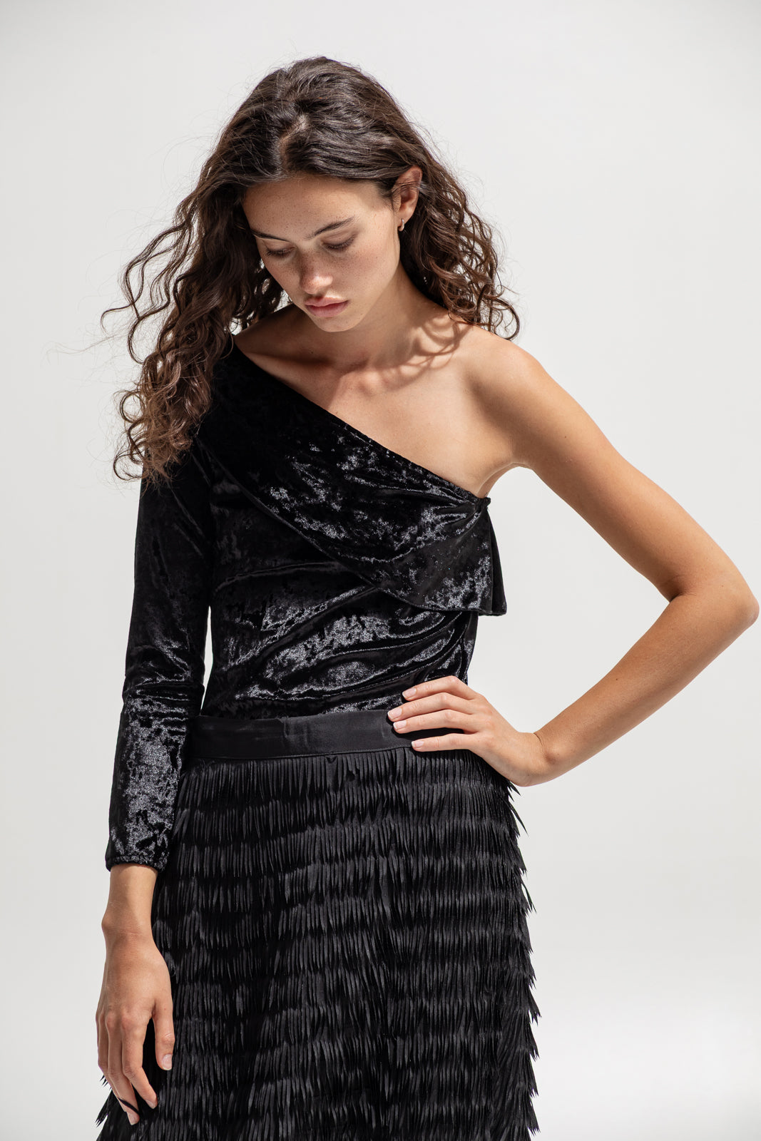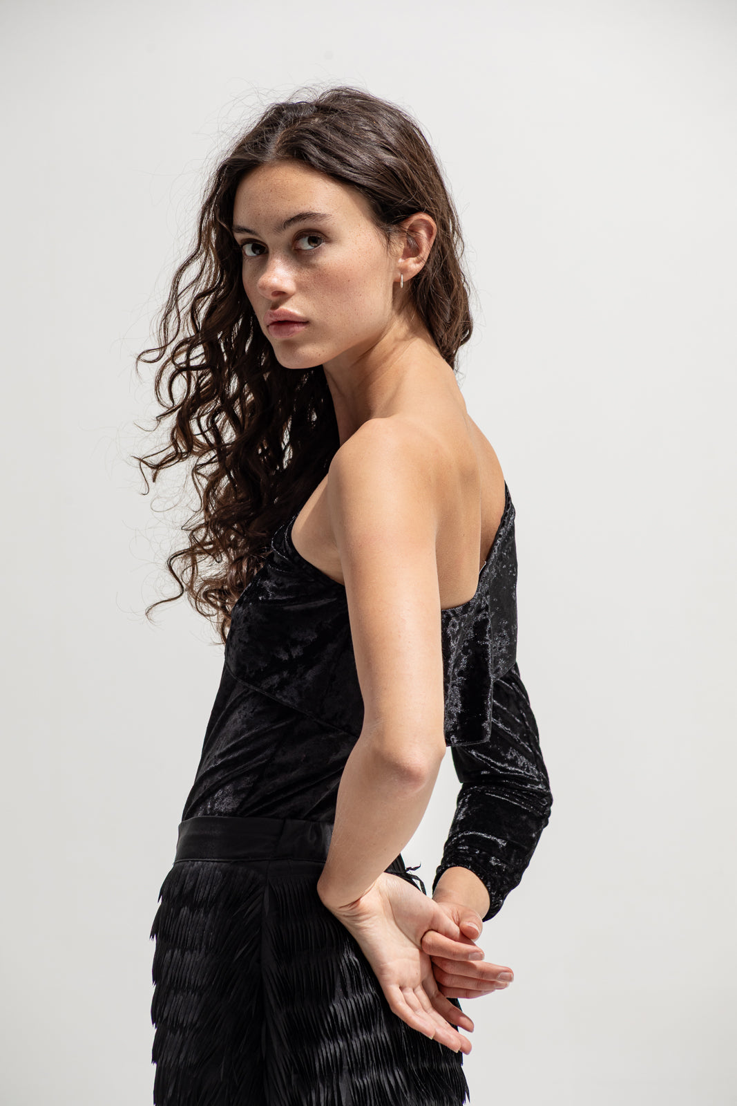 Bold yet timeless, this one-shoulder bodysuit is crafted from crushed black velvet with a soft, luminous texture. The asymmetric neckline drapes gracefully across the body, accentuating the shoulders with sculptural elegance. Designed to fit close to the skin, it brings effortless sophistication to evening looks — perfect under tailored pants or statement skirts.