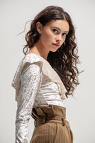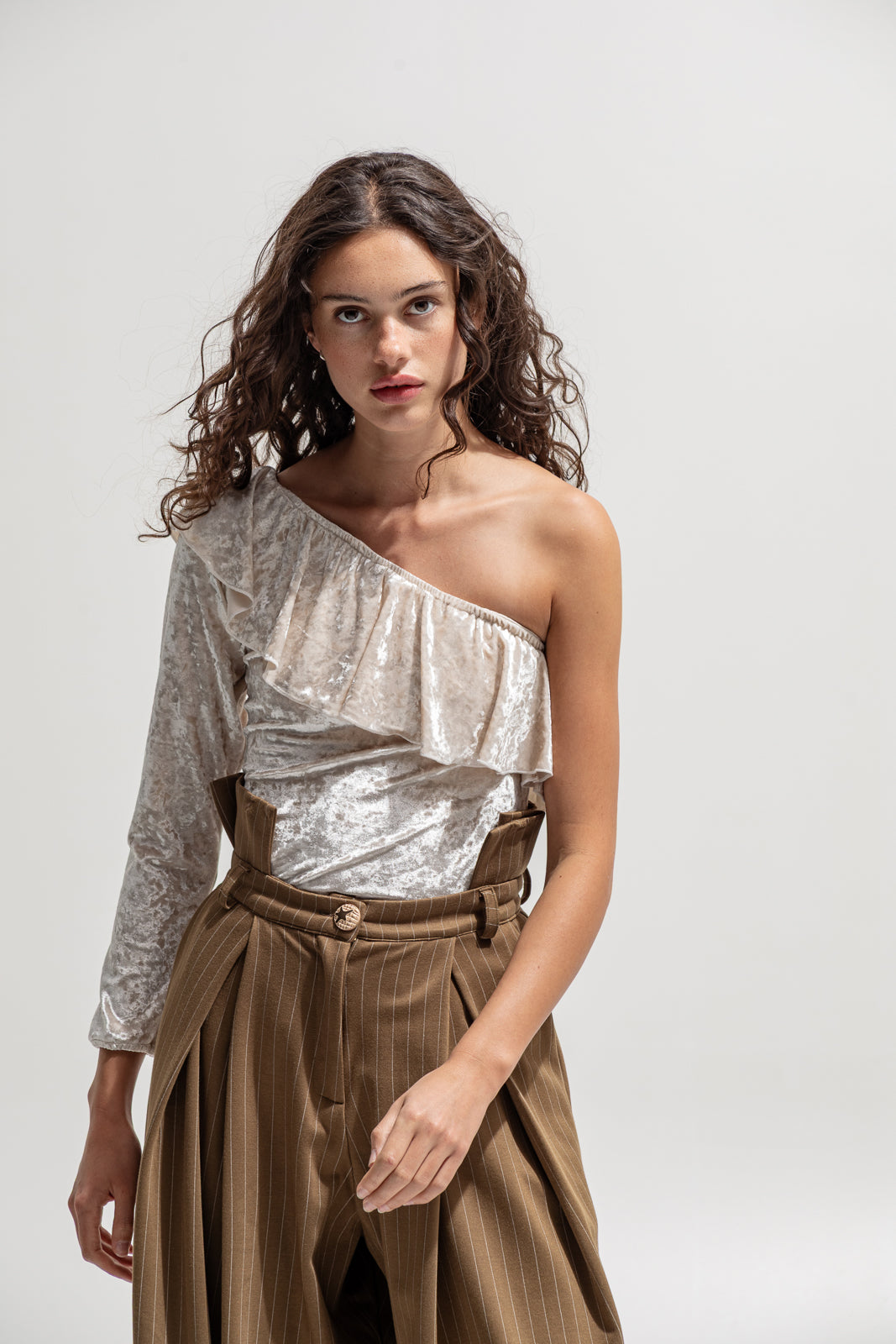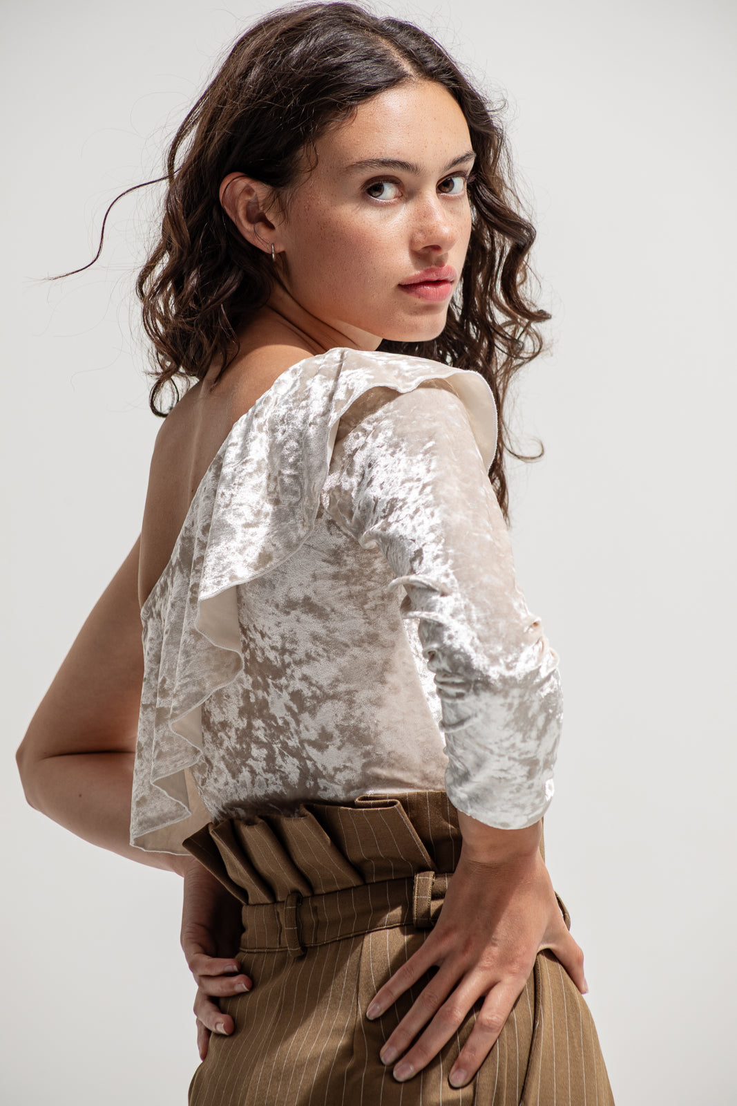 Soft, sculptural, and unapologetically feminine — this one-shoulder bodysuit is cut from plush stretch velvet that hugs the body beautifully. The cascading ruffle detail adds movement and romance, while the asymmetrical neckline highlights the shoulders and collarbones. Perfect for pairing with high-waisted trousers or skirts for a refined yet daring look.