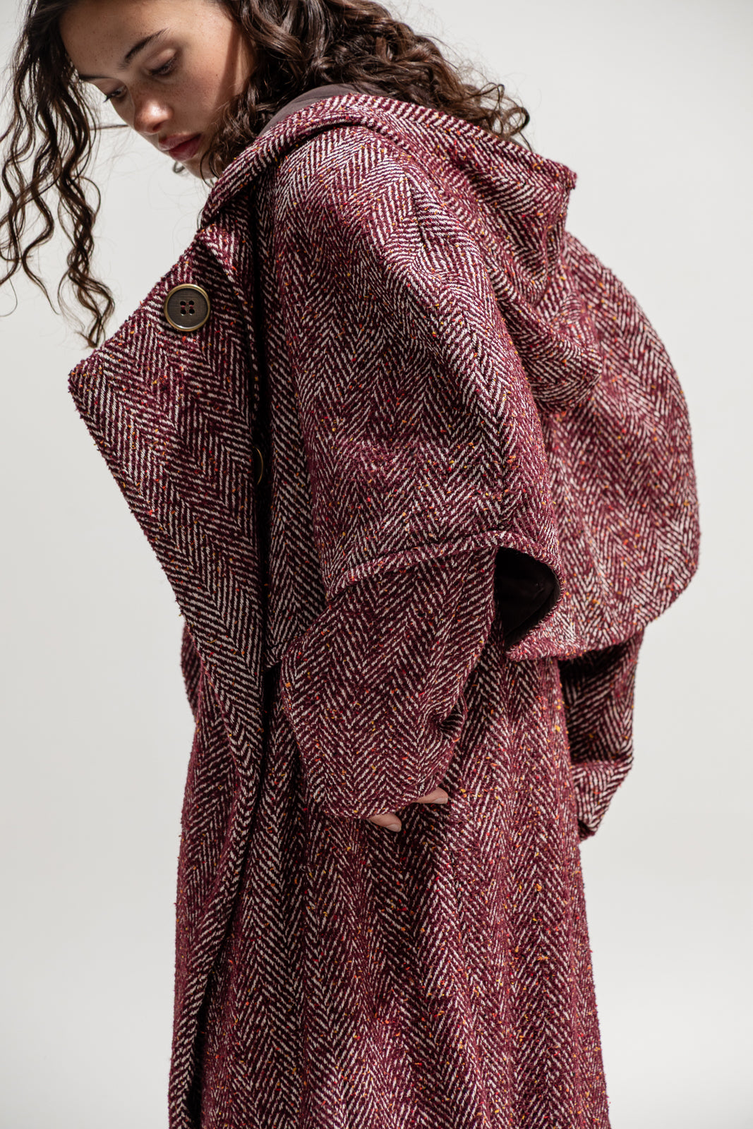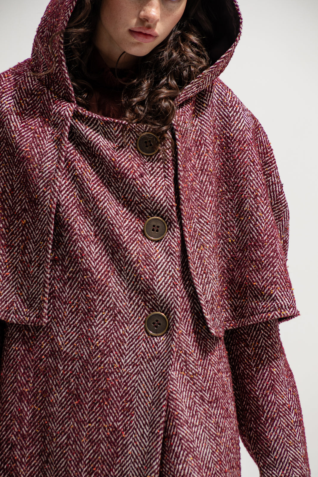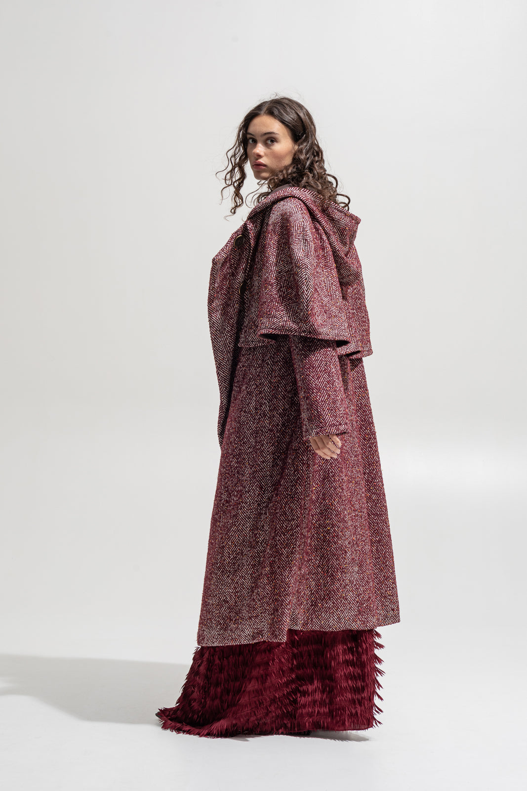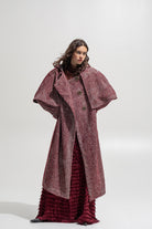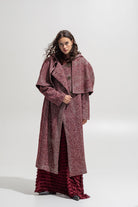 Statement outerwear inspired by timeless tailoring and cinematic drama. This full-length coat is crafted from a rich wool-blend herringbone in deep burgundy tones, featuring a sculptural cape overlay and oversized hood. Designed to move with elegance while exuding strength, it layers perfectly over maxi skirts, lace dresses, or tailored sets from The Jerkins.