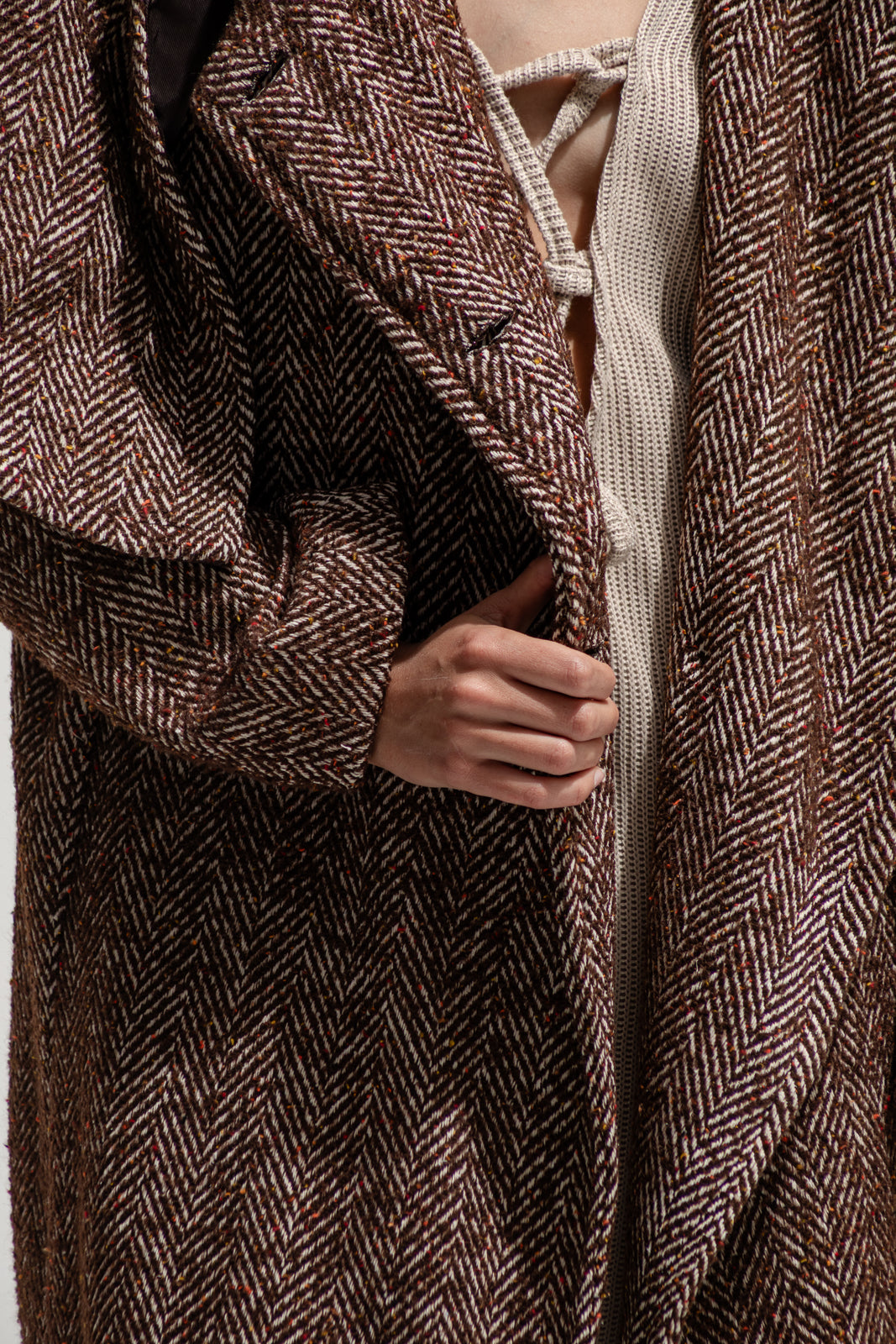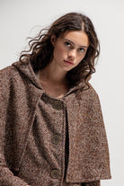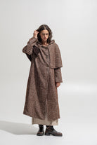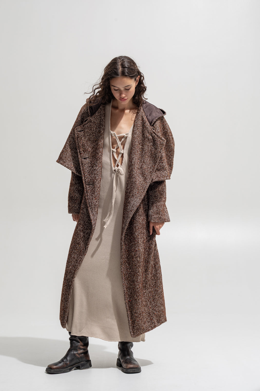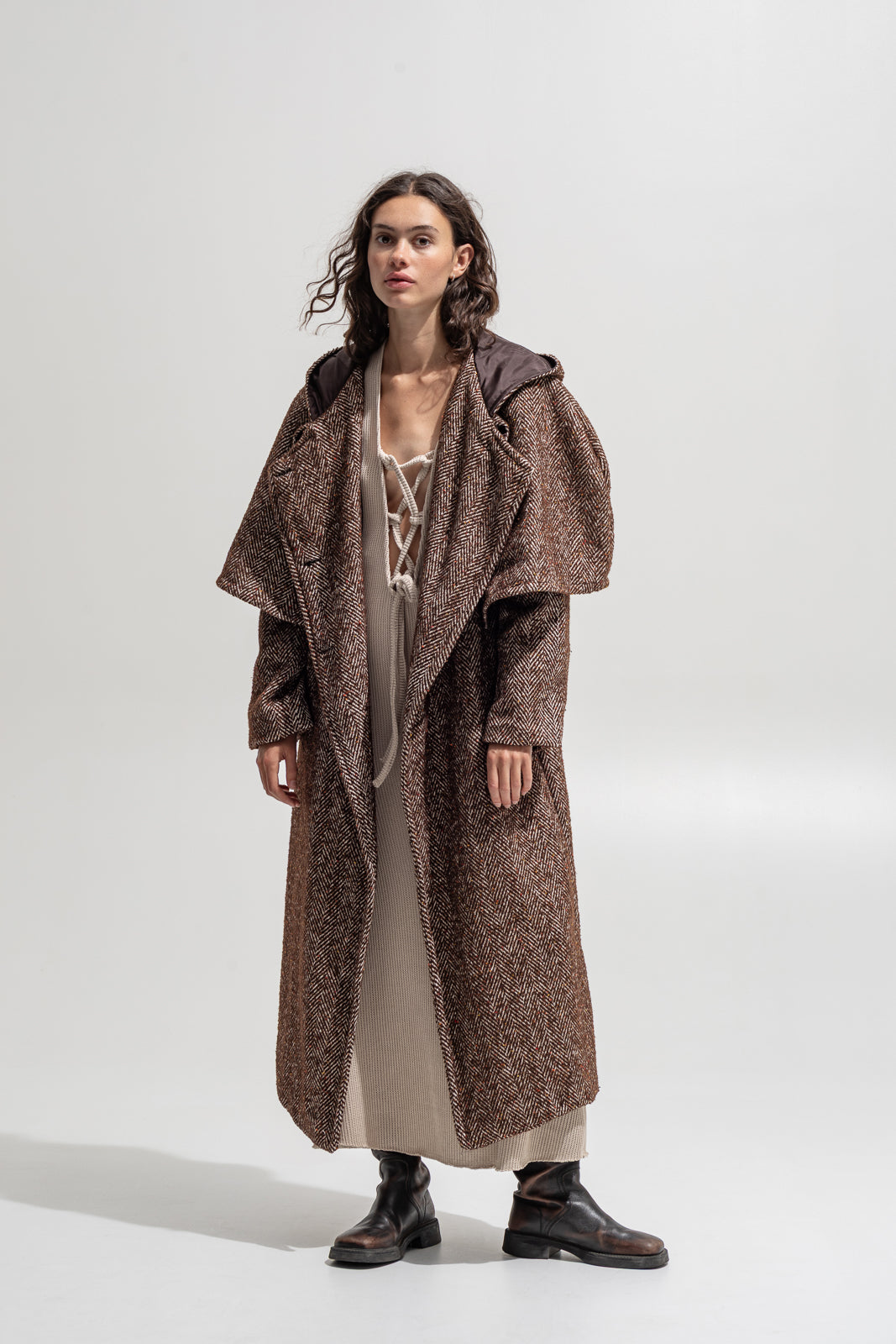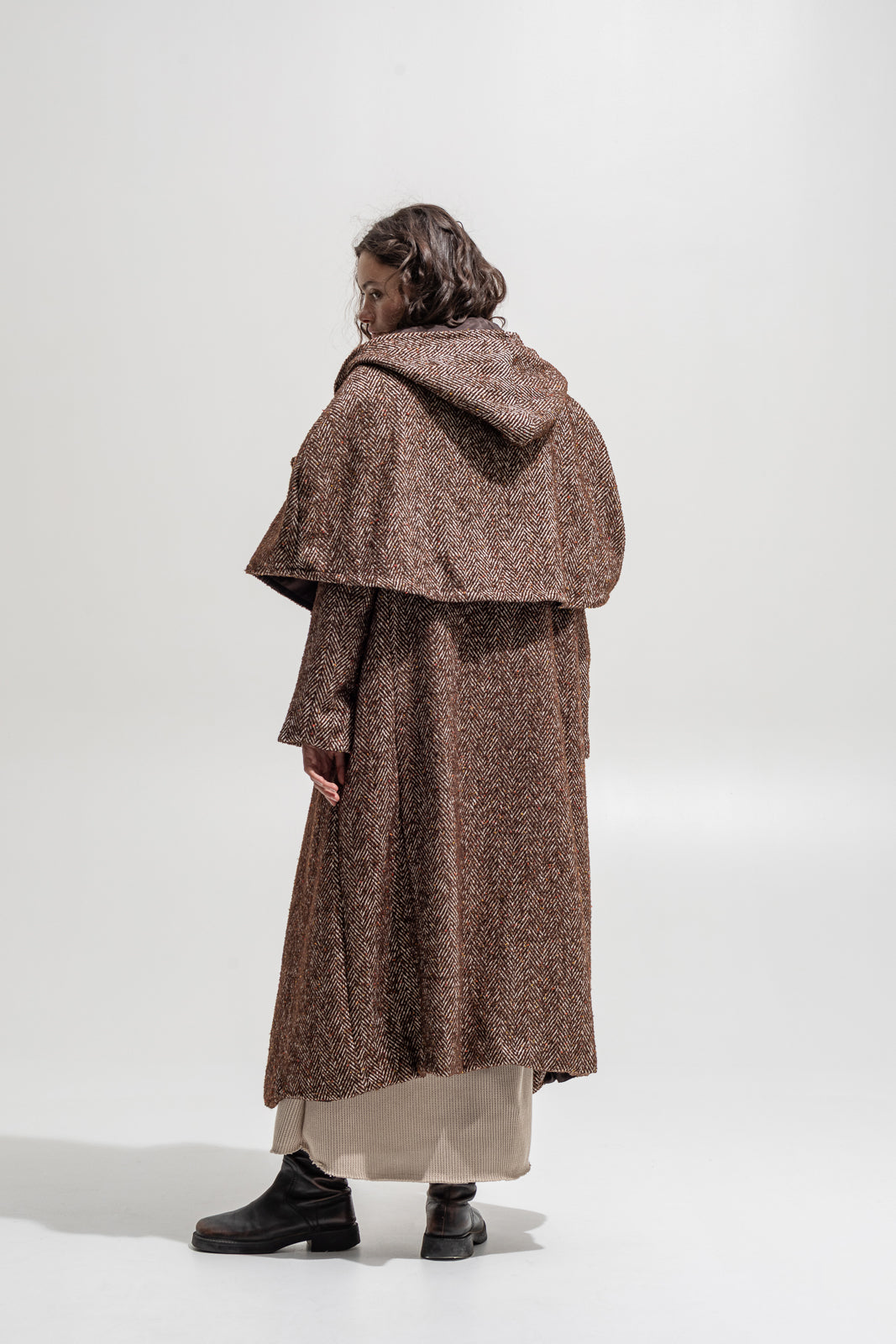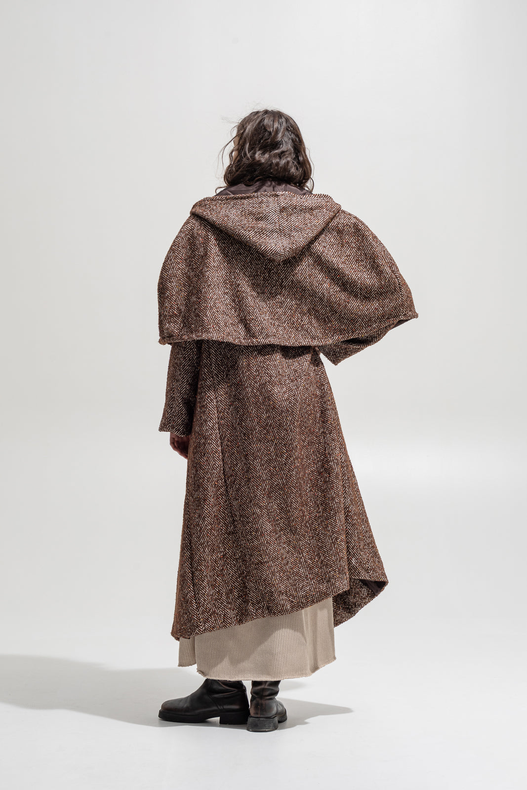 A timeless piece reimagined with The Jerkins’ signature twist. Crafted from rich herringbone wool blend in warm brown tones, this long coat combines vintage tailoring with effortless edge. Featuring a dramatic oversized hood and cape-style overlay, it brings cinematic volume and structure to your winter wardrobe. The wide sleeves and relaxed fit allow for layering over chunky knits or dresses.