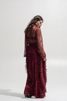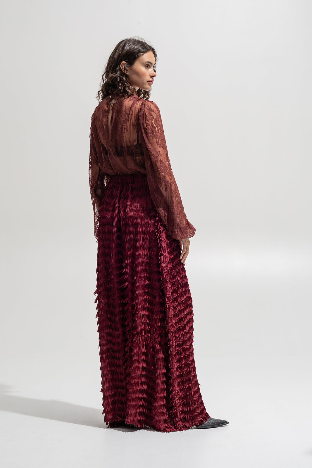 Bold, elegant, and effortlessly fluid — this full-length skirt stands out in deep burgundy tones with a tactile pleated texture. The rich fabric creates movement and dimension, catching the light as you walk. Designed with a satin waistband that defines the silhouette, it flows beautifully for both evening and statement daywear looks. Pair it with lace tops, corsets, or structured jackets from The Jerkins for a striking ensemble.