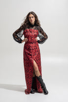 Made from heavy jacquard fabric in deep red and black paisley, this long dress sculpts the silhouette while catching the light with every step.