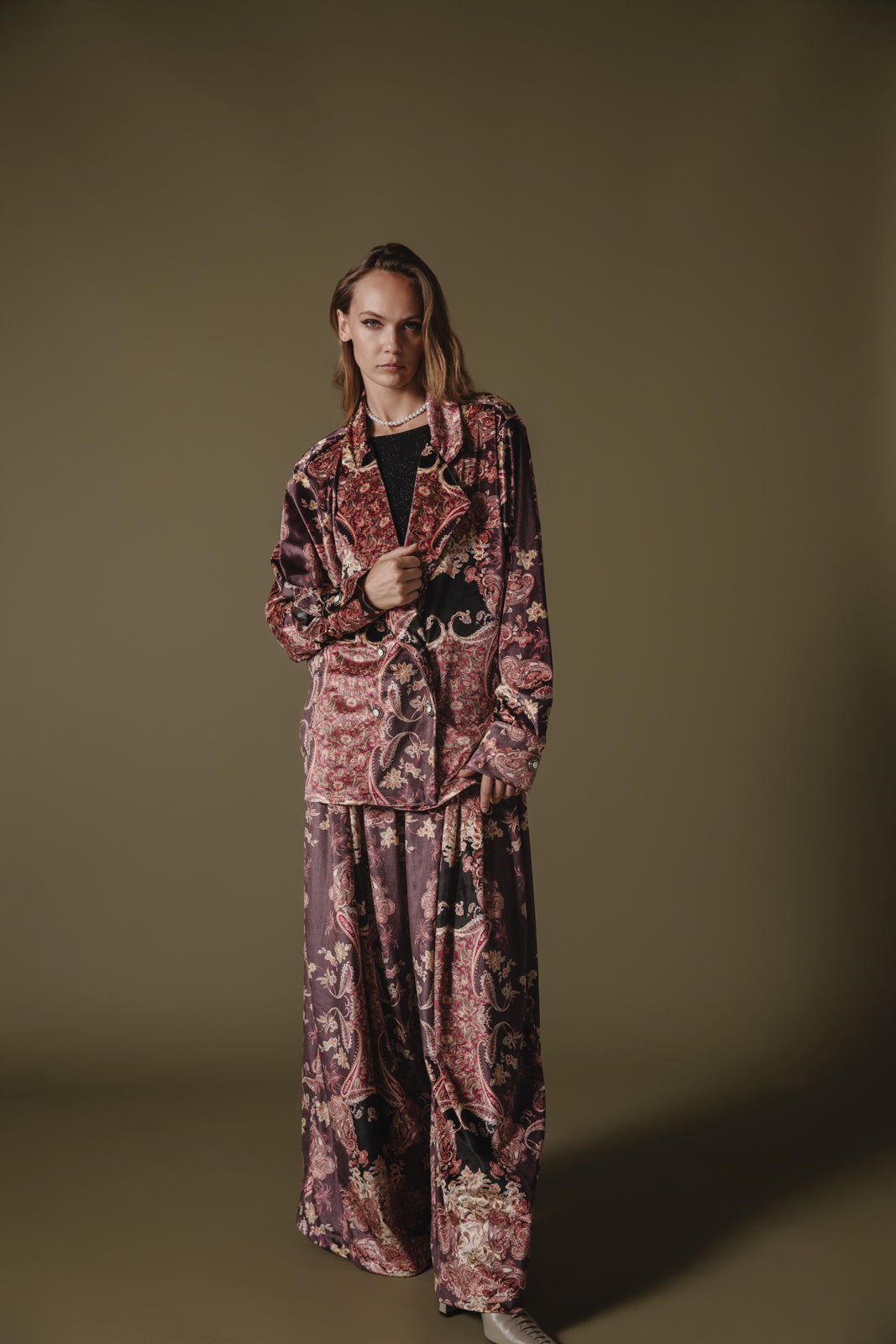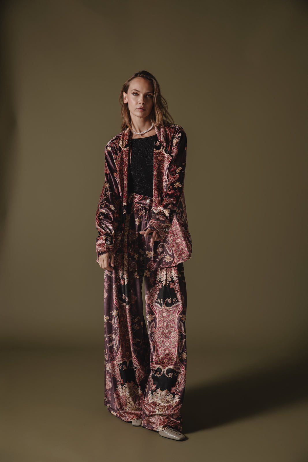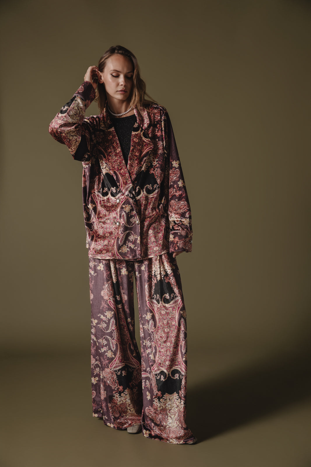 Elevate your wardrobe with this luxurious velvet blazer, featuring an intricate tapestry-inspired pattern in rich tones of bordeaux, black, and muted gold. With a relaxed, slightly oversized fit and a double-breasted front, it combines elegance with an effortlessly comfortable feel. Perfect for layering, this blazer is ideal for both casual and formal occasions, adding a touch of opulence to any outfit.