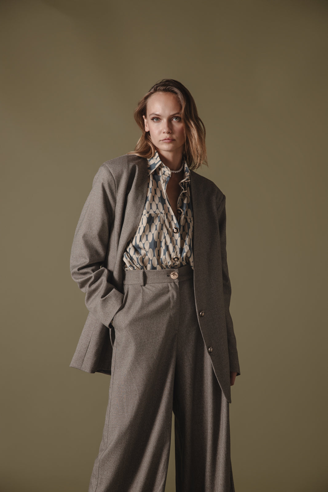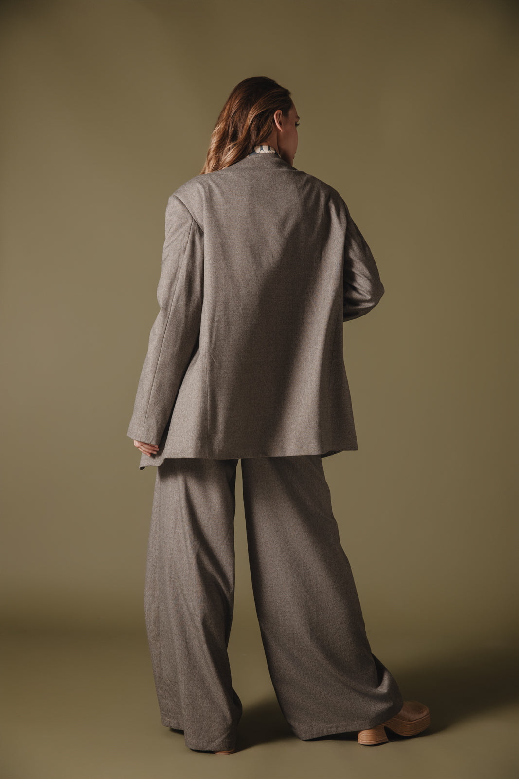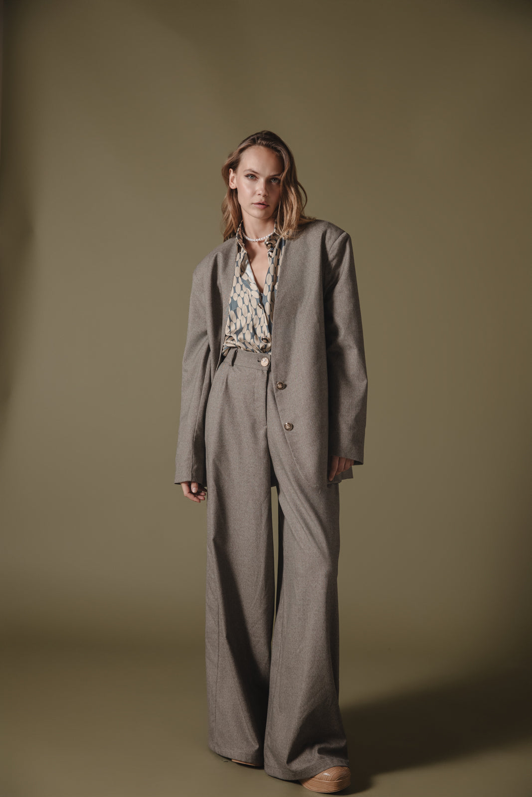 This oversized beige blazer offers a modern, structured silhouette with a relaxed fit. Tailored from premium fabric, it features classic notched lapels and a single-button closure, making it a versatile piece that easily transitions from office wear to casual outings. The blazer's longline cut and subtle shoulder structure create a sophisticated yet comfortable look. Ideal for layering over shirts, turtlenecks, or sweaters, this timeless blazer brings a chic, professional touch to any outfit.