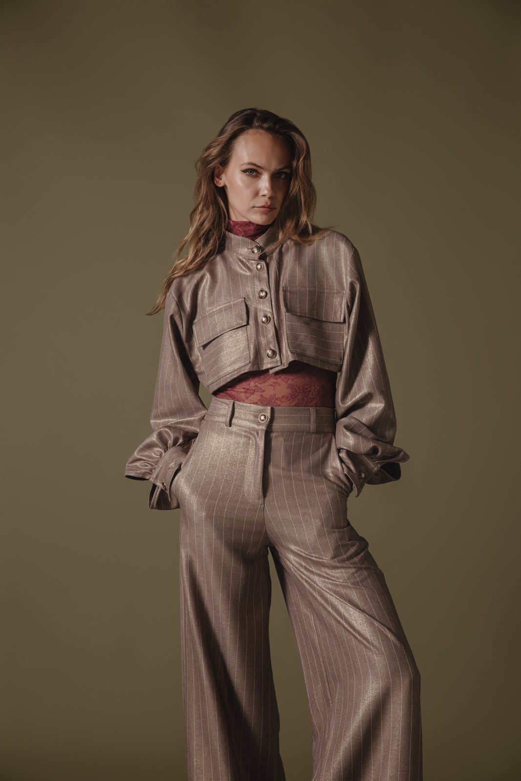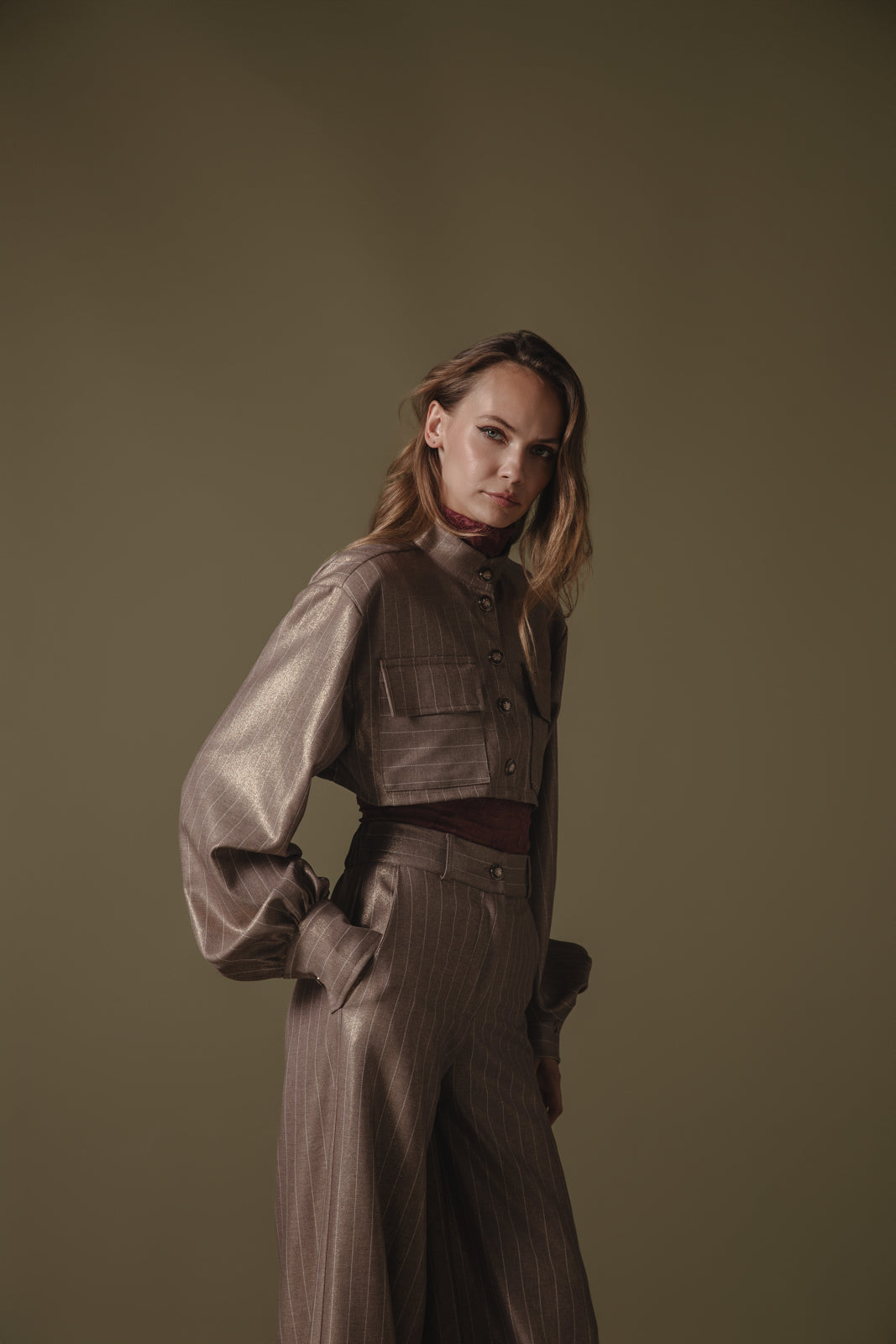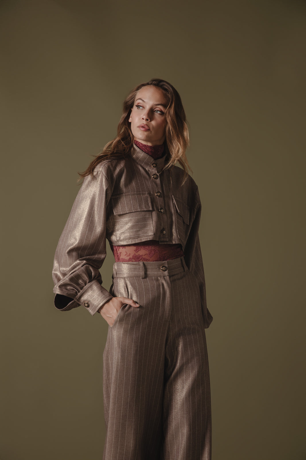Chic cropped jacket-style shirt with a structured silhouette and subtle metallic pinstripes. Features include an elegant high collar, oversized front pockets, and voluminous sleeves with buttoned cuffs. Perfectly pairs with high-waisted trousers for a sophisticated, modern look.