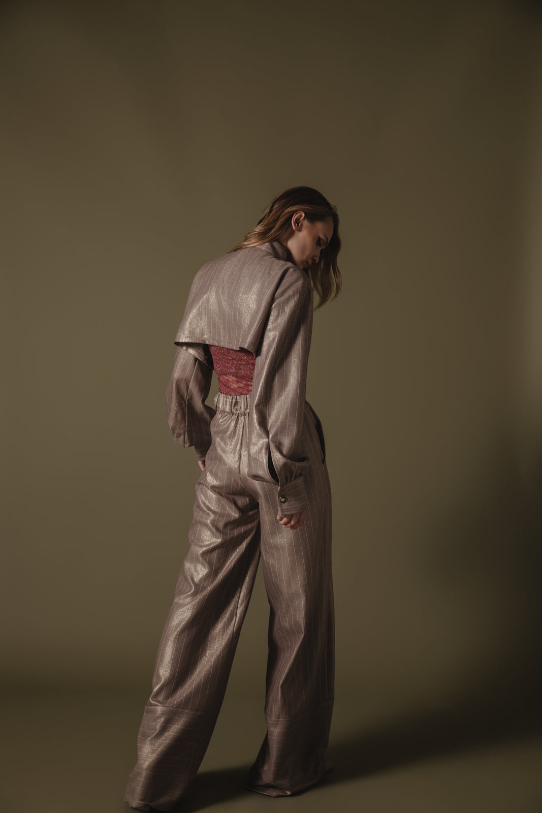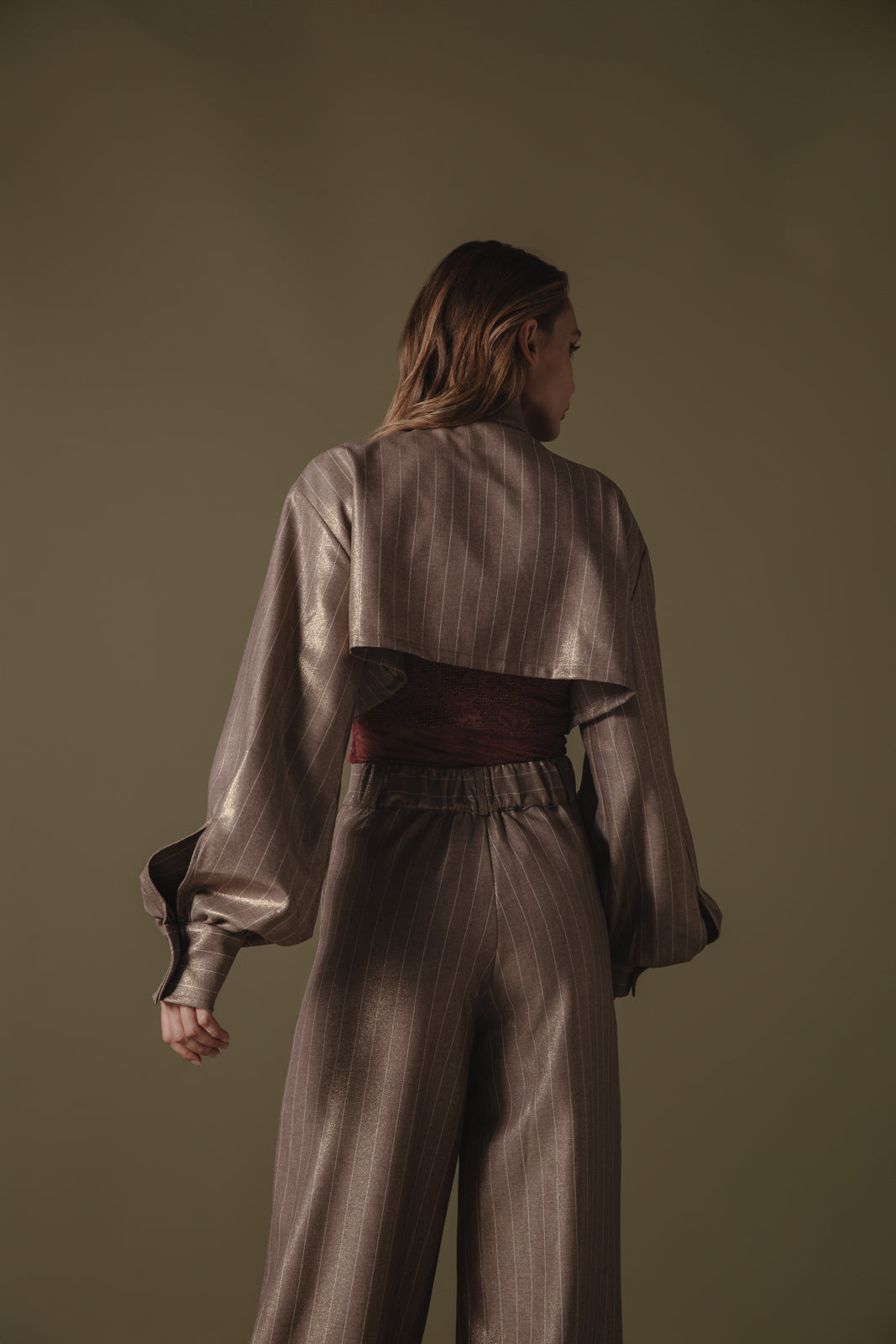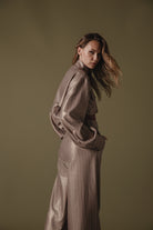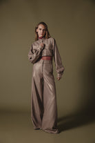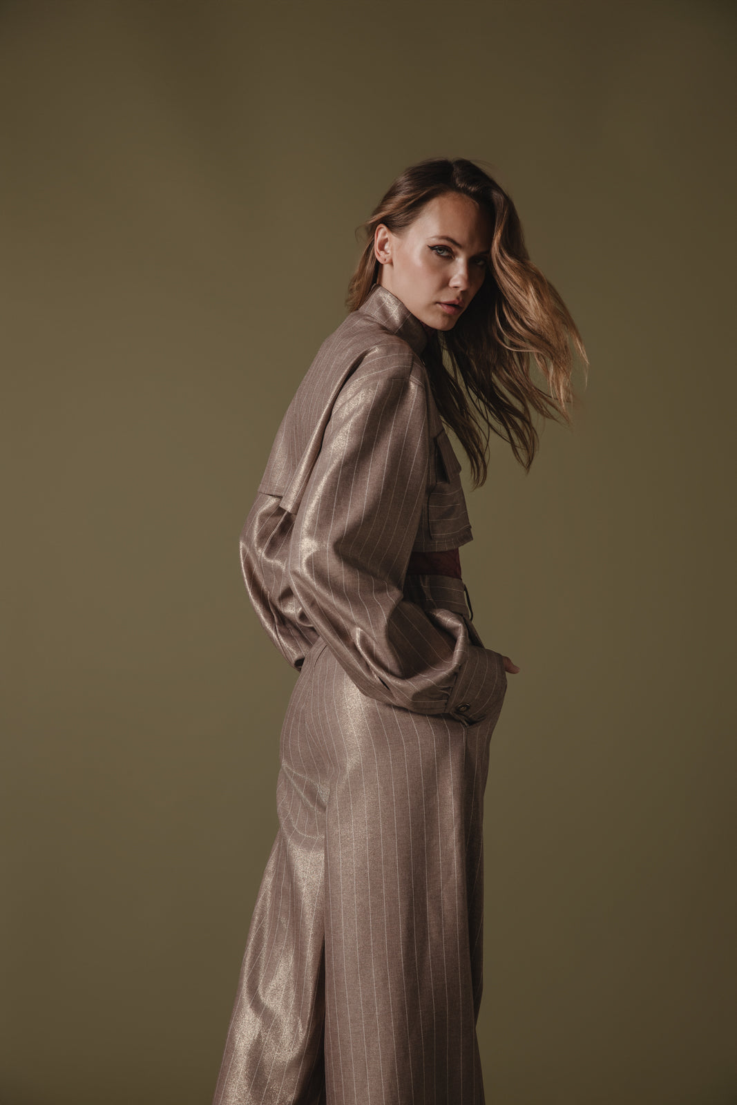 Chic cropped jacket-style shirt with a structured silhouette and subtle metallic pinstripes. Features include an elegant high collar, oversized front pockets, and voluminous sleeves with buttoned cuffs. Perfectly pairs with high-waisted trousers for a sophisticated, modern look.