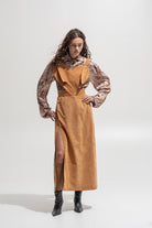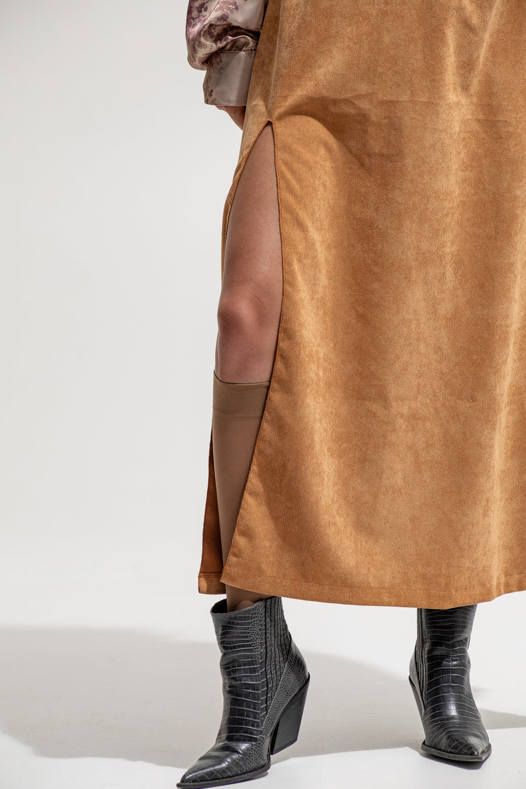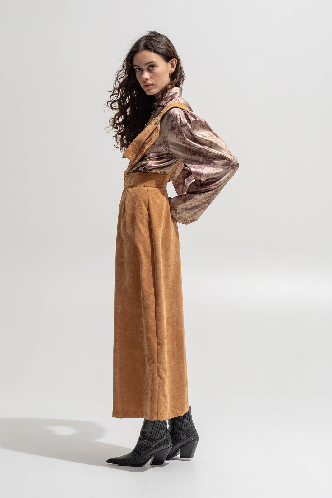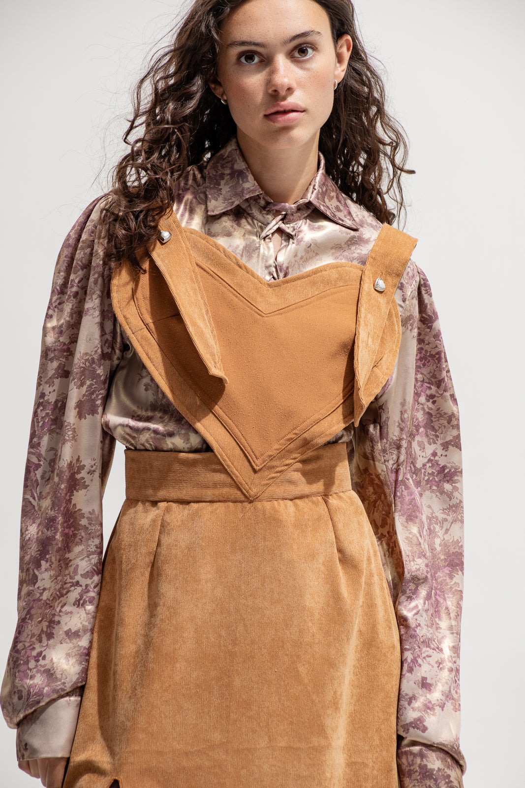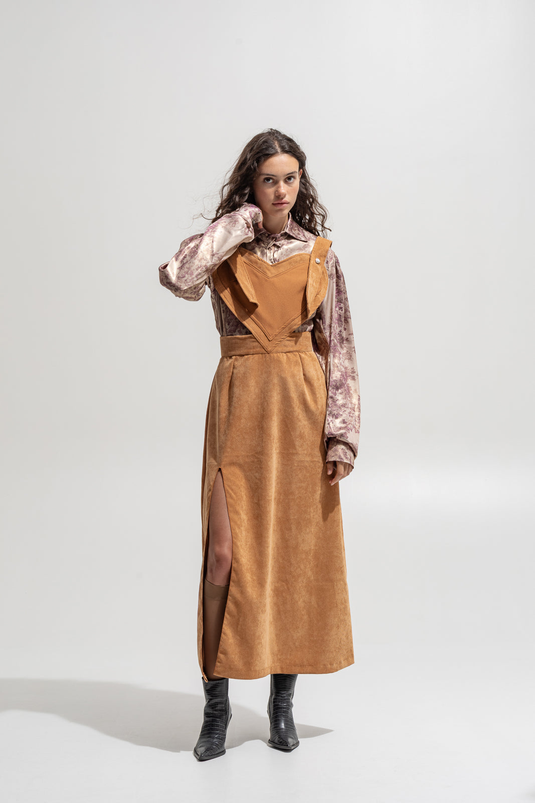 A modern take on vintage workwear, this overall-inspired skirt blends soft structure with feminine charm. Cut from plush camel corduroy, it features a sculpted heart-shaped bib, wide straps with metal heart studs and a high waist that elongates the silhouette. The long A-line shape falls effortlessly over the body, while the side slit adds just the right amount of movement.