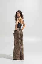 Strike a bold silhouette with these wide-leg leopard print pants, crafted in a statement metallic-effect fabric. Designed with a high waist, structured pleats, and a relaxed oversized fit, they blend fierce energy with effortless sophistication. The golden-tone button detail adds a luxe touch, making them the ultimate power piece for both day-to-night styling.