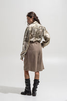 These high-waisted wool-blend bermudas redefine structured comfort — crafted in warm beige herringbone with subtle black specks and soft pleats at the front. Designed to sit at the waist with a relaxed leg, they bring that effortless balance between refined and raw. Pair them with the matching jacket or a satin shirt for the ultimate gang uniform look.