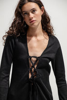 A minimal piece with a striking twist — this maxi knitted dress in forever black offers both comfort and edge. Featuring a plunging neckline with bold lace-up rope detail and slightly flared sleeves, it combines laid-back ease with contemporary allure. The ribbed knit fabric sculpts the silhouette while keeping it casual and wearable.