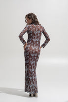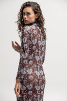 This mesh floral dress combines burgundy and ice-blue tones in a soft transparent fabric that follows the body’s lines with subtle stretch.