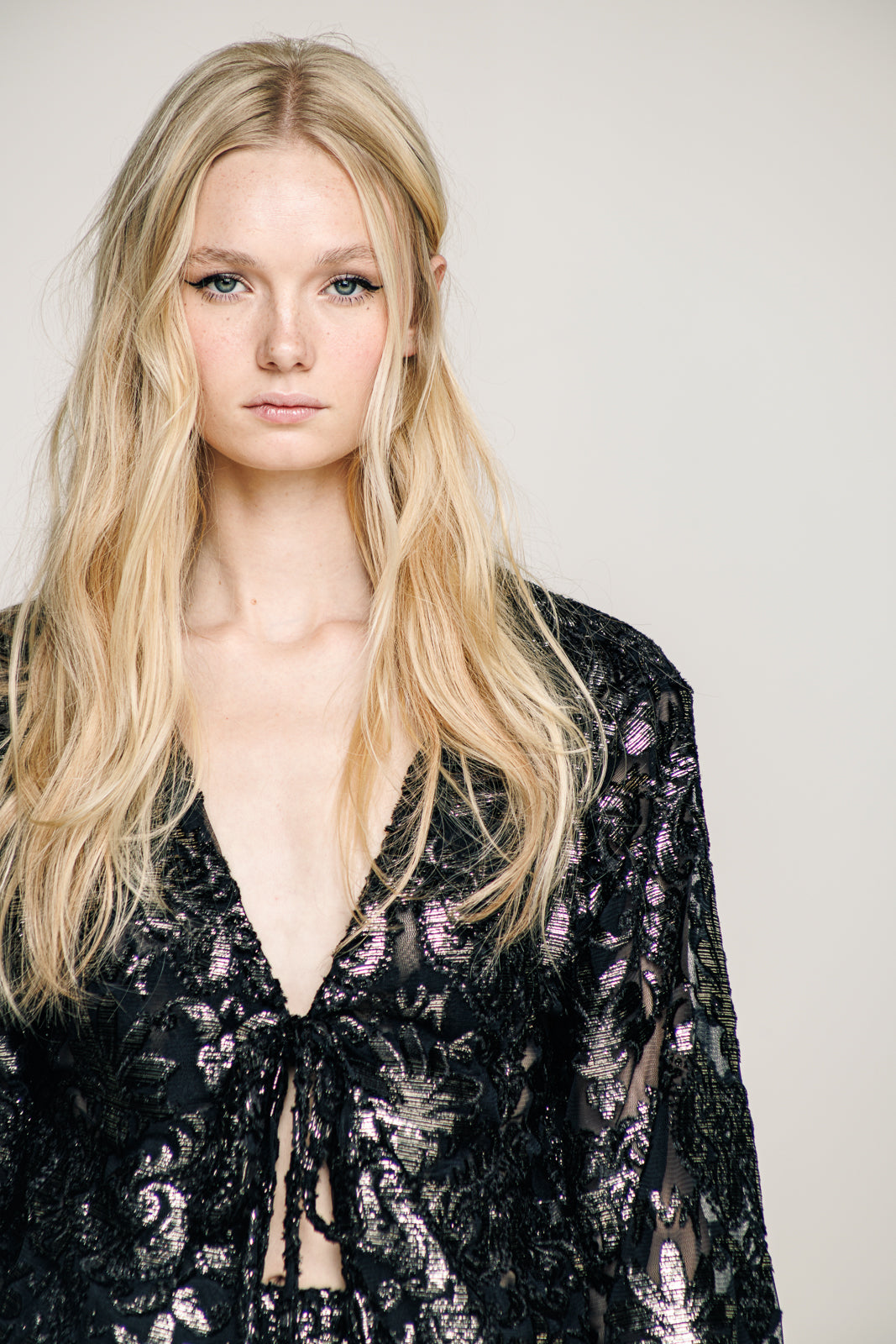A sheer, statement-making shirt designed to captivate. Crafted from richly embroidered black lace with gold metallic accents, it features a deep V neckline and a tie-front closure that adds an effortless sensuality. The fluid drape and soft volume of the sleeves create movement with every step, while the intricate texture elevates it into a true night-out piece. Feminine, dramatic and unmistakably Jerkins.