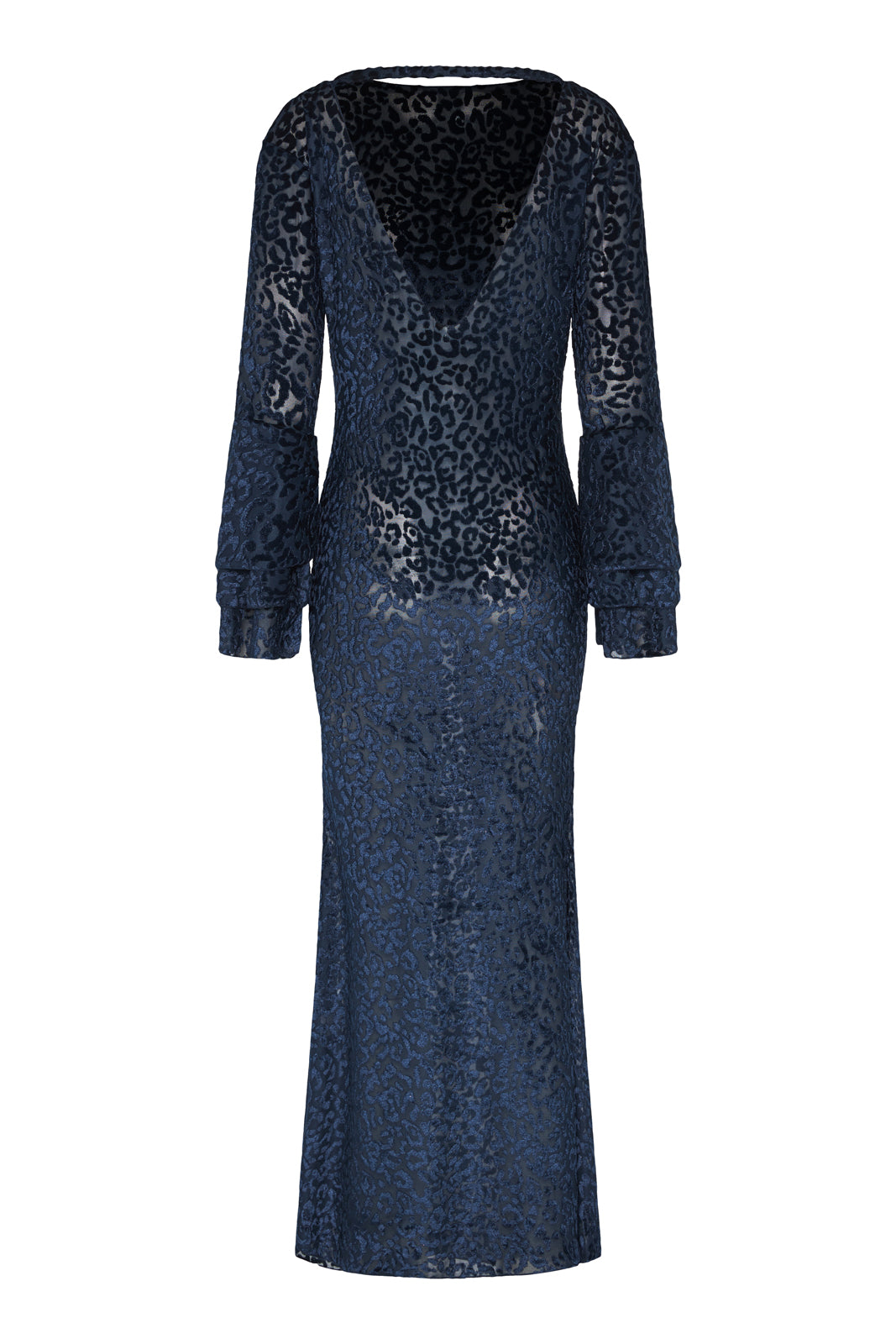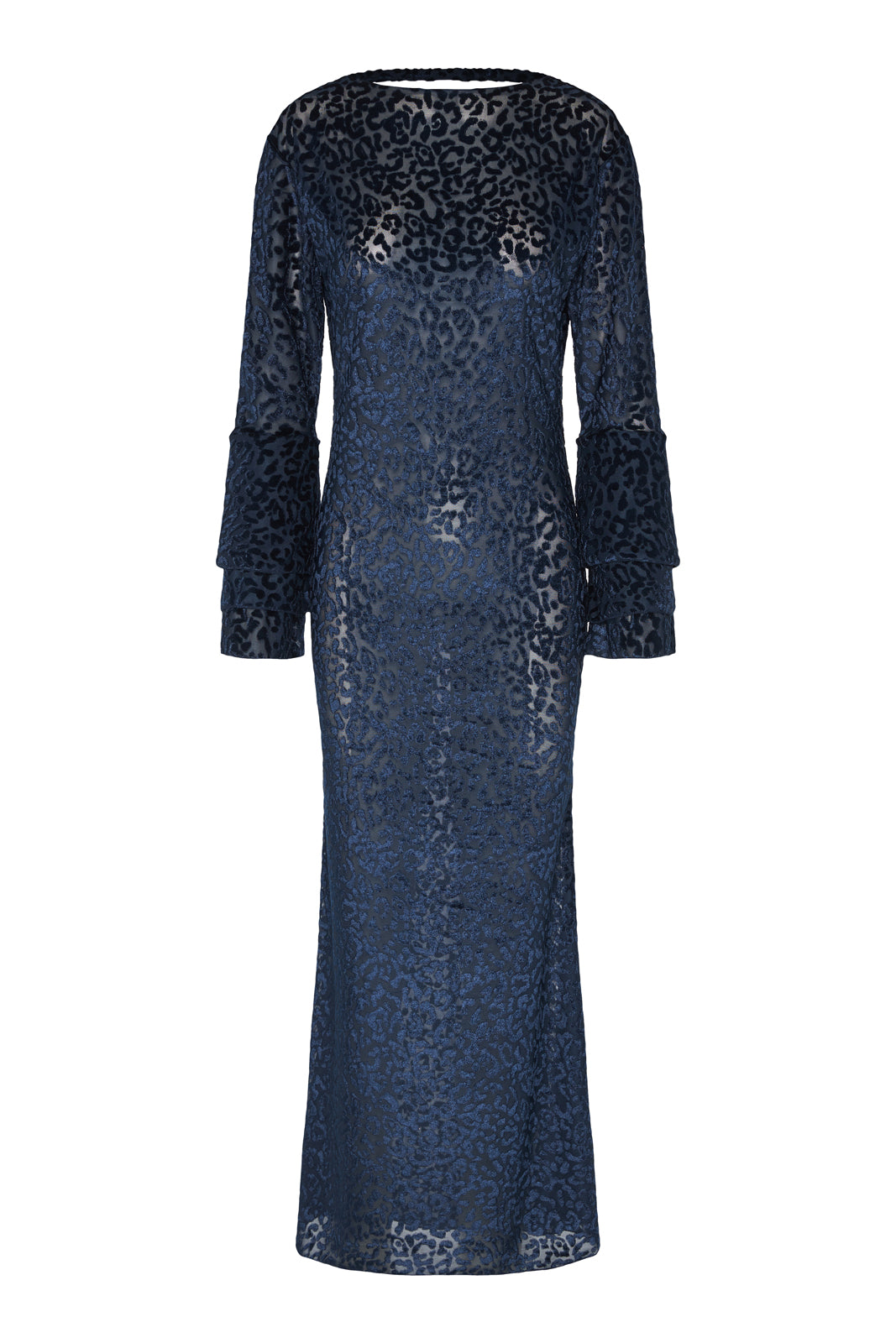 Turn heads in this stunning maxi dress featured in a lovely glitter lace fabrication with minimal lining, slightly puffed sleeves, and super exposed back for added dimension.