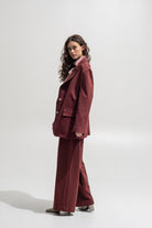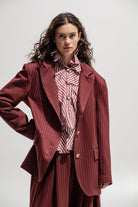 Redefine tailoring with this oversized pinstripe blazer in warm bordeaux tones. Crafted with a structured silhouette and sharp lapels, it features flap pockets, statement engraved buttons, and subtle vertical stripes that elongate the figure. Designed to blur the lines between masculine edge and feminine ease, it pairs perfectly with wide-leg trousers for a bold suit look, or over dresses and denim for effortless layering.
