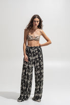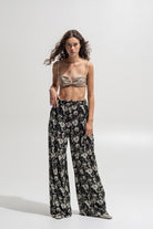 Cut from soft embossed velvet in black and silver-grey floral tones, they feature a high waist with a soft elastic back, gold-button detailing, and a wide flowing silhouette.