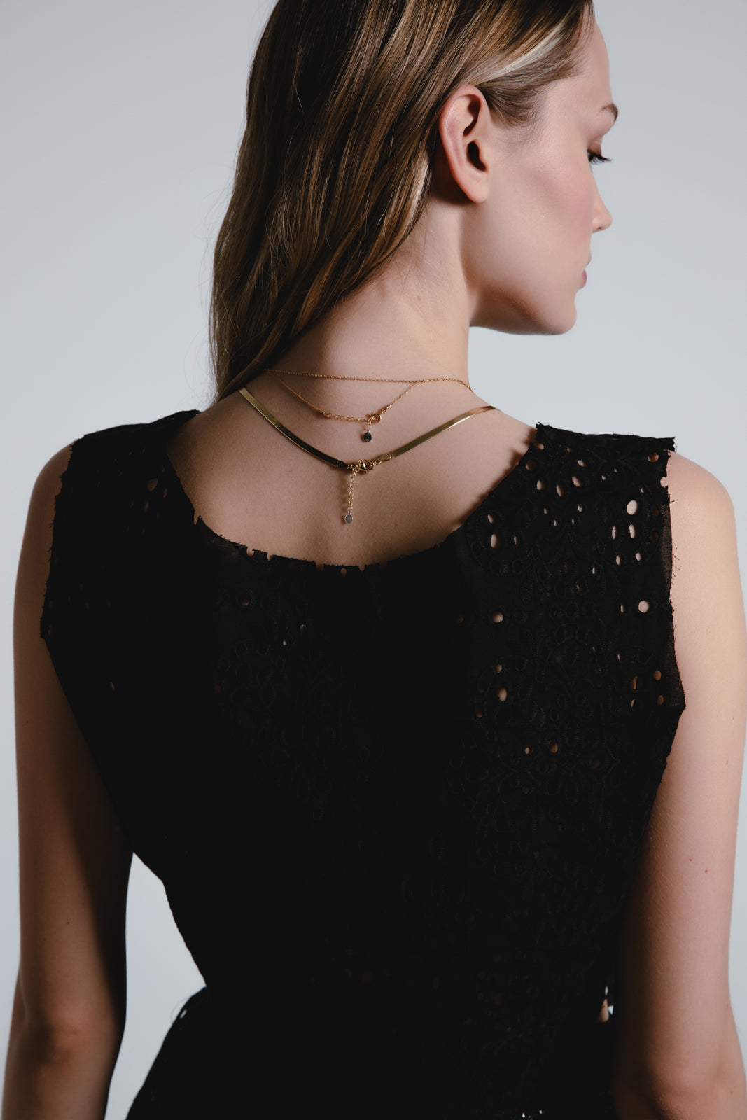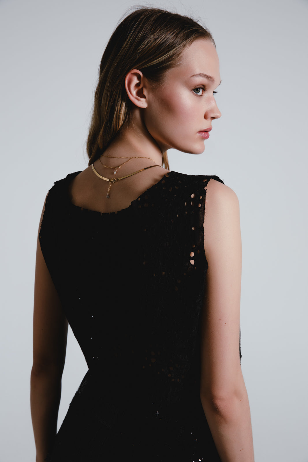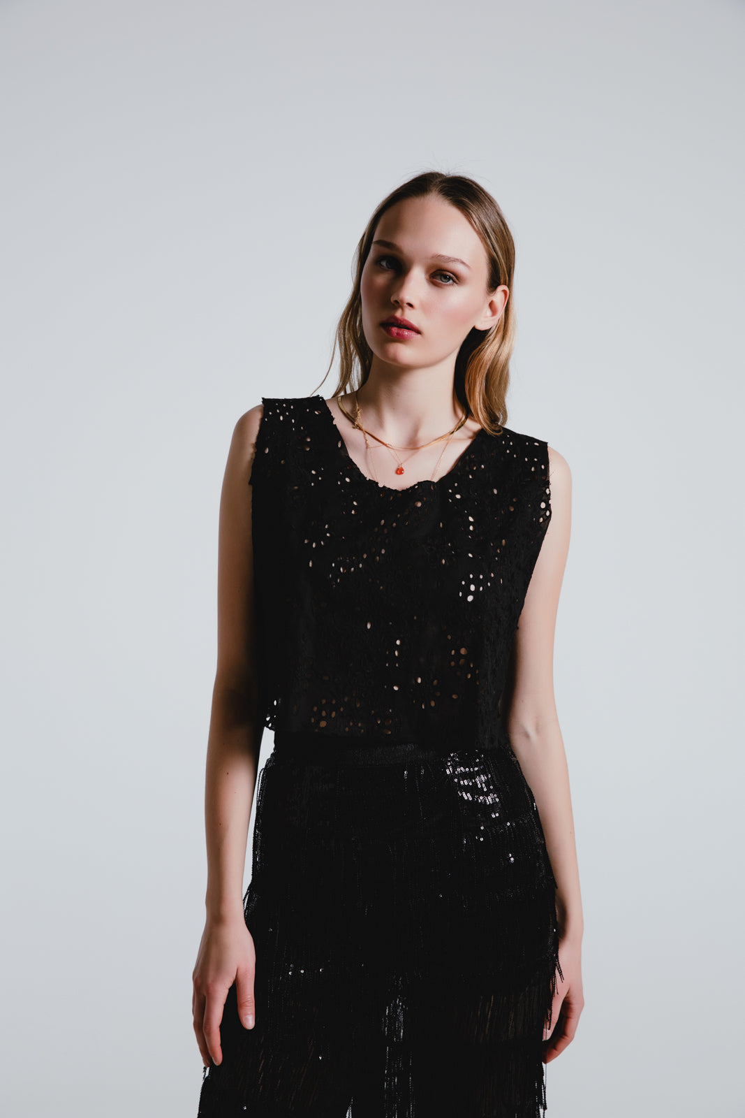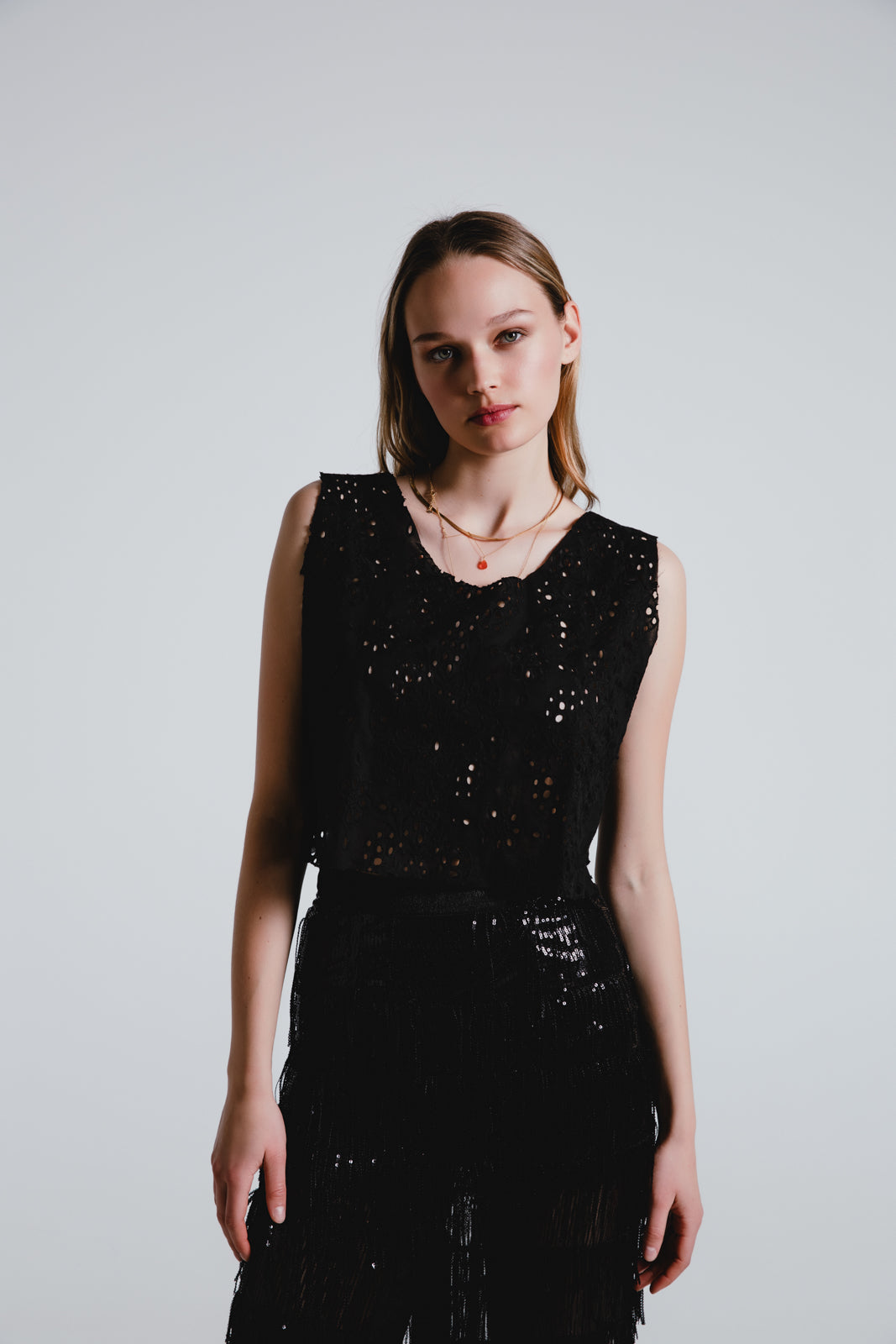 This is a vibrant, cropped cotton lace top in all time classic black. The lace features a leaf-like pattern with cut-outs that give it a semi-sheer appearance. It’s sleeveless, with a scalloped hem that adds to the delicate nature of the lace. This piece combines femininity and boldness, making it suitable for layering or wearing on its own for a statement look.