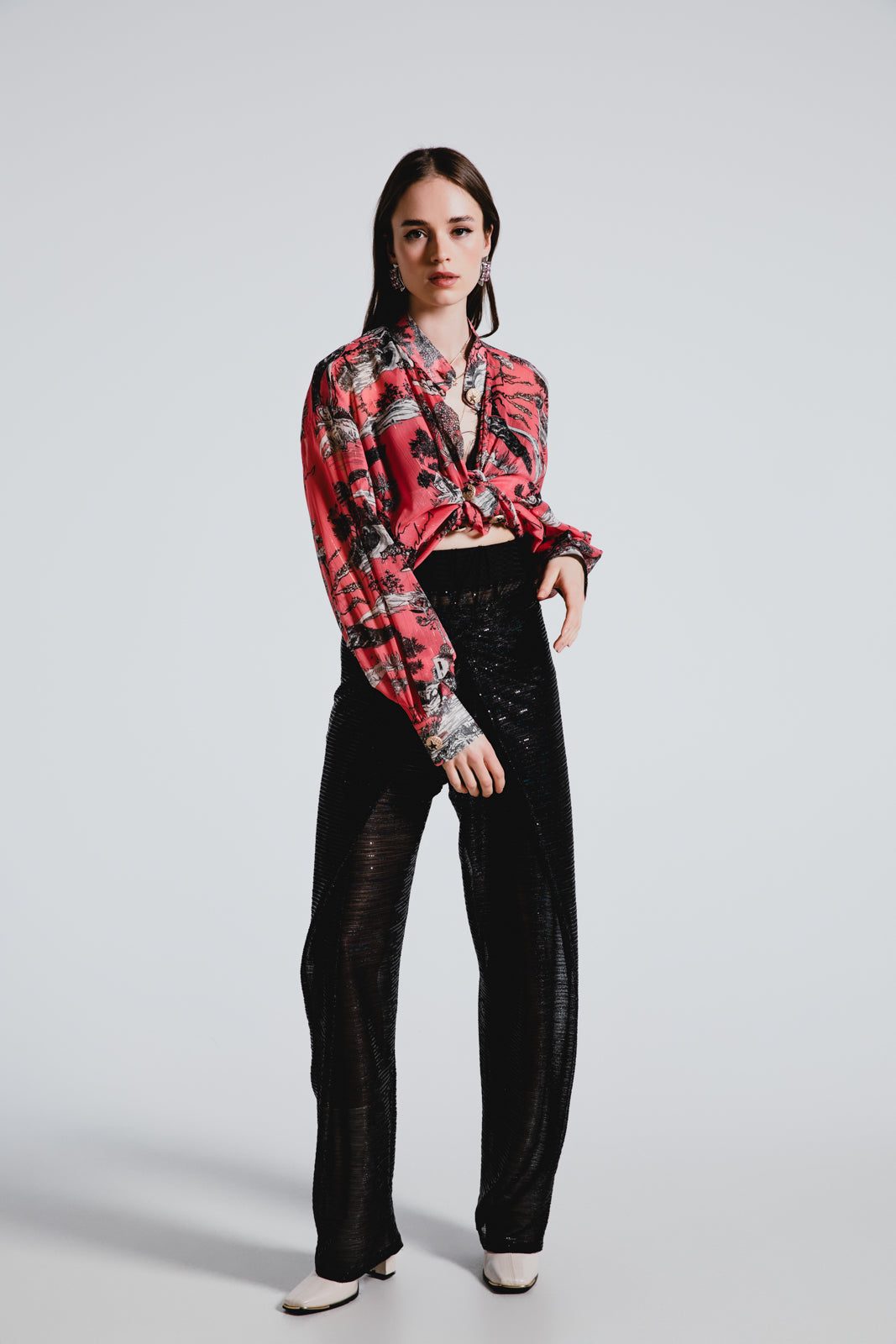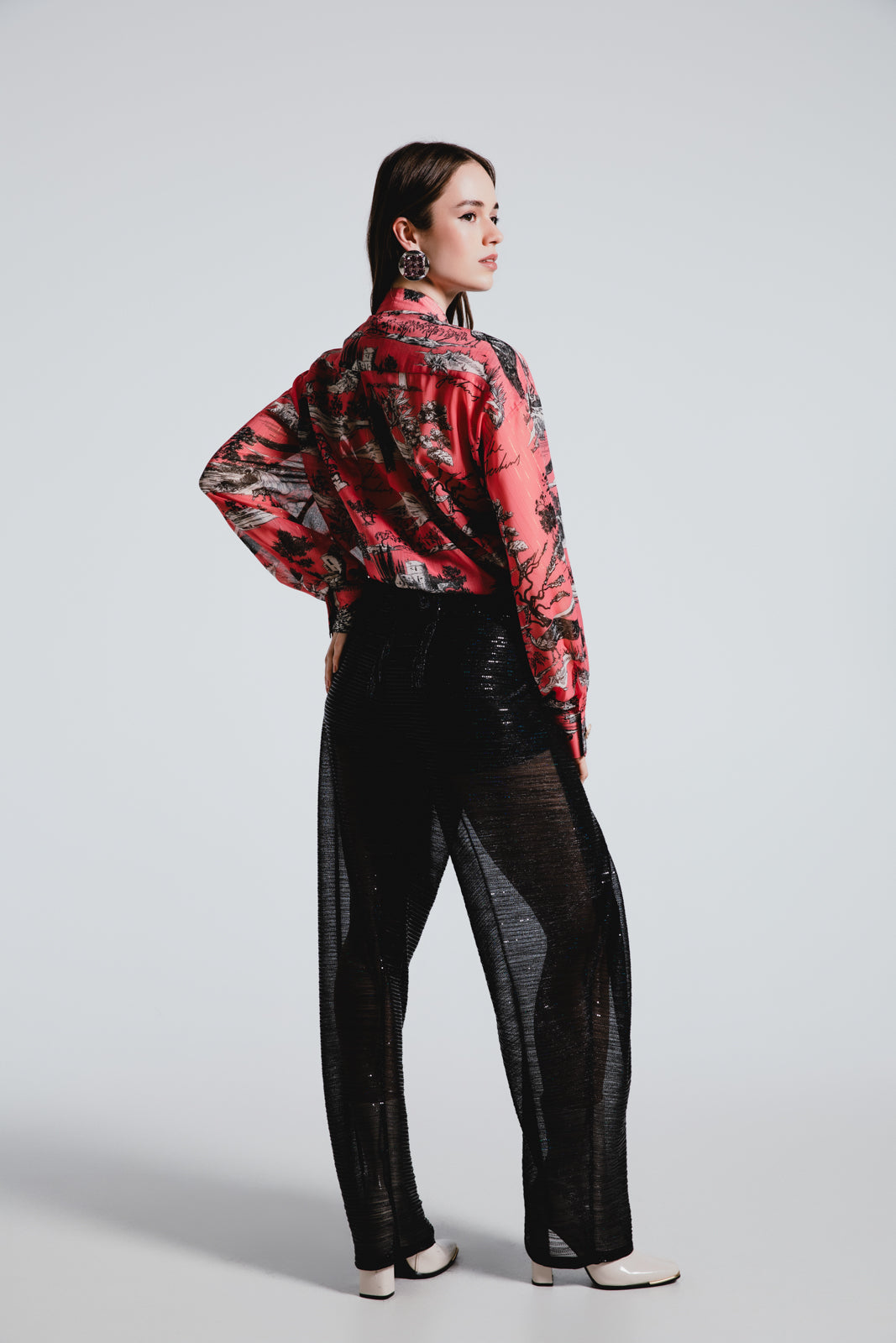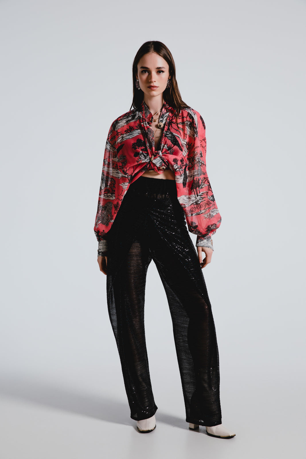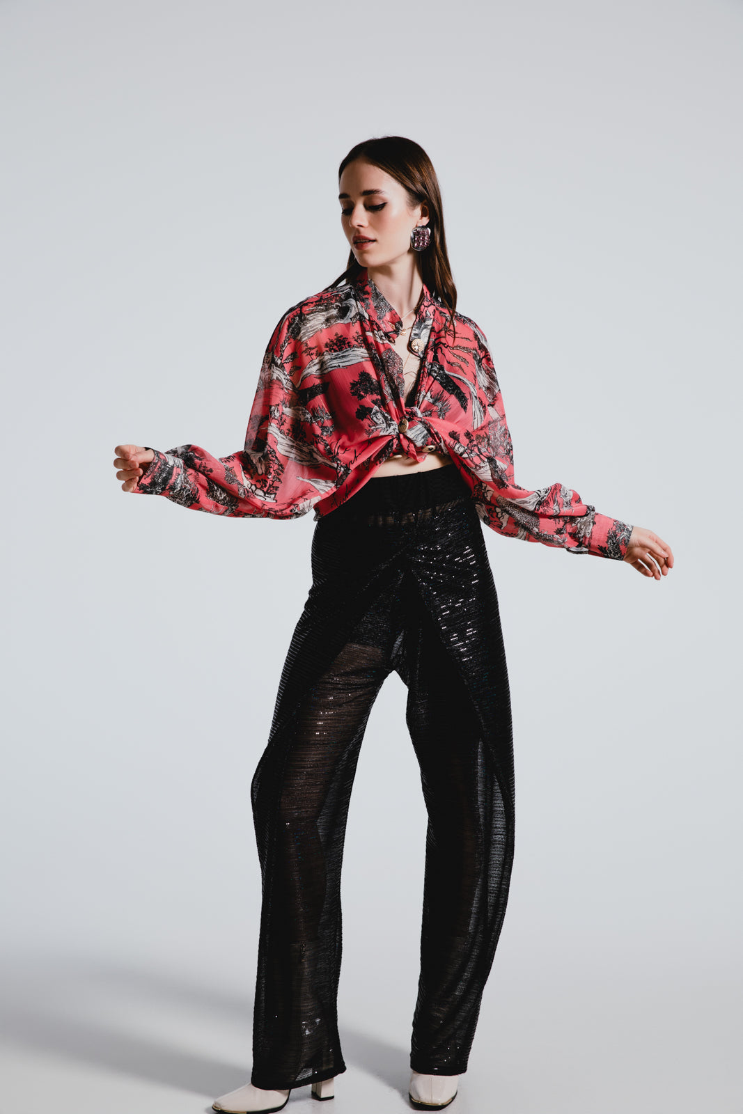 Glimmer with every step in our Wrap Sequined Transparent Pants. A masterpiece of design that pairs a bold silhouette with a whisper of allure, perfect for making a glamorous, yet tastefully daring statement.
