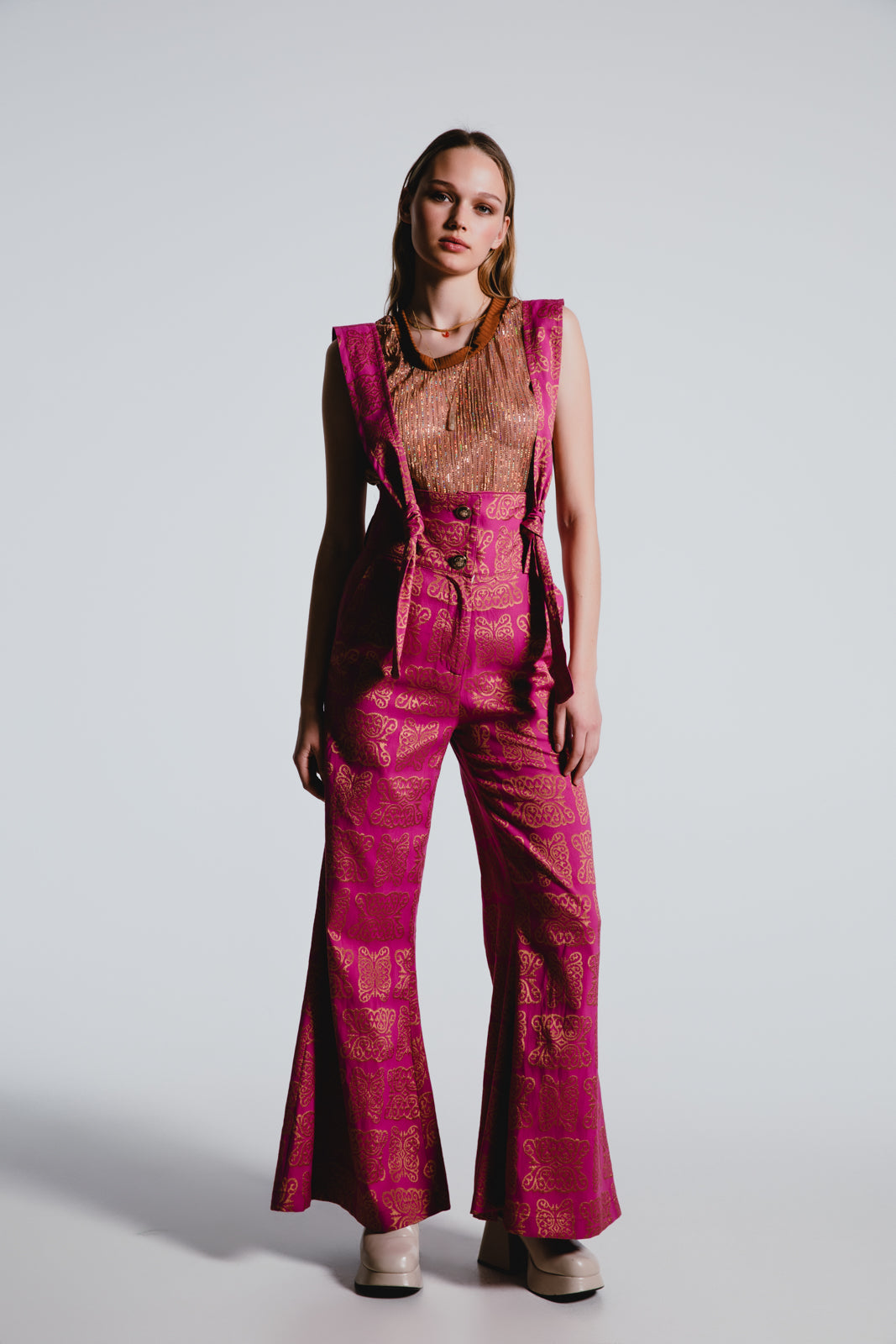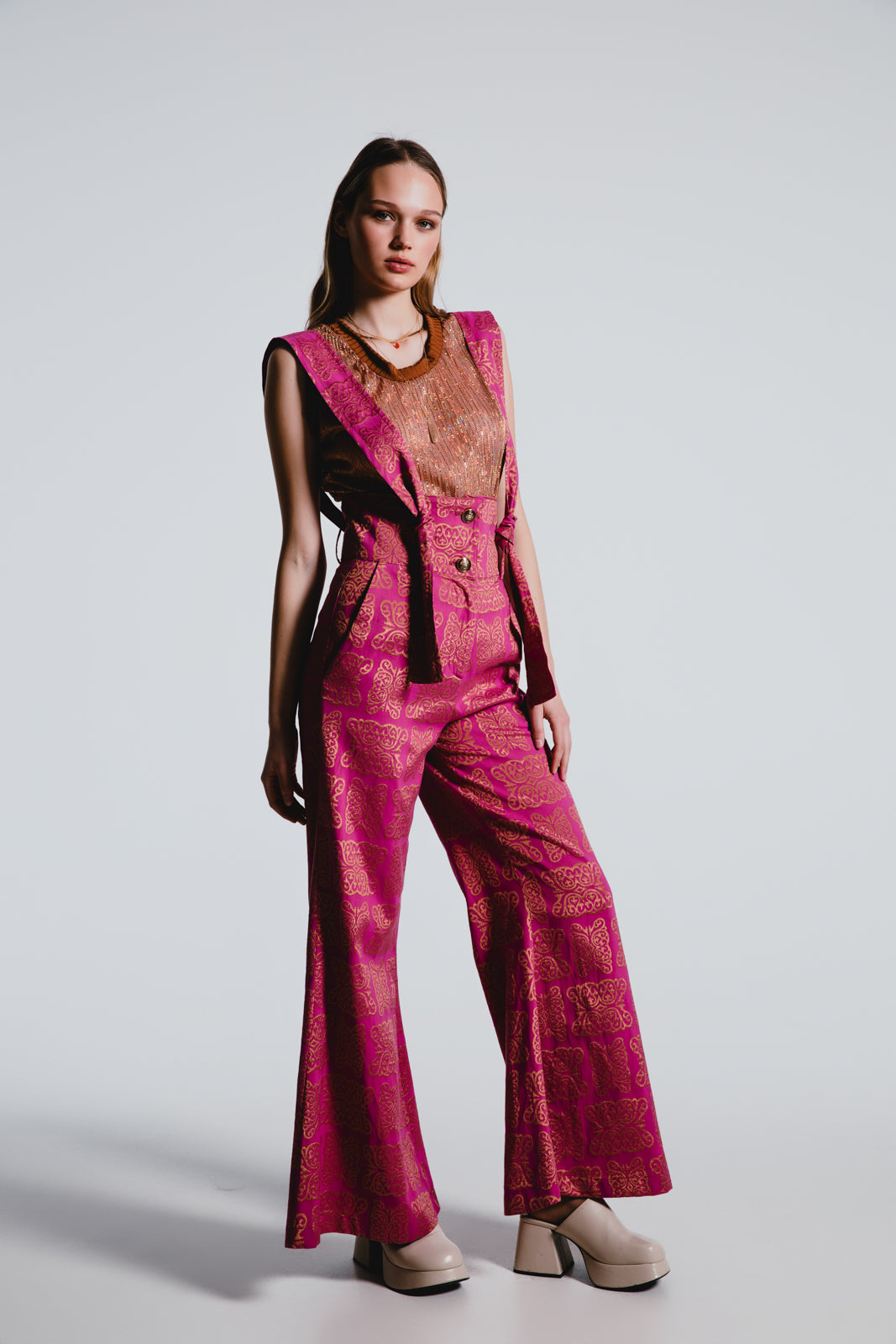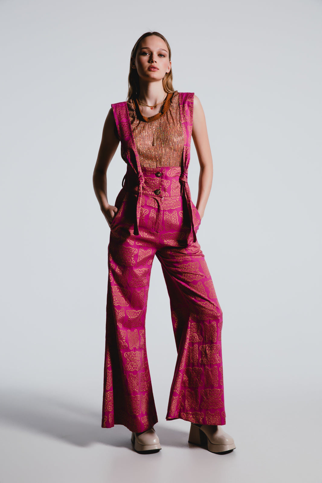 Make a bold statement with our Fuchsia Brocade Trousers, where vintage glamour meets contemporary style. The luxurious pattern infuses your wardrobe with a dash of royal elegance.