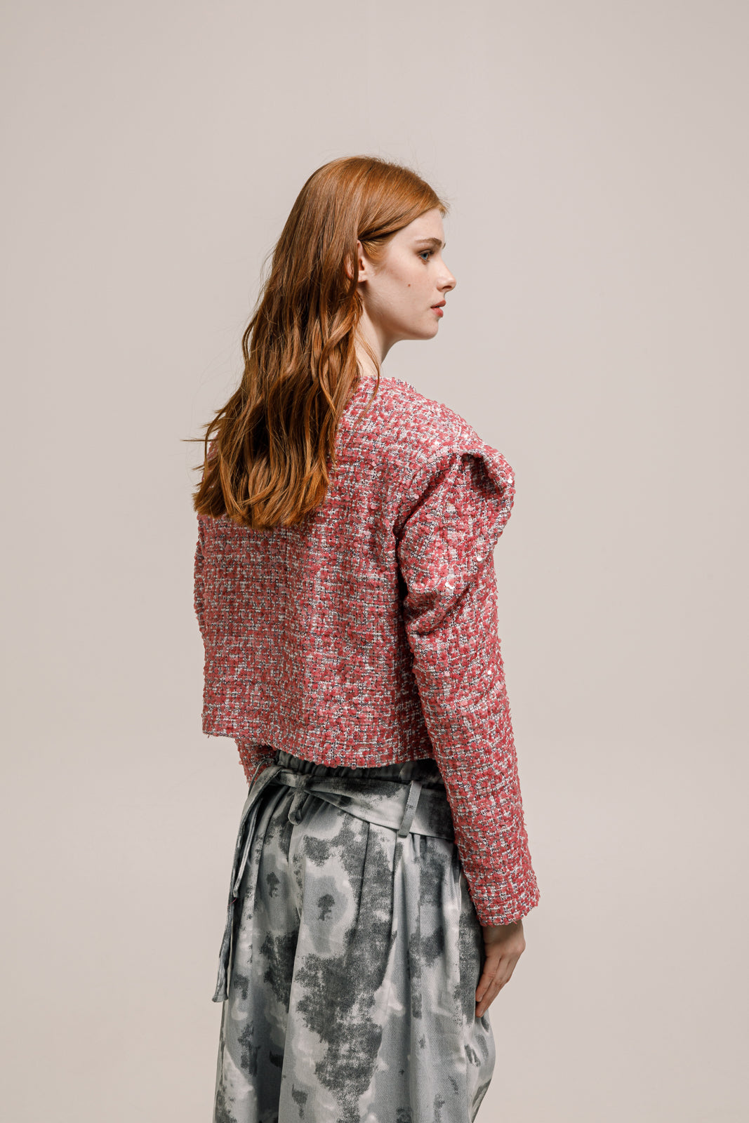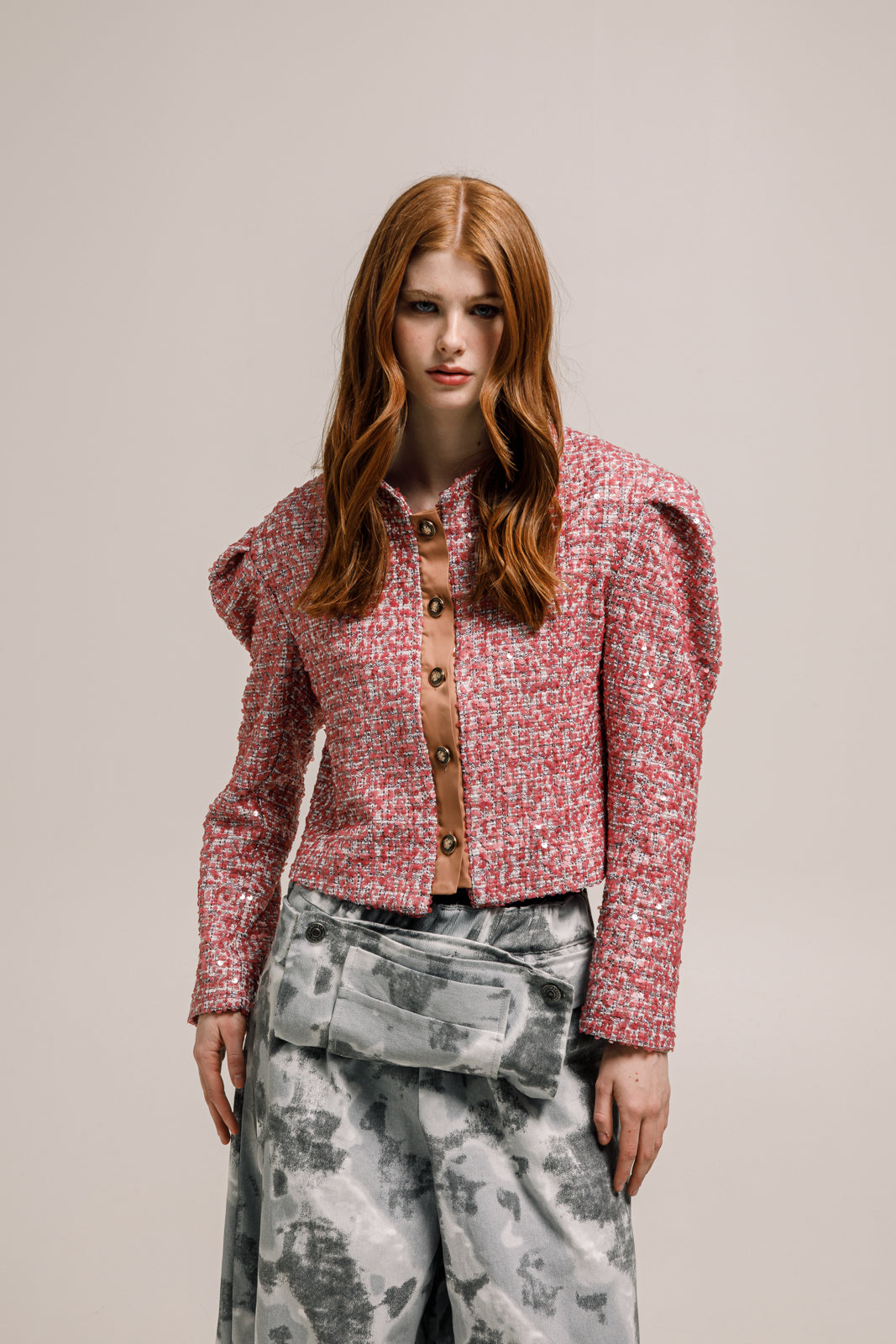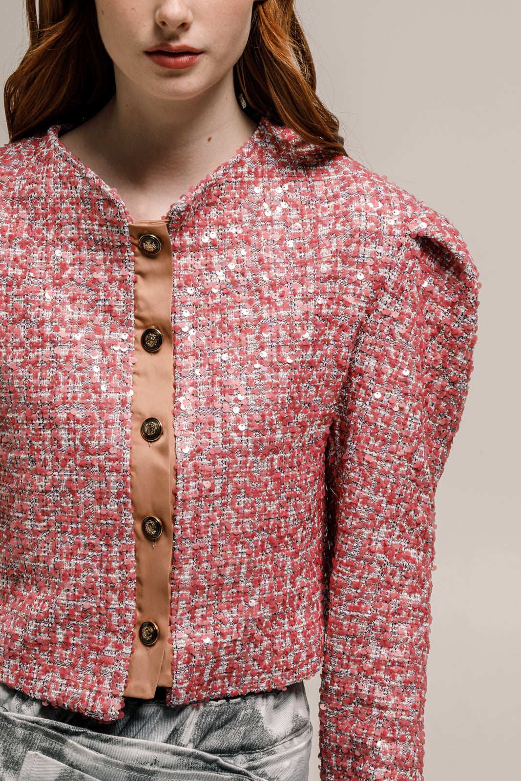 The Sabu Cropped Blazer in Sequined Coral is a standout piece designed to add a touch of glamour to your wardrobe. This blazer features a shimmering mint-colored sequin fabric that catches the light beautifully, making it perfect for evening events or special occasions. The cropped design offers a modern silhouette, ideal for pairing with high-waisted trousers or skirts. This blazer reflects quality craftsmanship and attention to detail. Elevate your style with this dazzling blazer that effortlessly combines sophistication and sparkle.