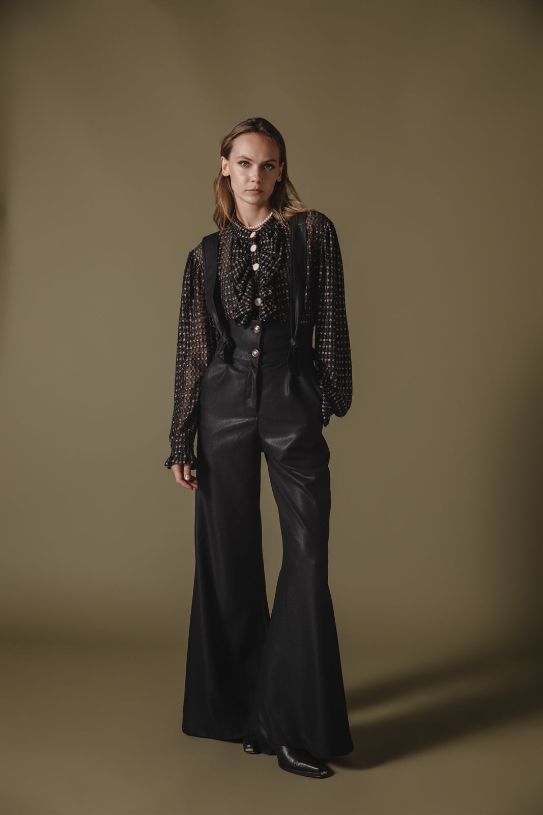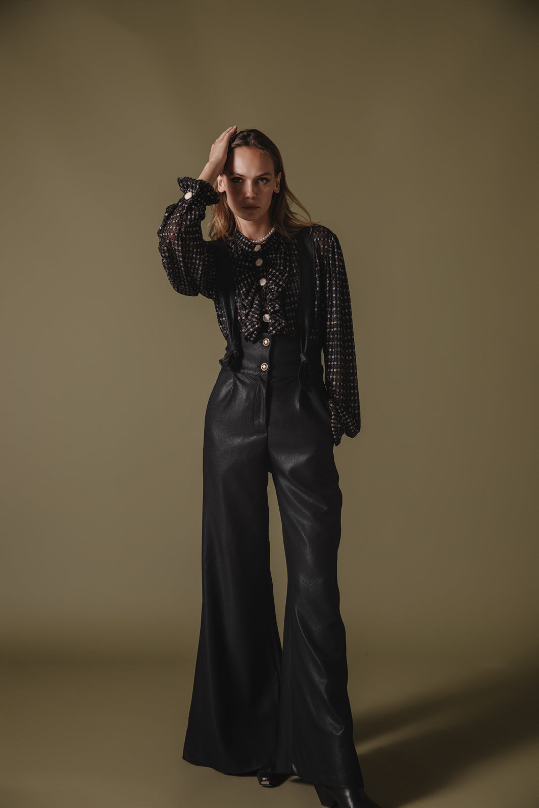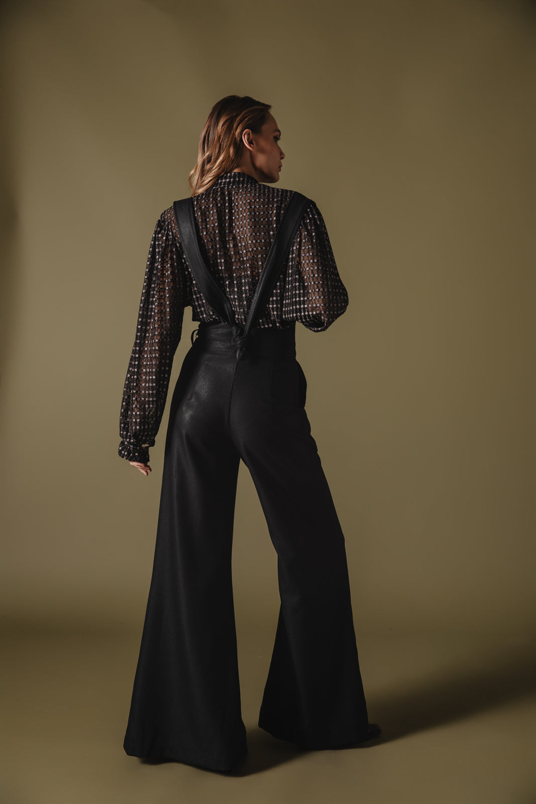 These high-waisted metallic wide-leg pants offer a bold, fashion-forward look. Featuring statement suspenders and a buttoned front, they bring a touch of modern sophistication to any outfit. The shimmering fabric and relaxed silhouette make them perfect for both day and evening wear, combining comfort with style. Pair them with a fitted top to emphasize the dramatic volume of the trousers for a striking ensemble.
