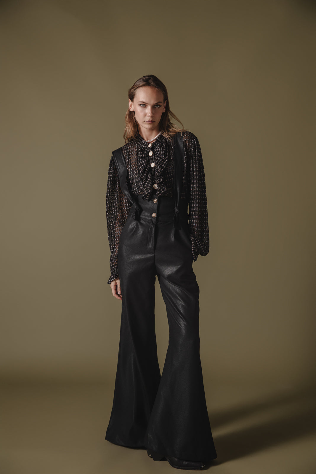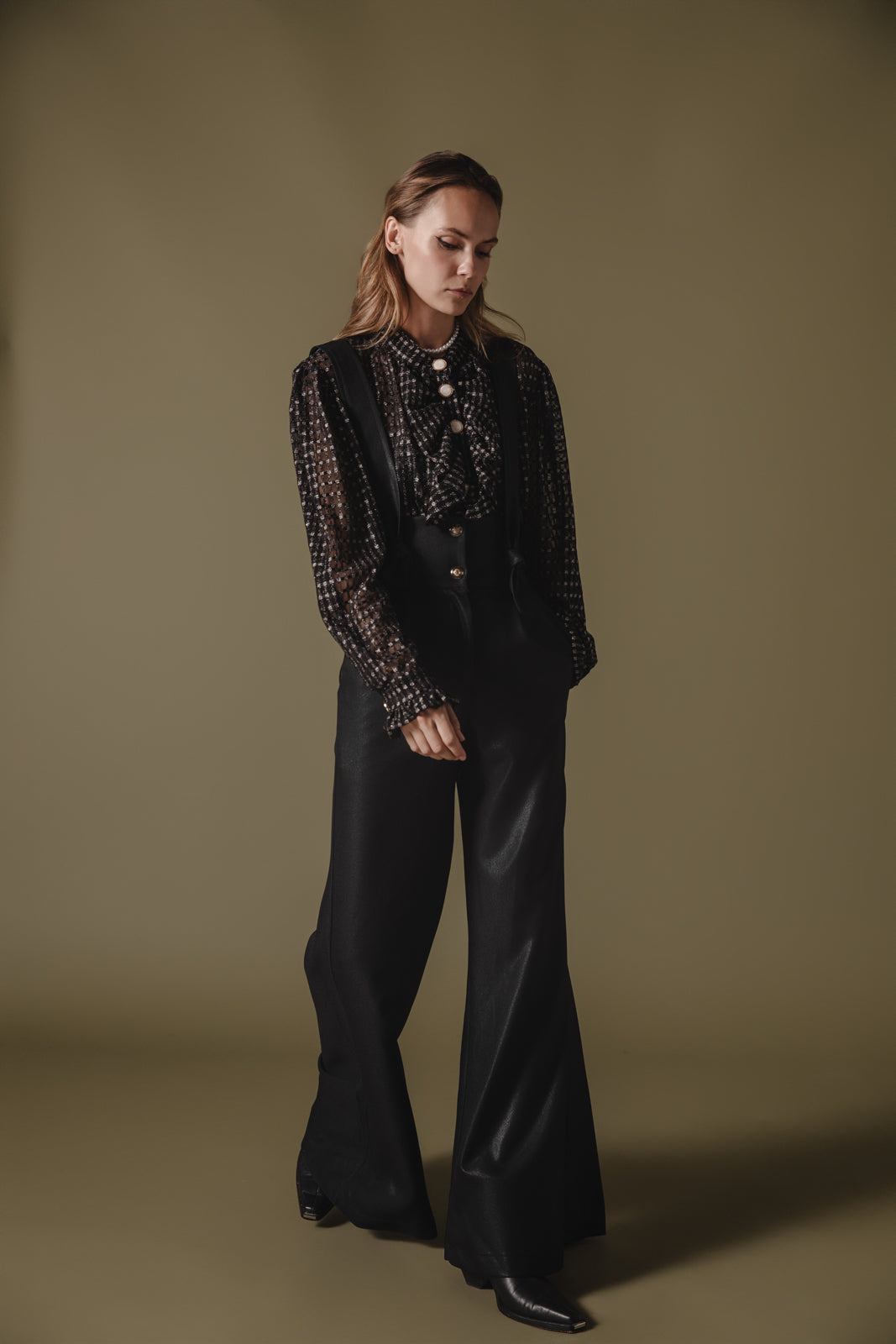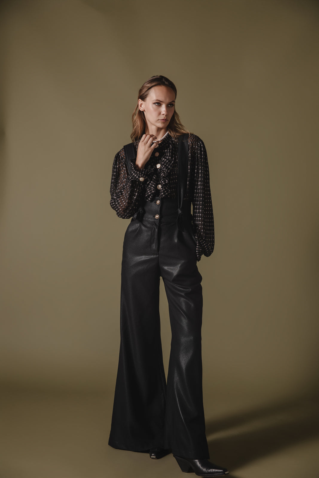 These high-waisted metallic wide-leg pants offer a bold, fashion-forward look. Featuring statement suspenders and a buttoned front, they bring a touch of modern sophistication to any outfit. The shimmering fabric and relaxed silhouette make them perfect for both day and evening wear, combining comfort with style. Pair them with a fitted top to emphasize the dramatic volume of the trousers for a striking ensemble.
