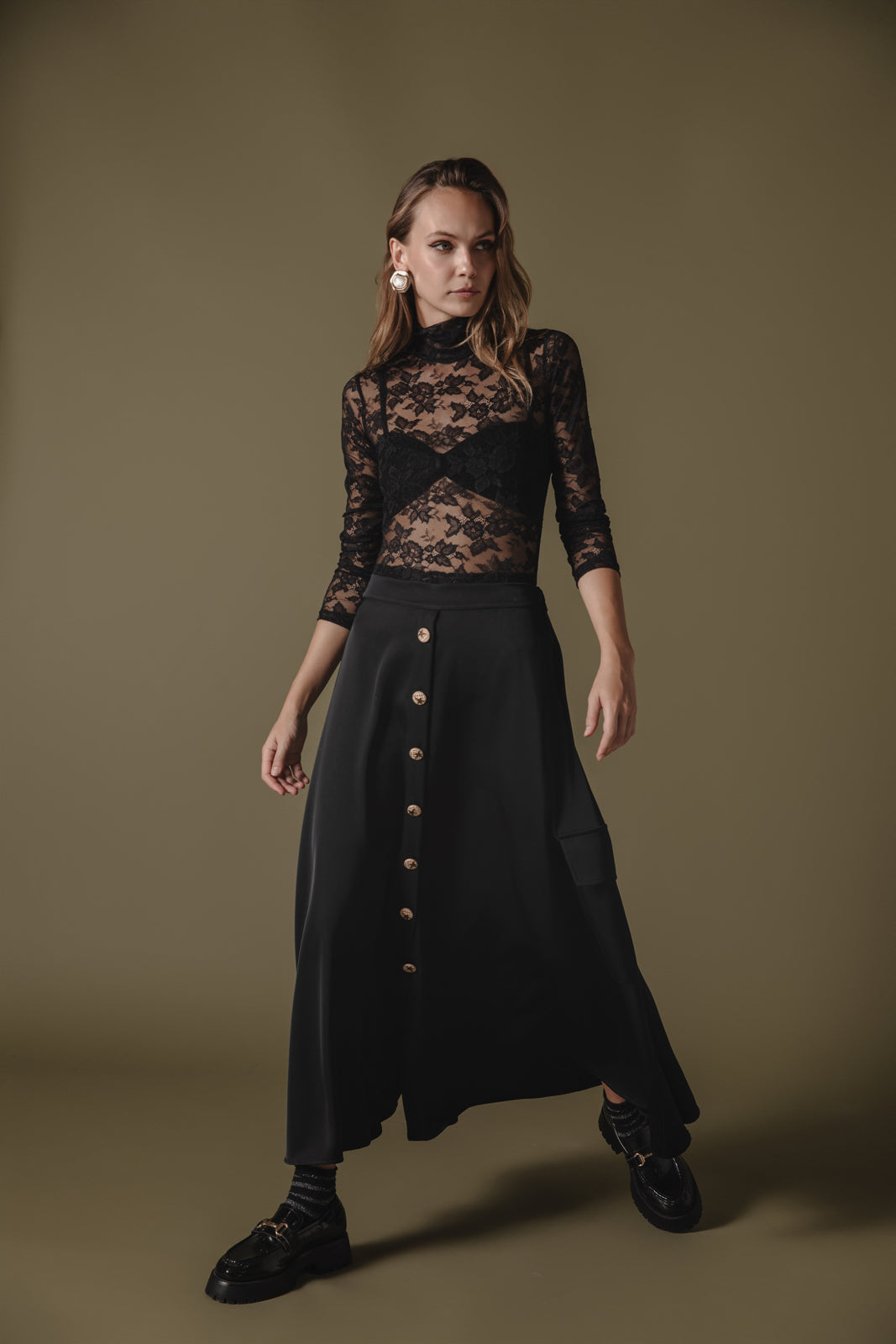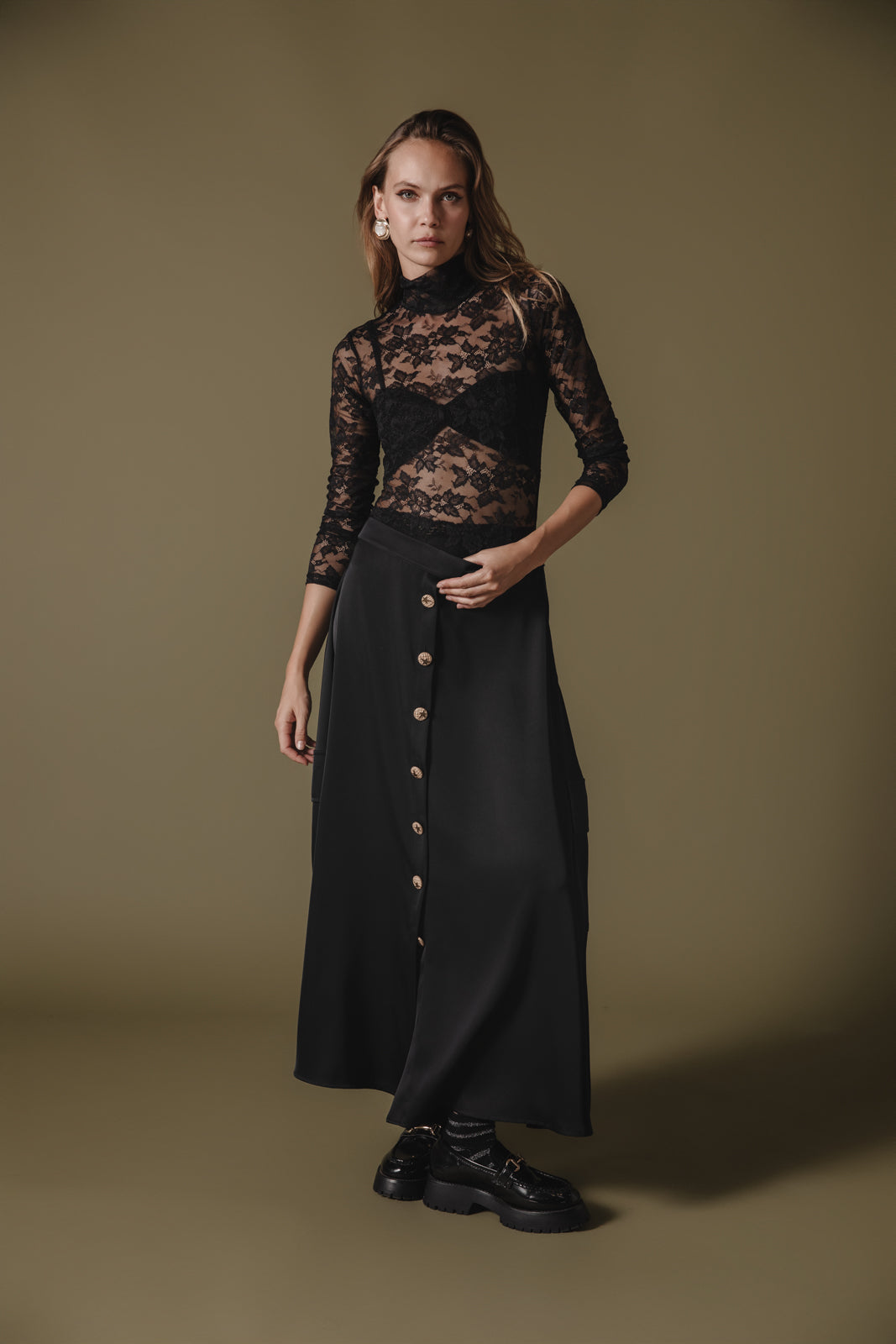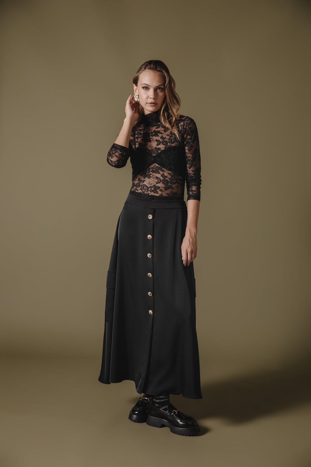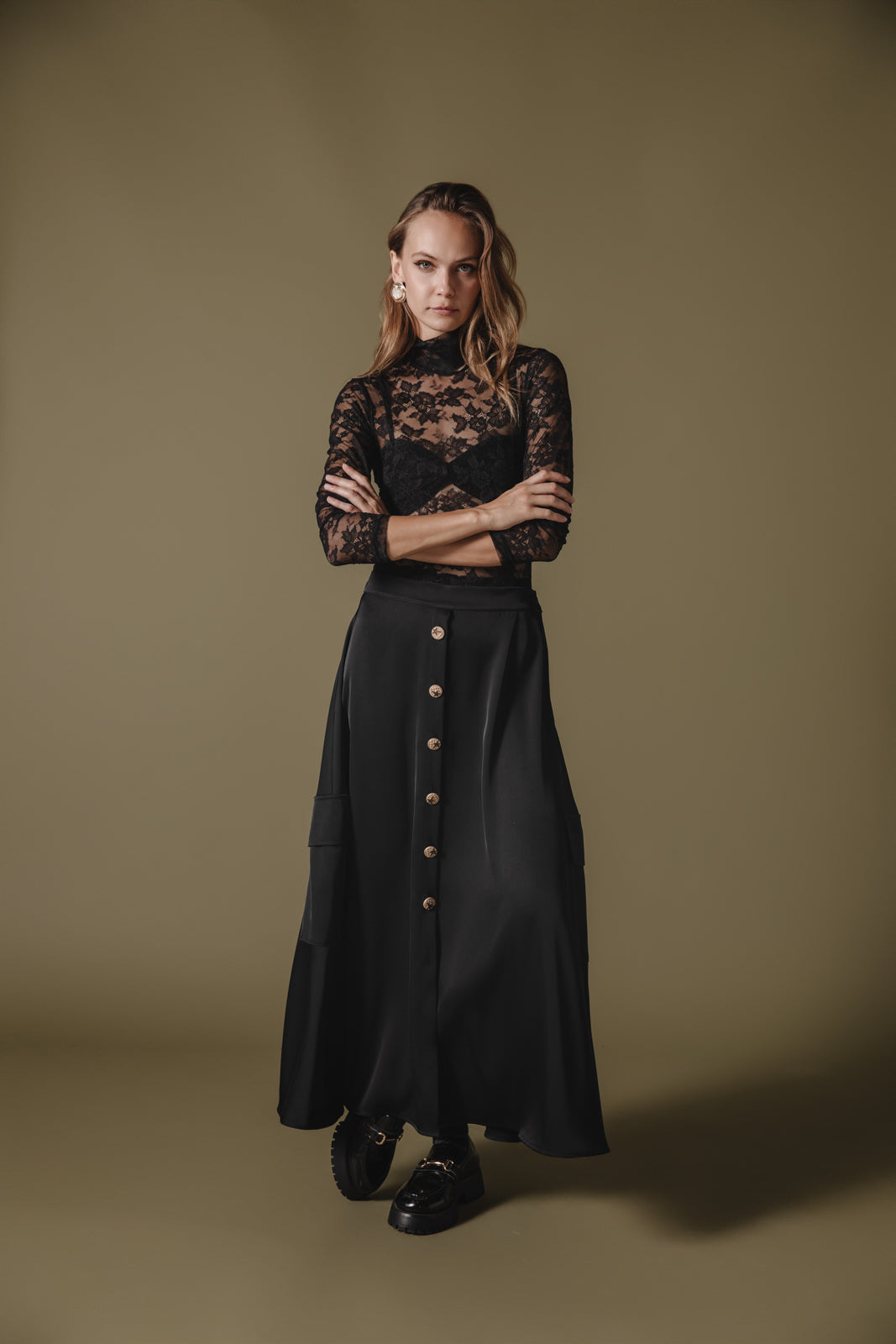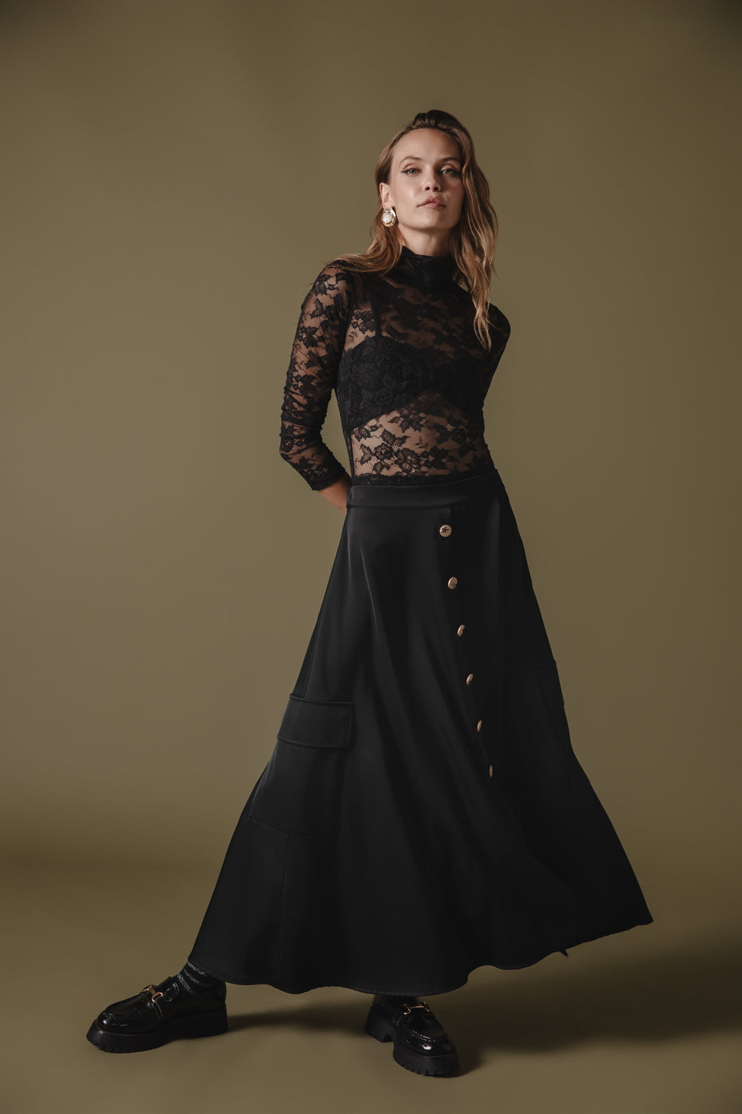 Forever cool with a vintage-inspired touch, this timeless satin skirt is a true seasonless staple. Mid-rise, true A-line silhouette. Button front closure and side pockets.