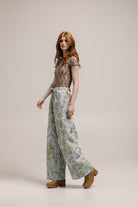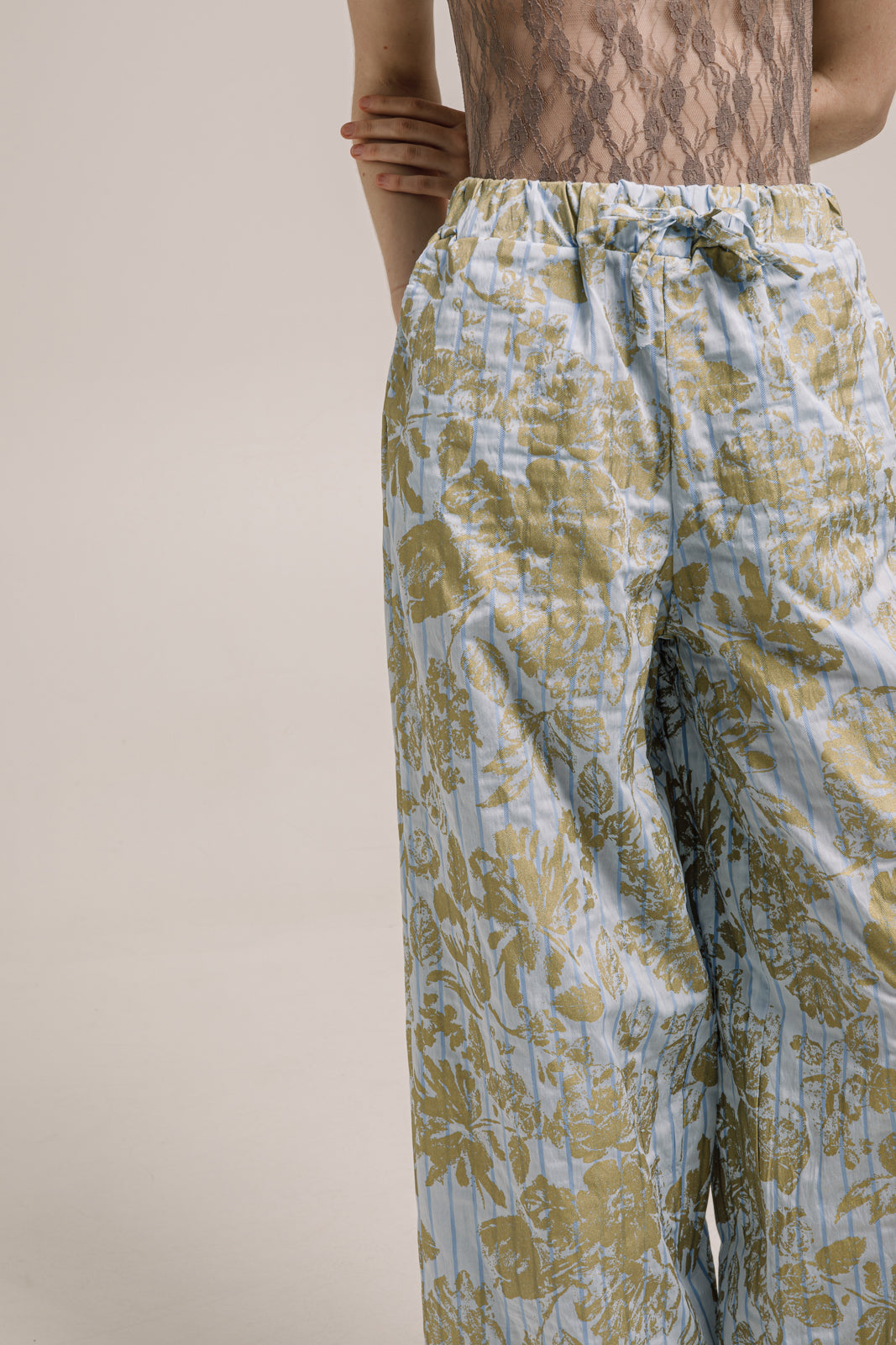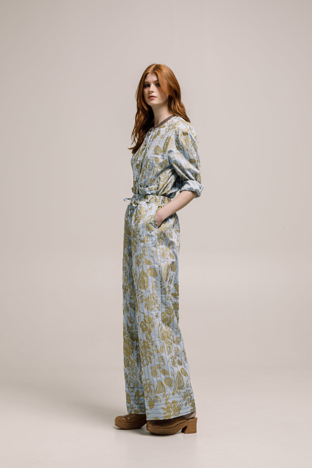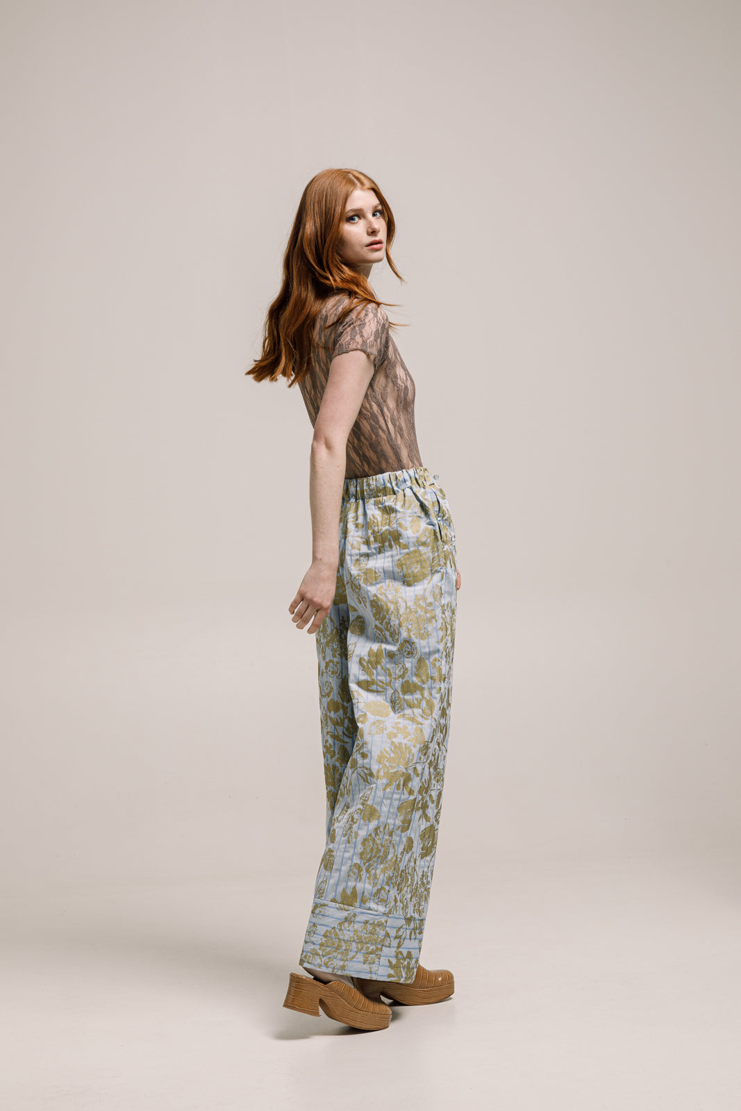The Achack Pants in Printed Light Blue are a stylish addition to any wardrobe. These pants feature a high-rise design with a slouchy, wide-leg silhouette, offering both comfort and a contemporary look. The rust-colored fabric is adorned with a unique print, adding a touch of individuality to your outfit. Pair them with the coordinating Achack shirt for a cohesive ensemble.
