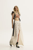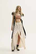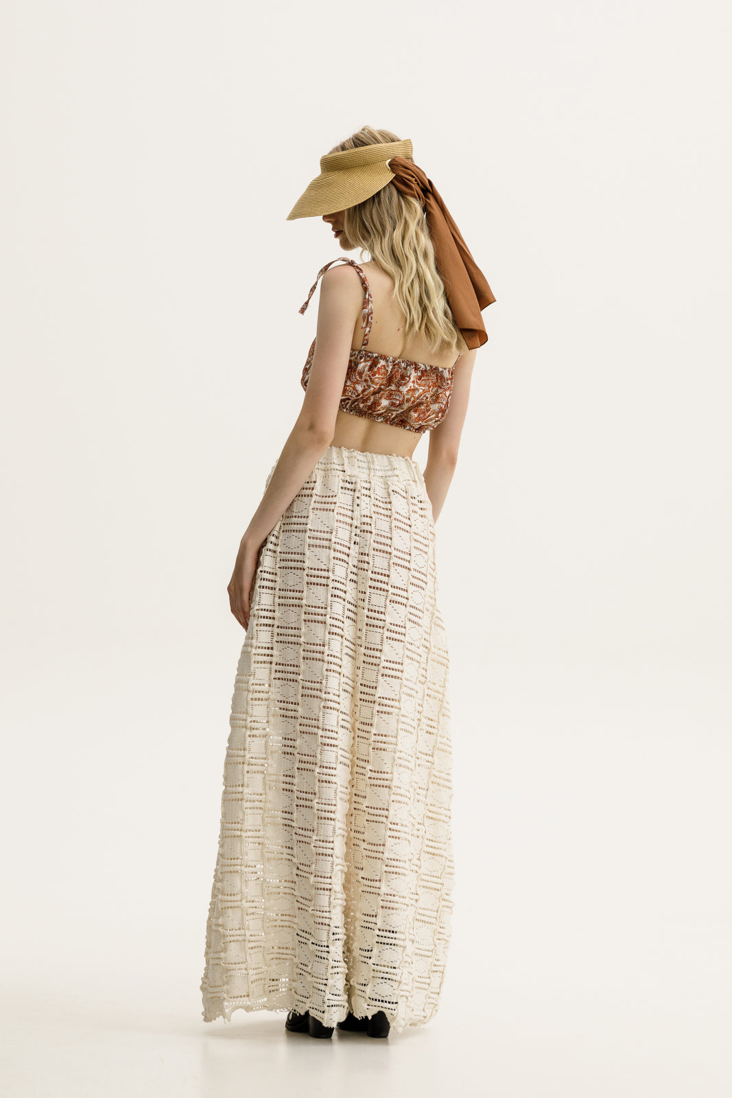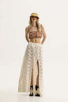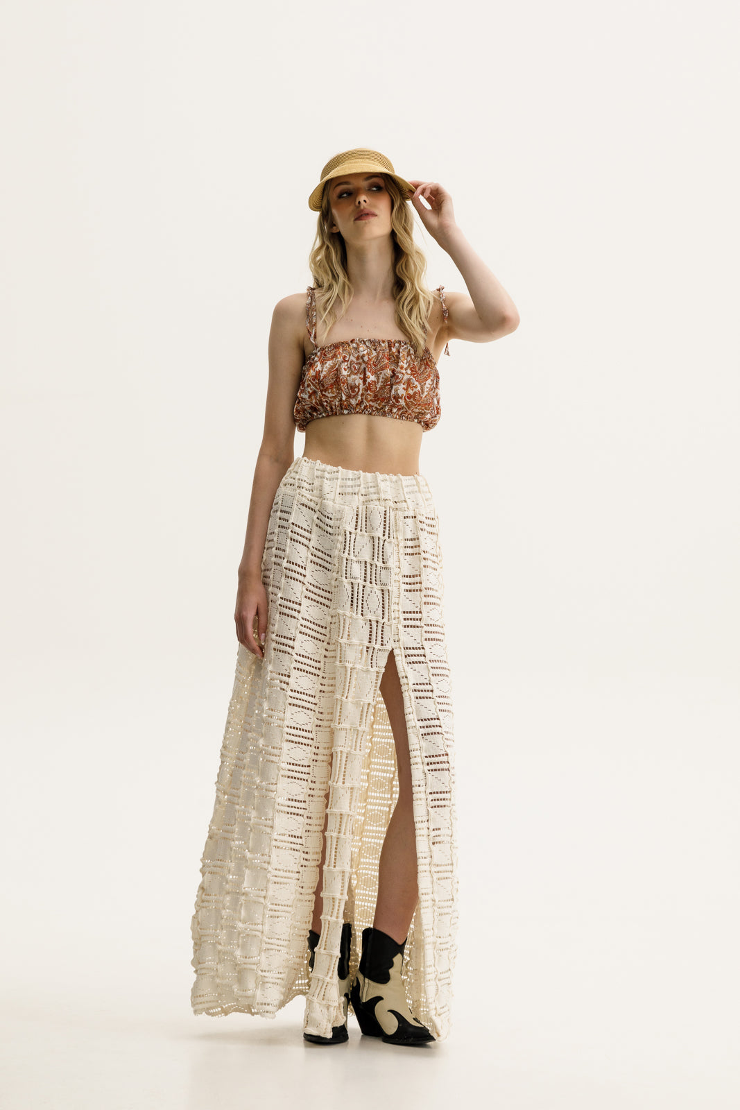 A statement piece with handcrafted energy. This ivory maxi skirt is made from textured open-knit crochet with a bold vertical pattern and a soft drape. The wide pleated waistband and subtle front slit bring movement and edge to the otherwise romantic silhouette. Perfect over briefs, shorts, or swimwear for layered summer styling.