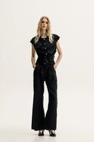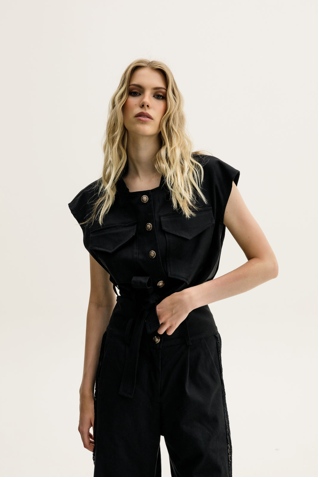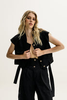 Tailored yet effortlessly cool, this sleeveless vest is designed to empower. Featuring a structured silhouette, dropped shoulders, and signature metallic buttons, it balances softness with a military-inspired edge. The adjustable back strap allows for a cinched or relaxed fit. Wear it open over a bralette or buttoned up as a top—it layers perfectly for any season.