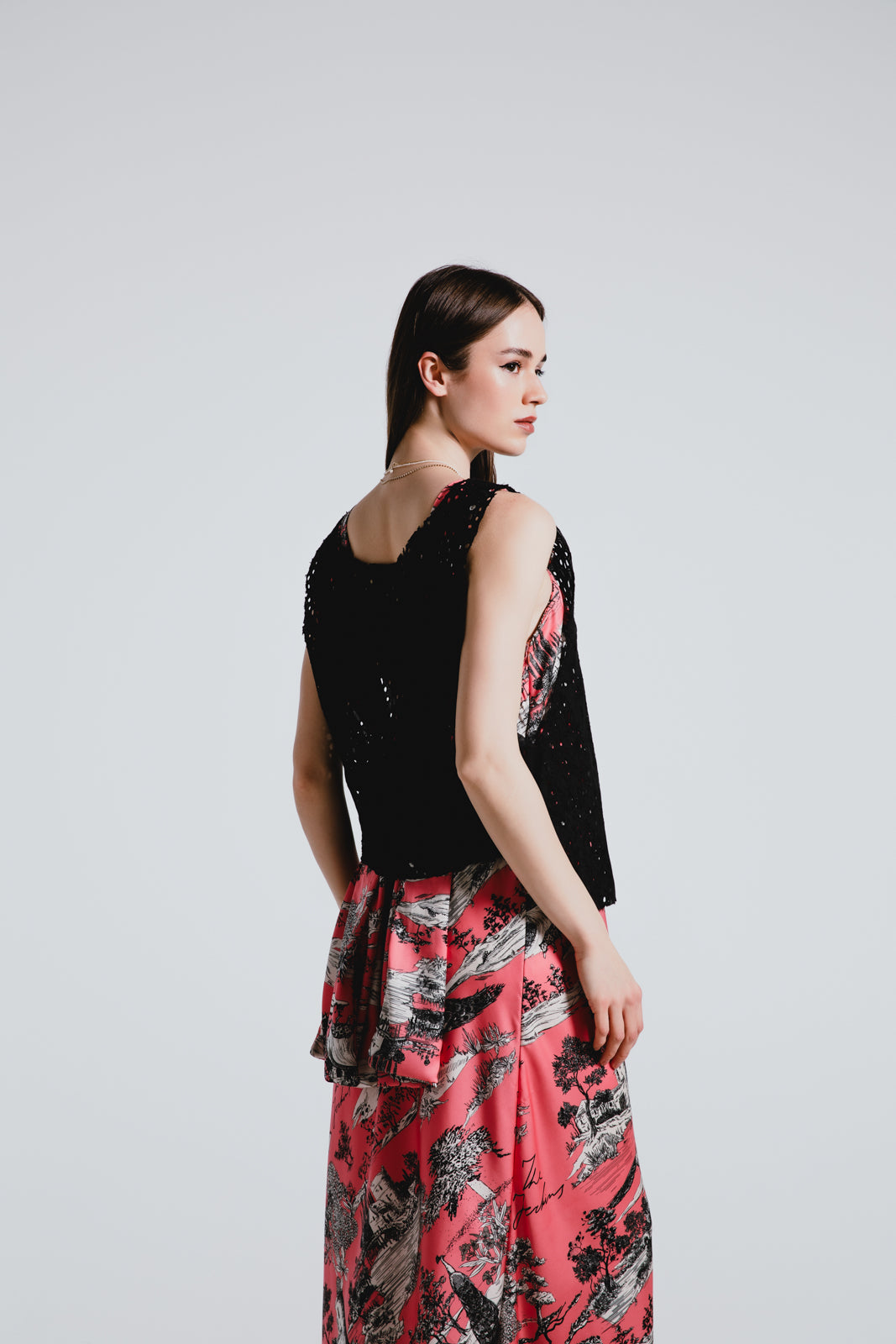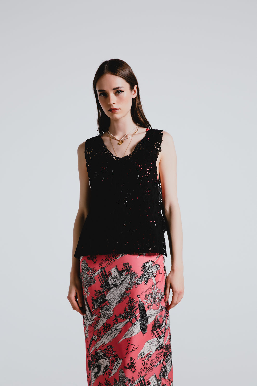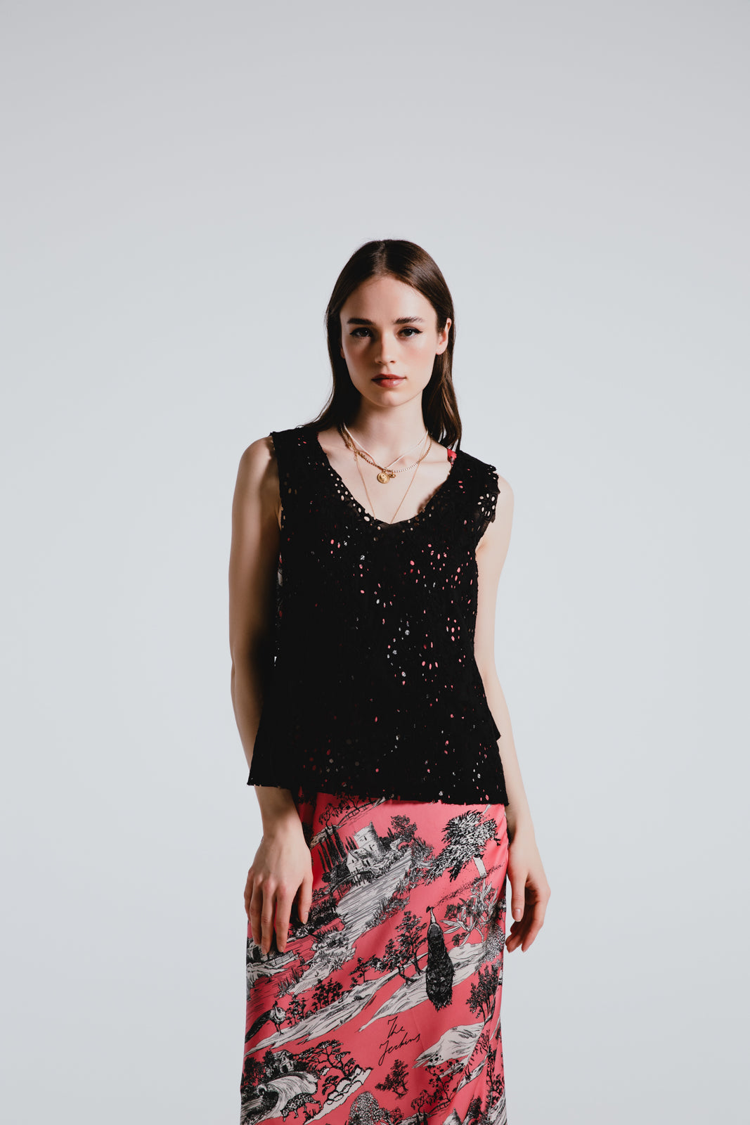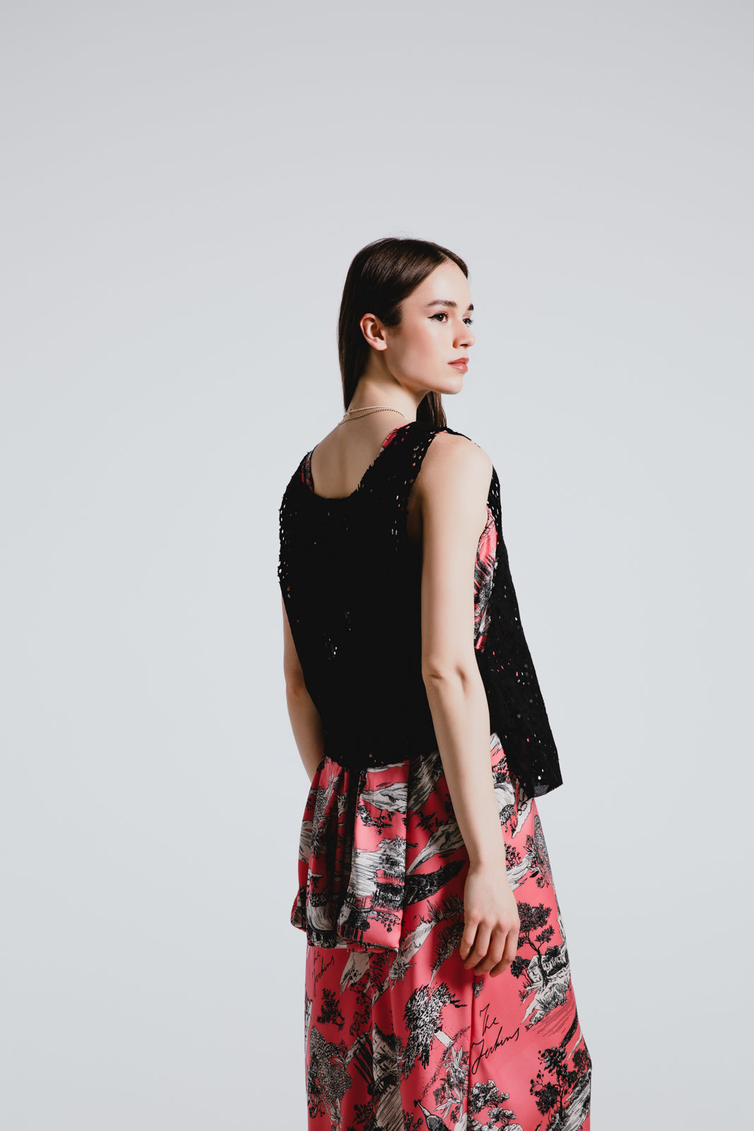 This is a sleeveless, cropped lace top in a forever black. It features an intricate, geometric lace pattern that creates a sense of texture and depth. The scalloped edges along the armholes and the bottom hem add a delicate touch, while the sheer fabric suggests pairing with an underlayer for versatility. It’s perfect for a summery, boho-chic look, or layered for a more subdued style.