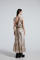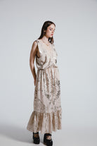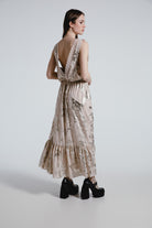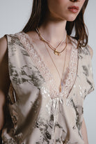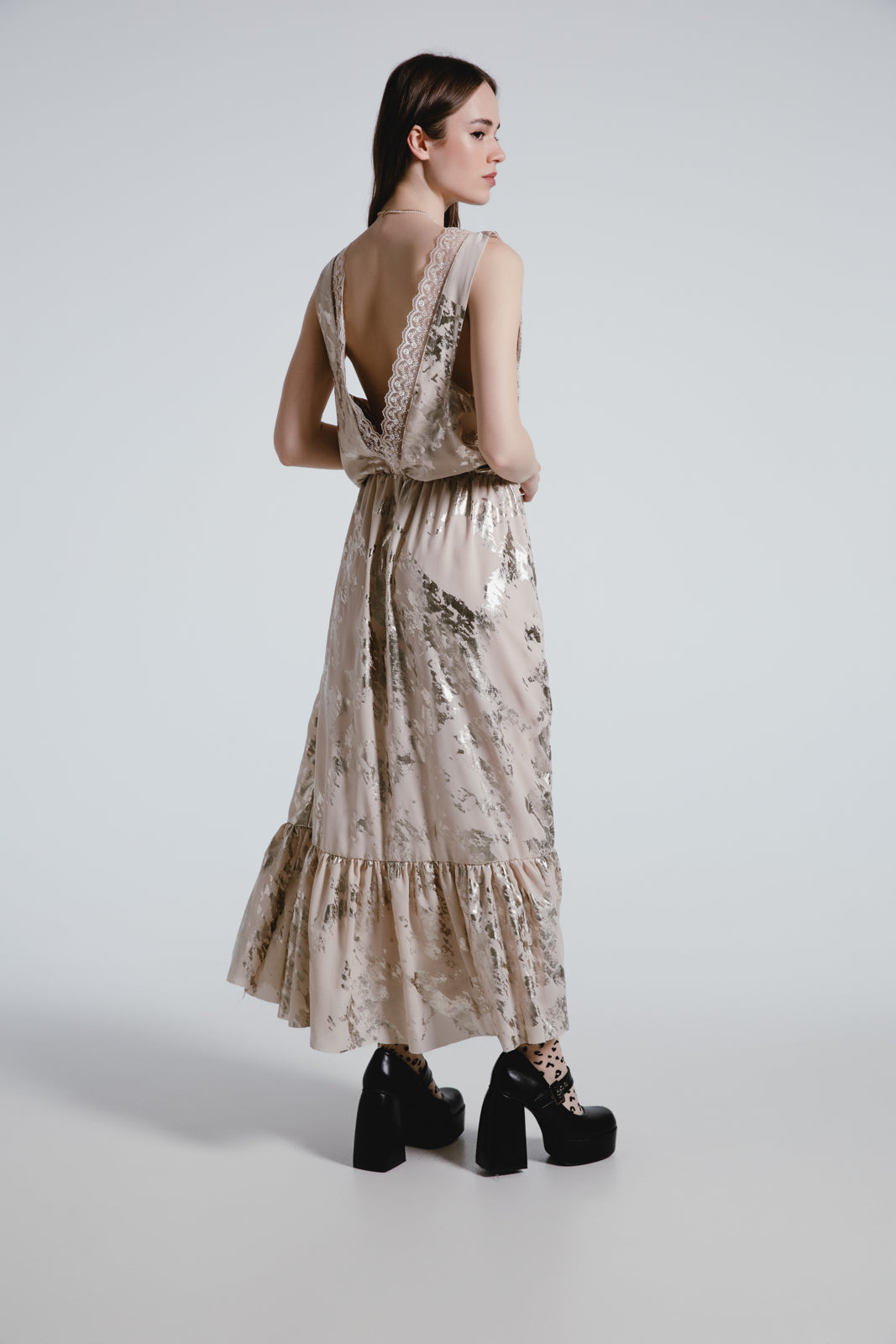 This elegant slip dress features a sophisticated and minimalistic design, crafted in a rich gold foiled fabric. Sleeveless with a deep V-neckline and back, adorned with delicate lace trim that adds a touch of femininity and allure to the dress. The bodice is slightly loose, allowing for a comfortable fit, while the waistline is subtly cinched to accentuate the figure.