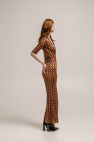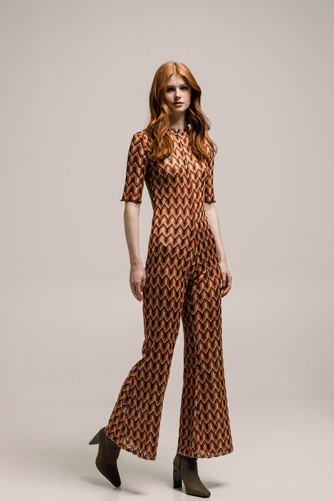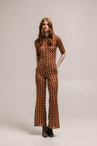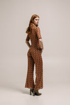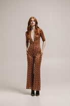 The Fabi Overall in printed ginger is a bold, 70s-inspired piece featuring a warm-toned abstract pattern,zipper front closure  and a fluid, wide-leg silhouette. Its relaxed fit and lightweight fabric make it ideal for both casual and elevated styling. The retro print and flattering cut evoke a vintage vibe, perfect for making a statement while staying effortlessly comfortable.