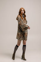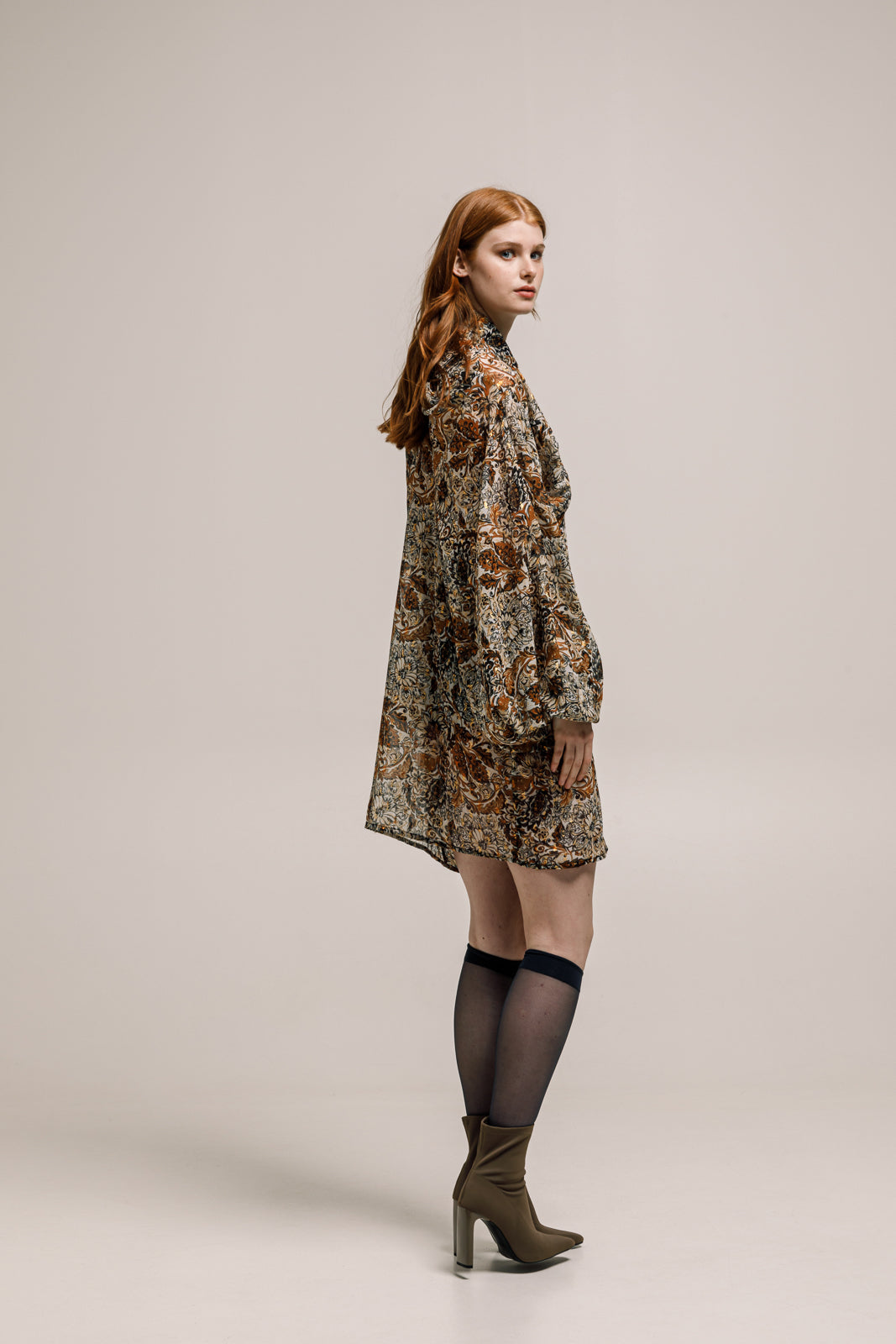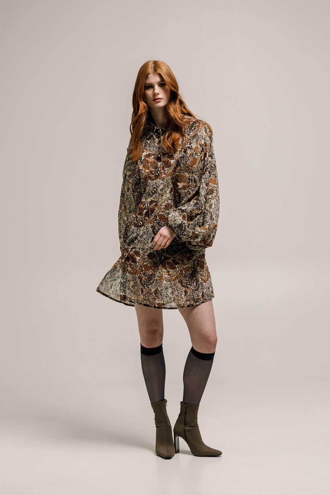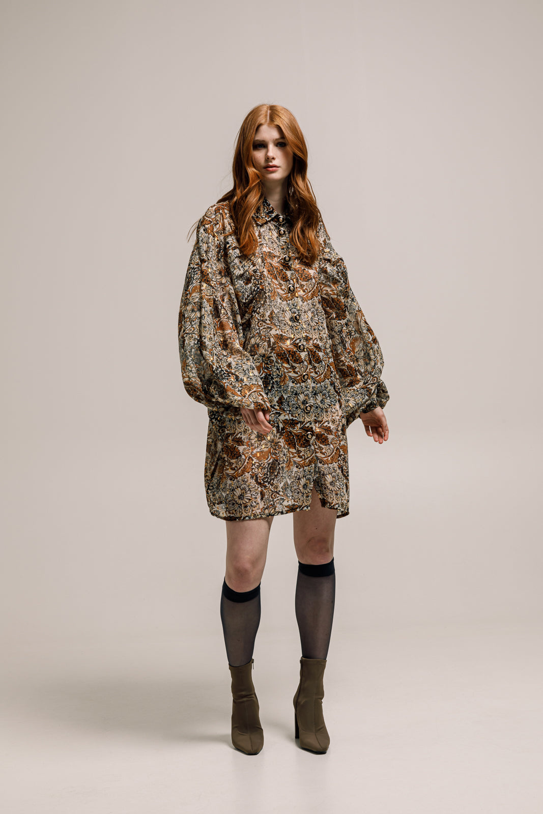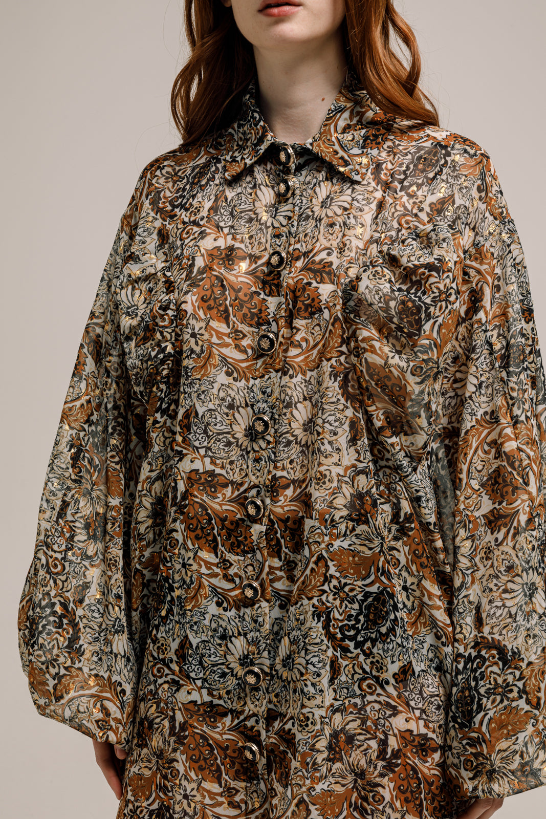 The Halifa Shirt in printed brown features a vibrant, eye-catching pattern with a relaxed fit, perfect for adding a fresh, contemporary touch to your wardrobe. Stunning button-front closure and exaggerated wide, ruffled sleeves. Its lightweight fabric ensures comfort, while the bold print makes it a standout piece for both casual and semi-casual outfits.