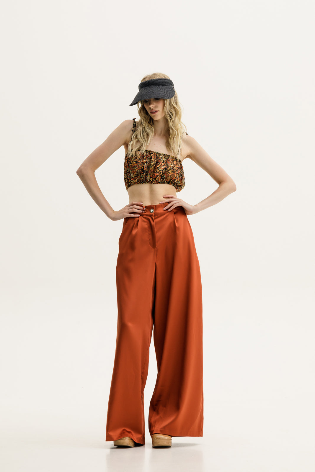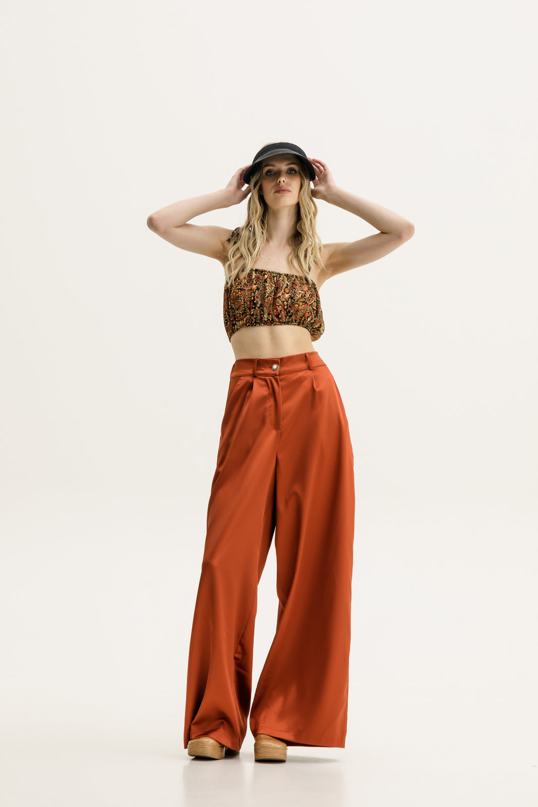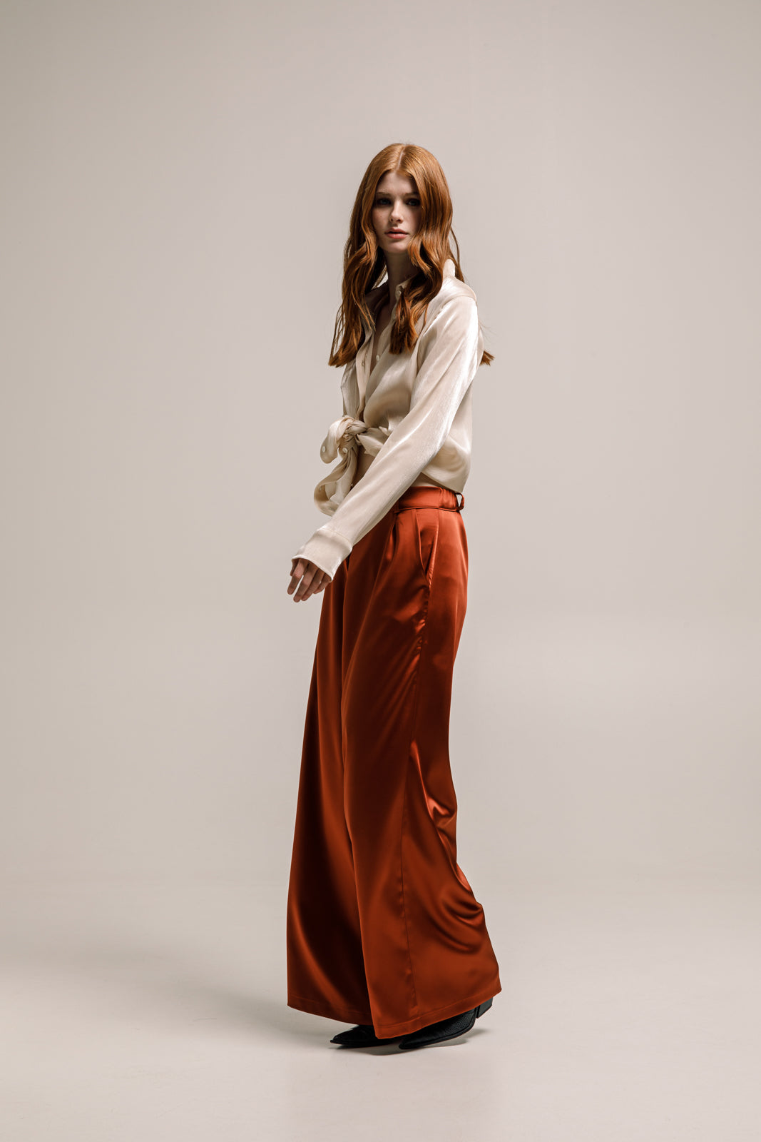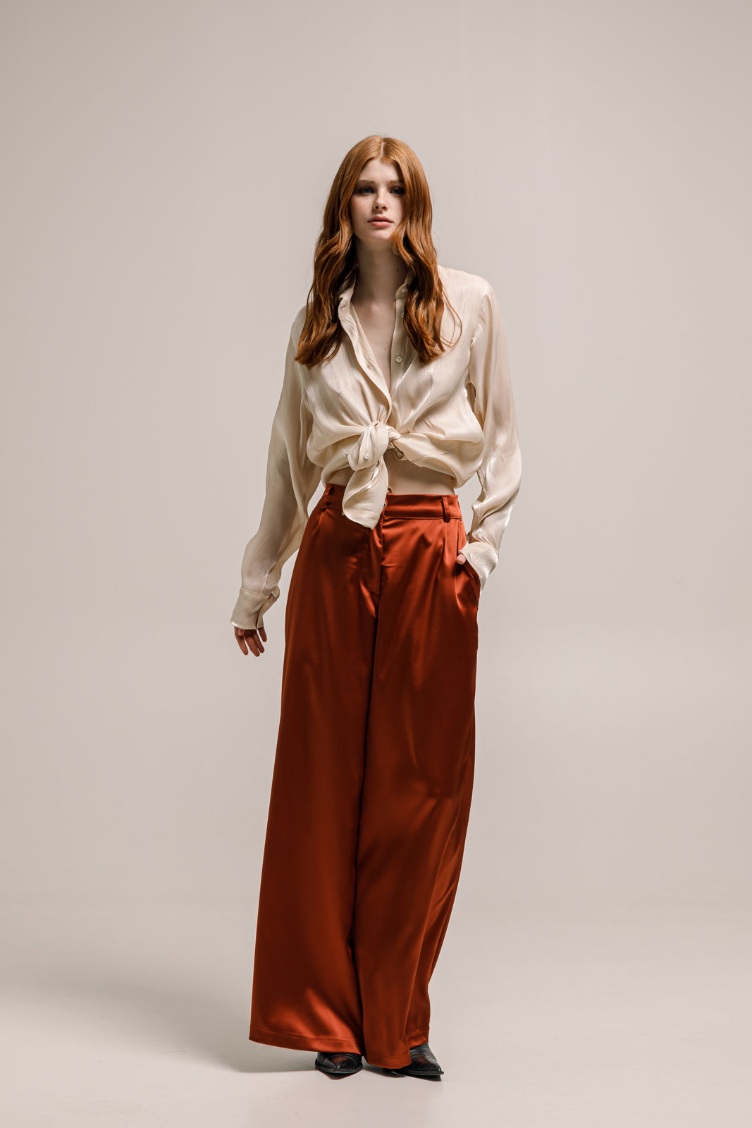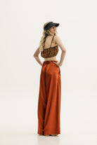 The Kahil Pants in rust offer a relaxed, wide-leg fit with a modern aesthetic, designed for both comfort and style. The rich, earthy color adds warmth to your wardrobe, making these pants perfect for creating versatile, laid-back looks. Crafted from soft, satin, stunning fabric, they combine ease of wear with effortless style, ideal for everyday wear or casual outings.