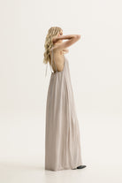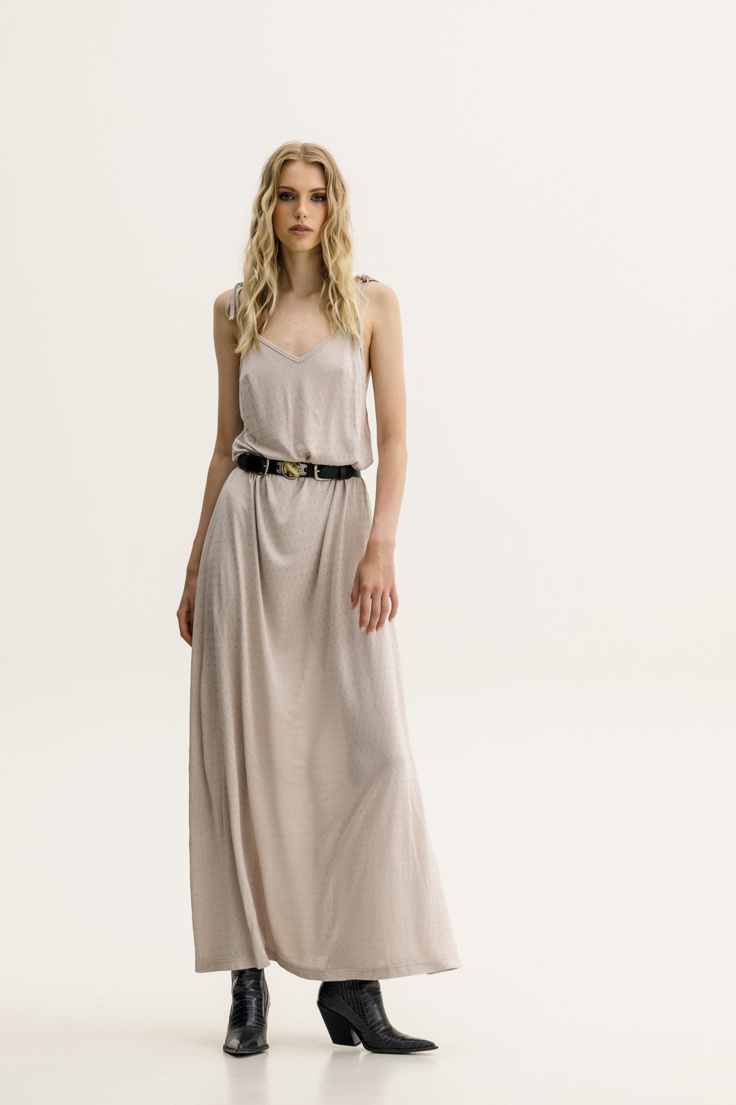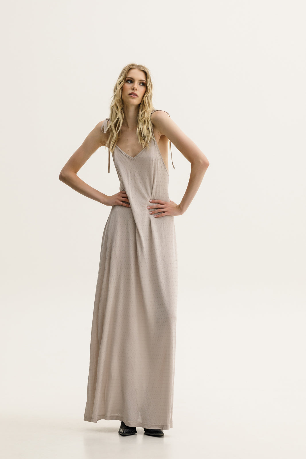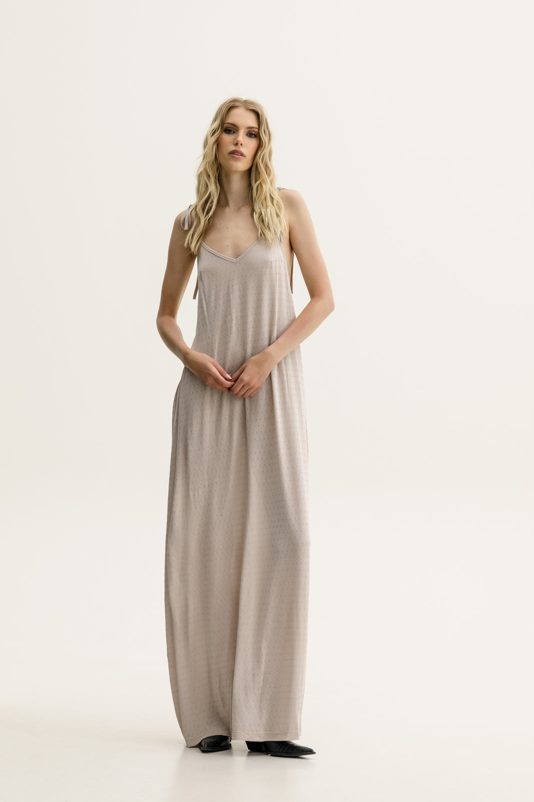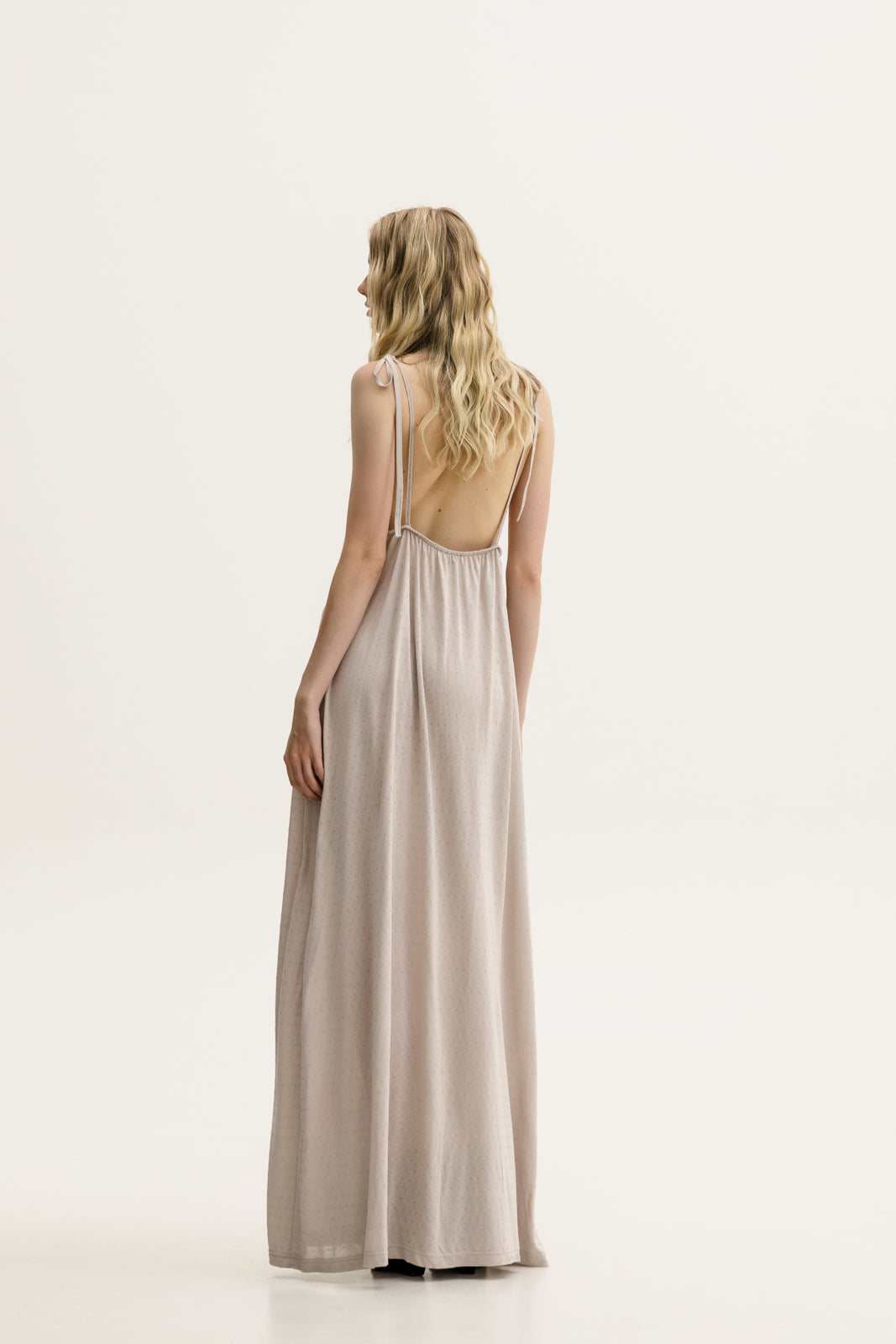 Soft, ethereal, and endlessly wearable. This cream maxi dress features a subtle tonal stripe pattern and adjustable tie straps for a custom fit. The deep V-neckline and low-cut back add a romantic edge, making it perfect for beach strolls, summer soirées, or effortless layering.