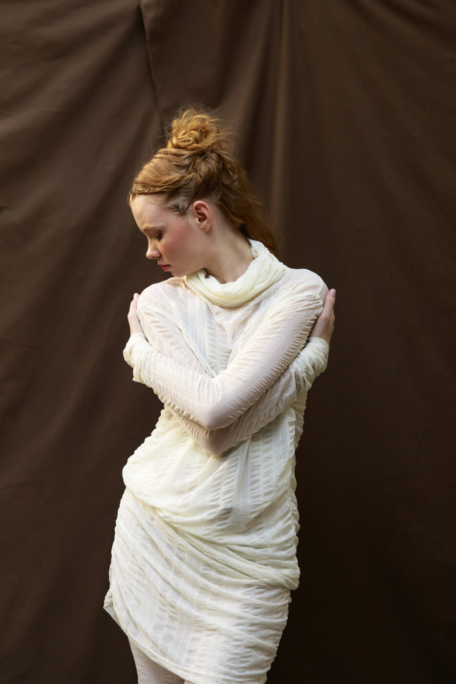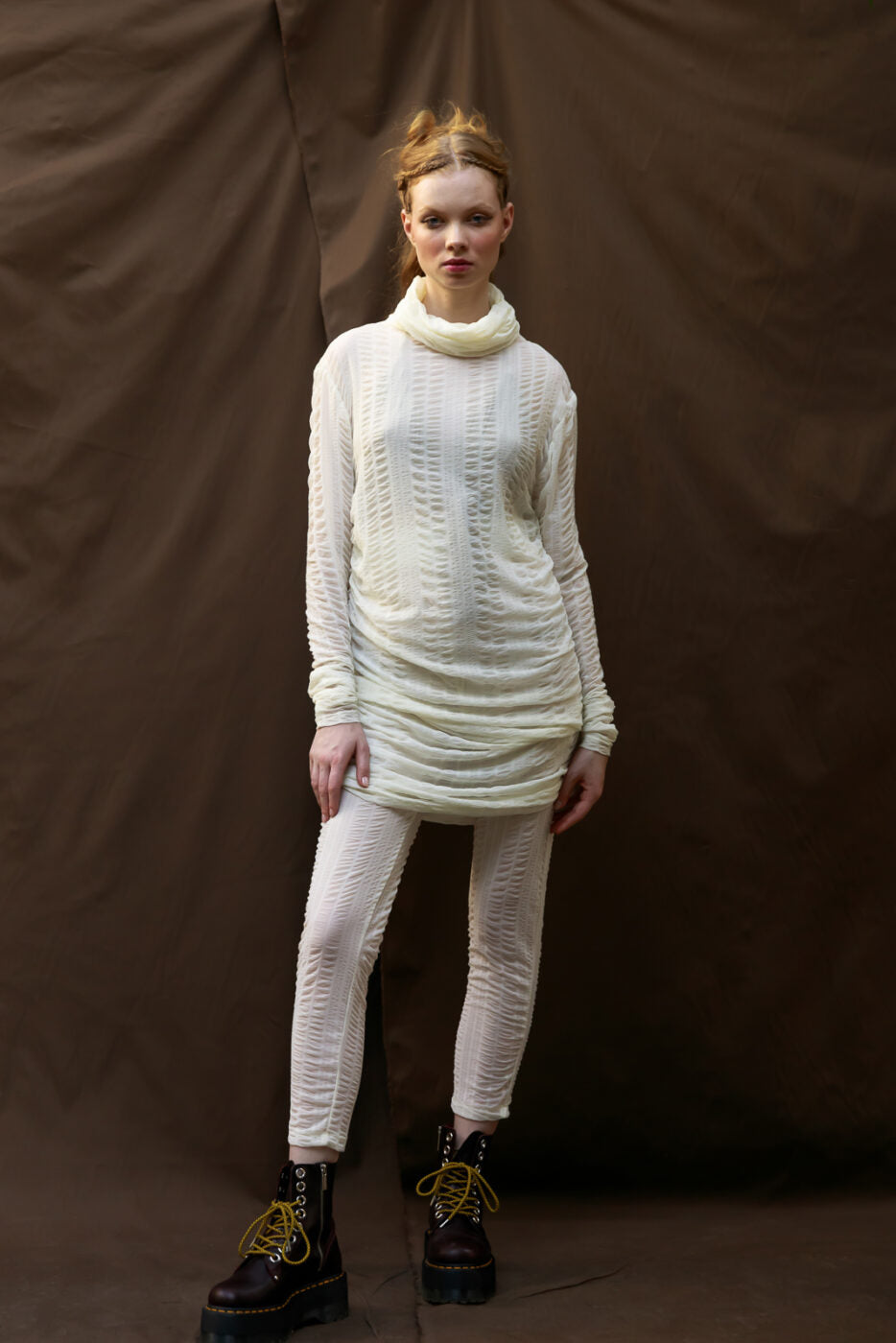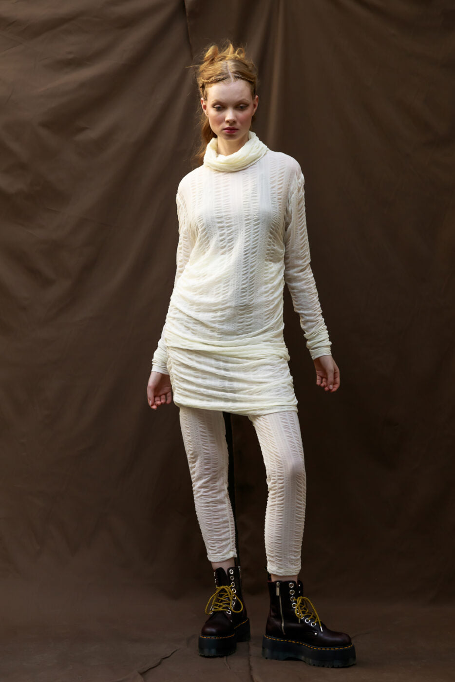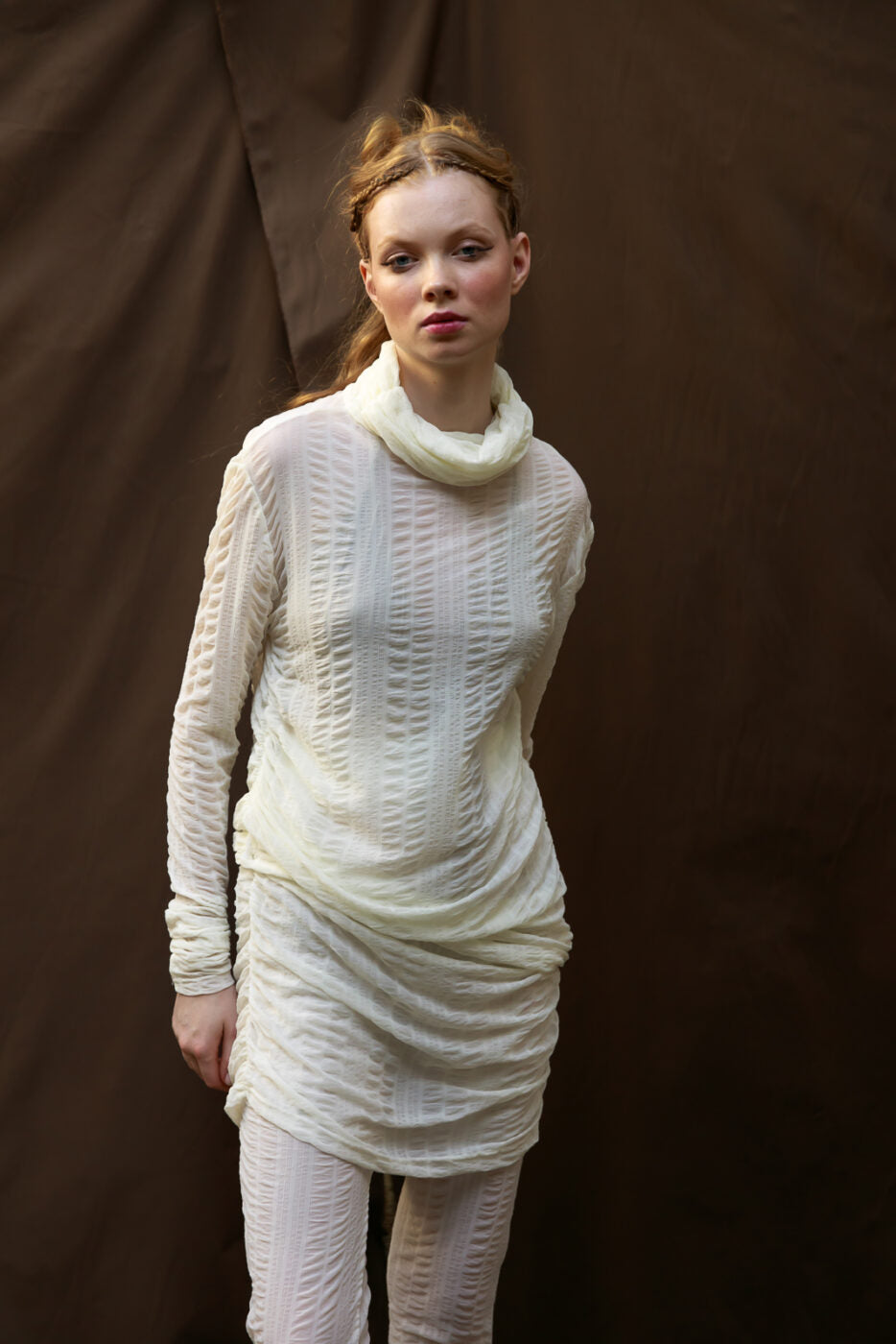 Turn heads in sheer and stunning top, featured in a high-neck silhouette with ruched detailing throughout. Slightly fitted body and long fitted sleeves.