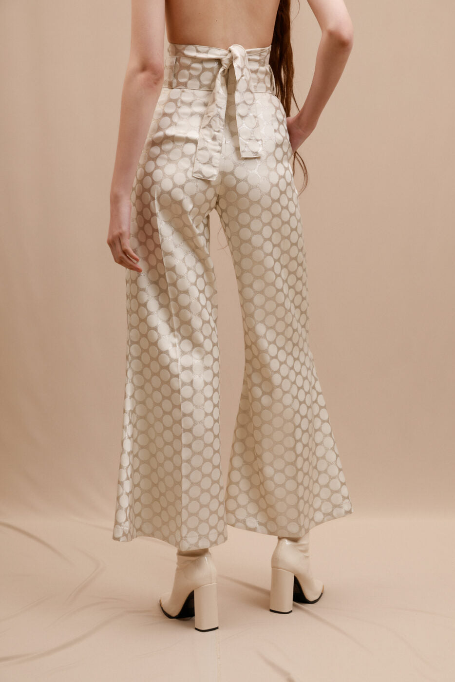 High-rise, wide flare silhouette. Zip-fly and button closure. Side pockets. Stunning shiny fabrication.
