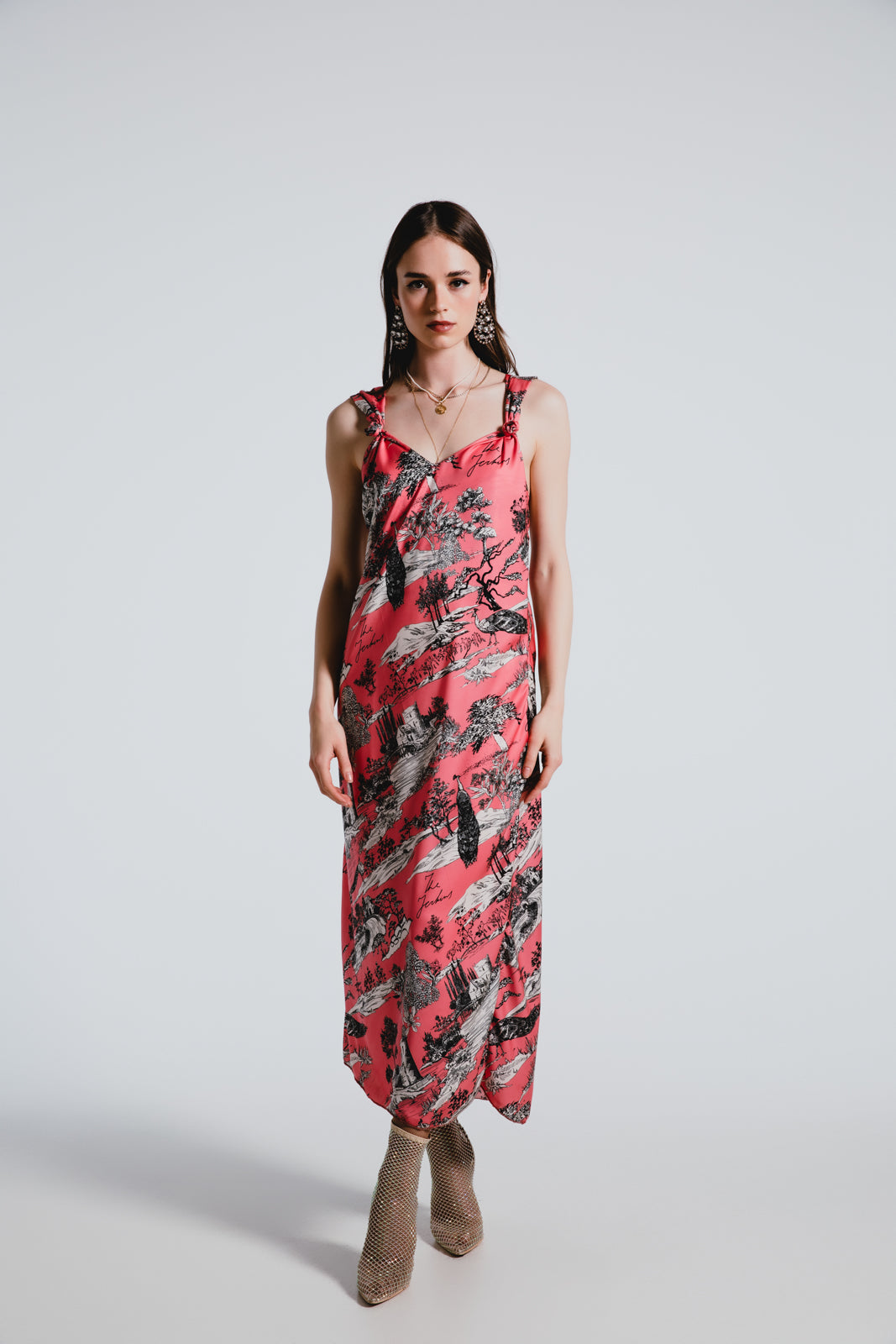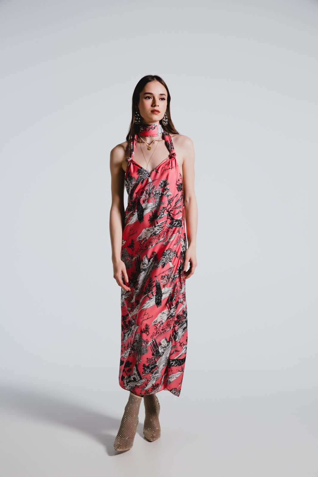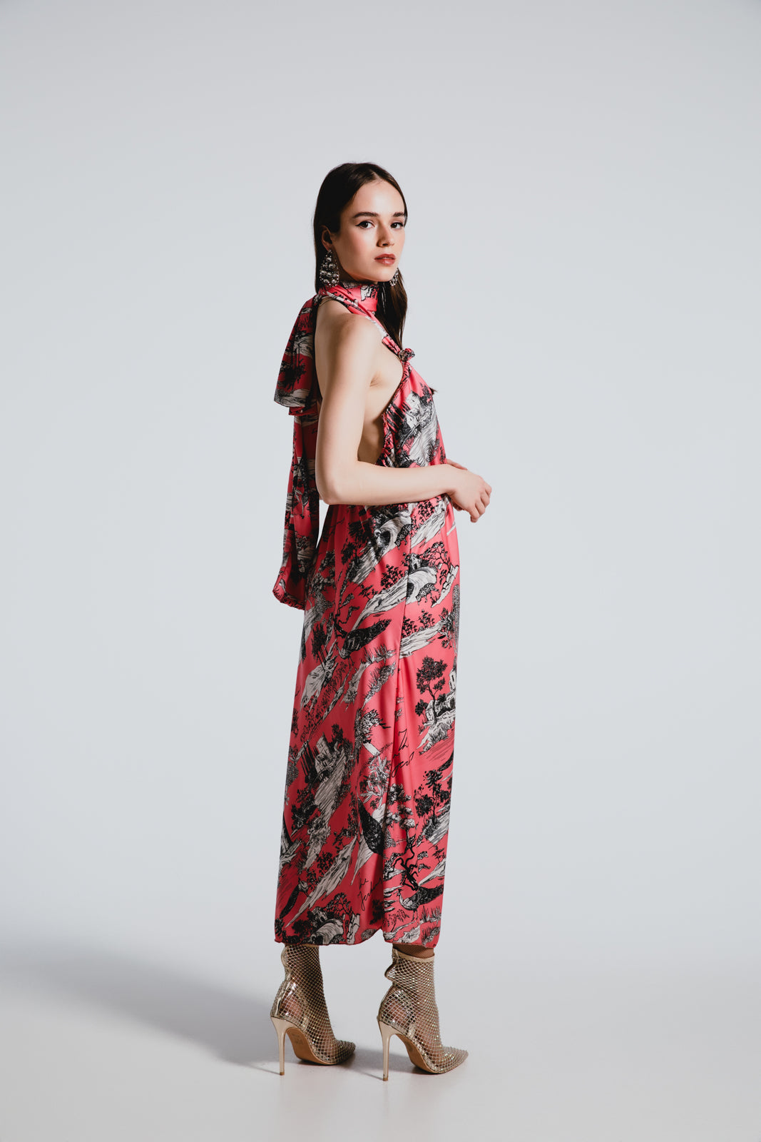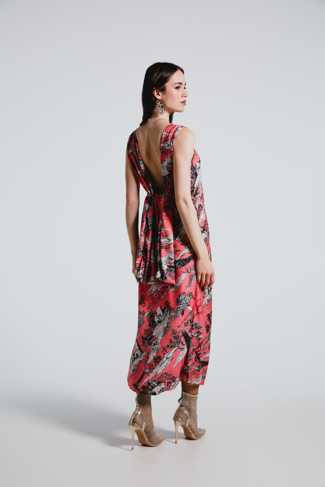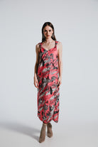This elegant slip dress features a captivating Oasia print, adding a touch of exotic allure to its design. The dress boasts a backless cut offering a bold and stylish statement. It comes with long, thick straps that can be creatively wrapped around the neck, adding versatility to your look. The ankle-length hem and relaxed fit make it perfect for both casual and formal occasions, while the deep V-neckline adds a hint of allure. Paired with clogs or sandals, it strikes a perfect balance between comfort and chick fashion.