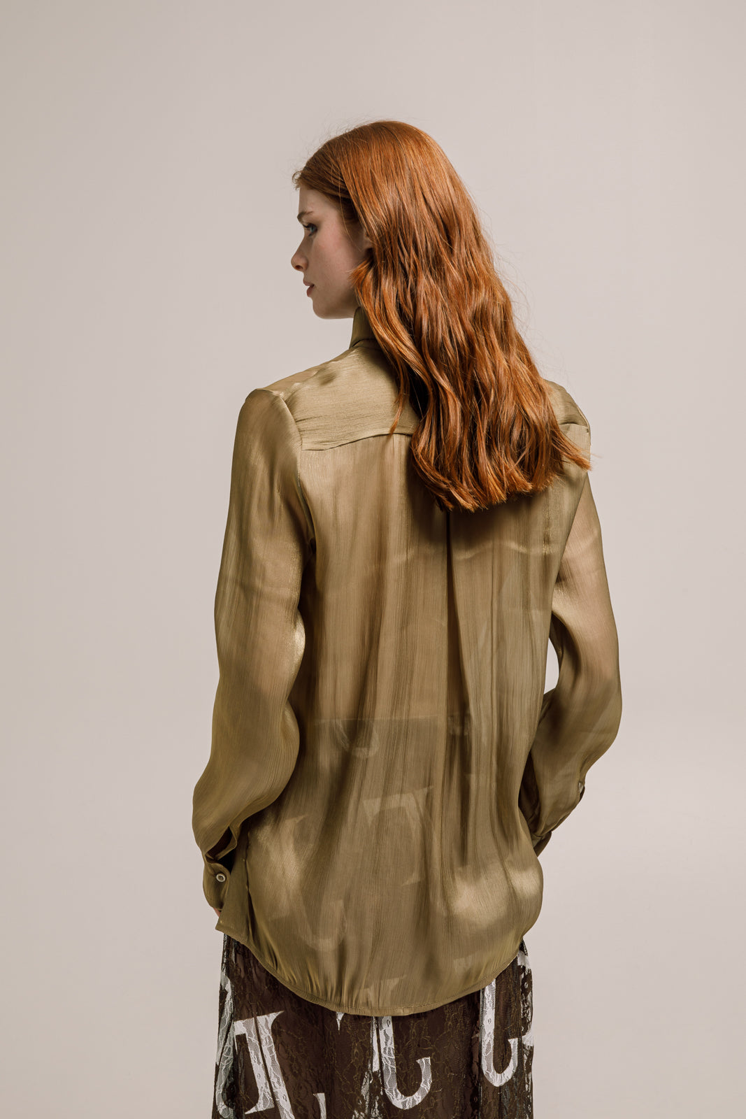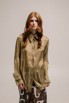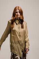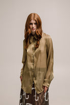 A versatile essential, the Olina Shirt in army green features a relaxed fit and soft, shiny fabric, blending utility with everyday comfort. Its minimal design and muted tone make it perfect for layering or wearing solo, offering a casual, effortless look. A staple piece that works year-round.