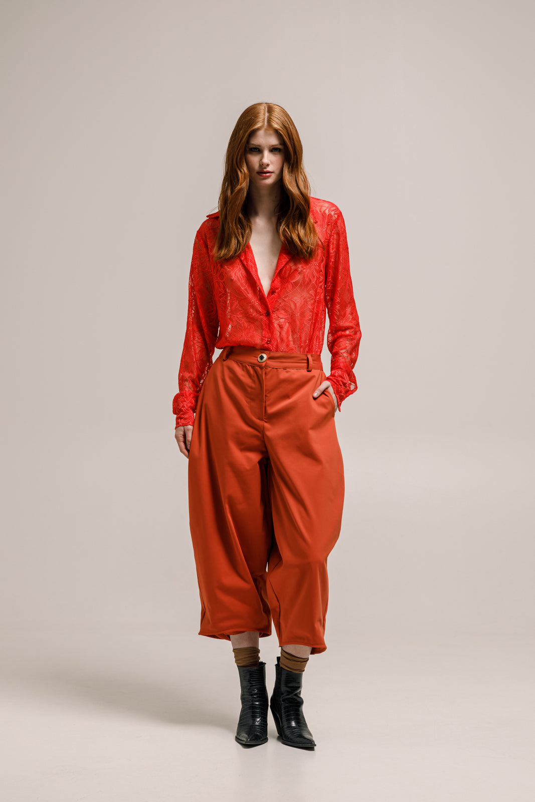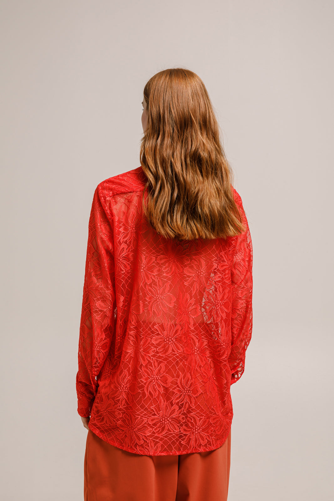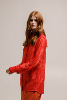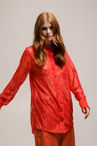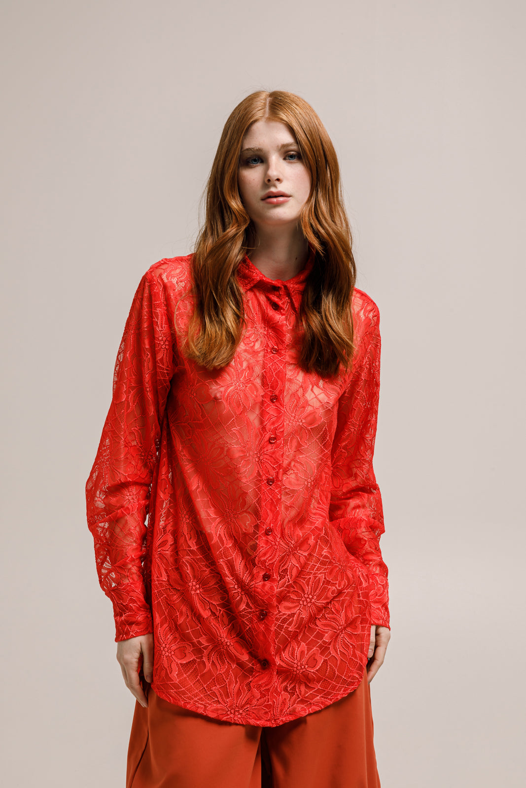 The Olina Shirt is a vibrant orange lace shirt designed to elevate your wardrobe with a touch of romantic flair. Featuring a relaxed fit and intricate lace detailing, this shirt offers a lightweight and airy feel, perfect for layering or wearing solo. It blends bohemian charm with modern elegance, making it ideal for both casual and dressier looks.