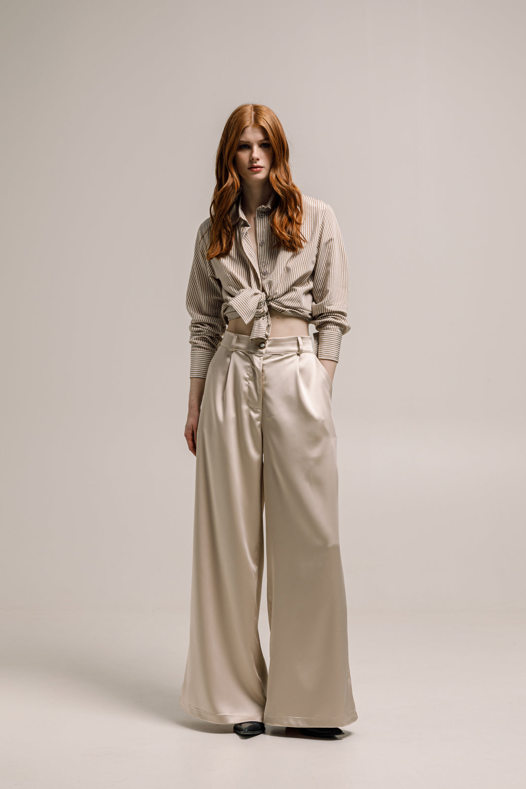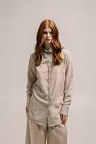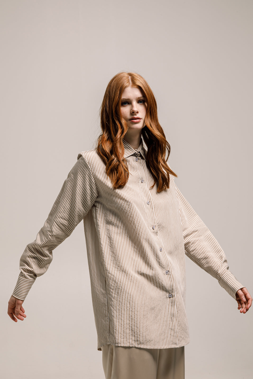 The Olina Shirt in striped tan beige is a timeless piece featuring a relaxed, oversized silhouette. Made from soft, breathable fabric, it offers a casual yet elevated style perfect for everyday wear. The neutral stripe pattern makes it easy to mix and match, whether styled open over a tee or buttoned up for a cleaner look.