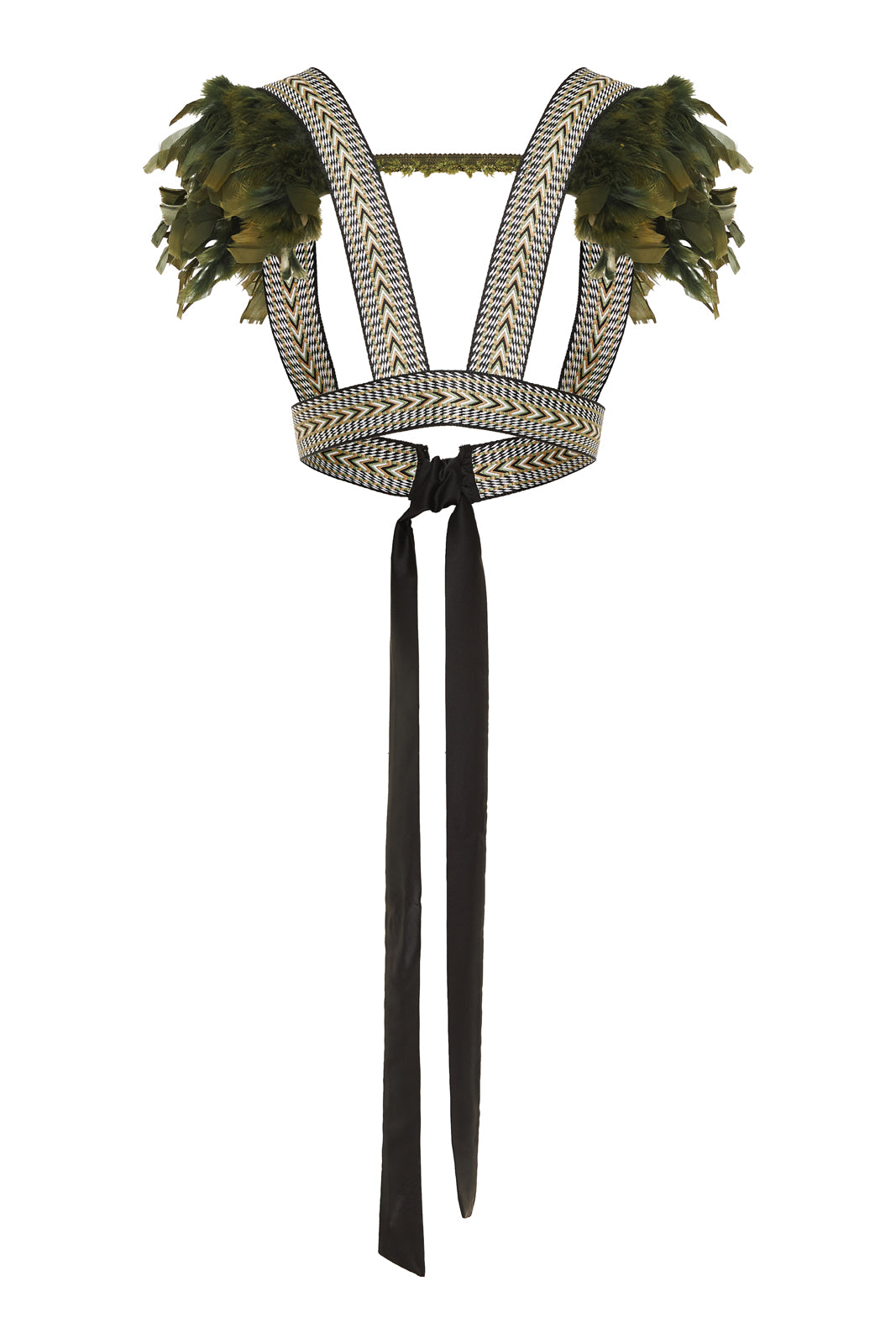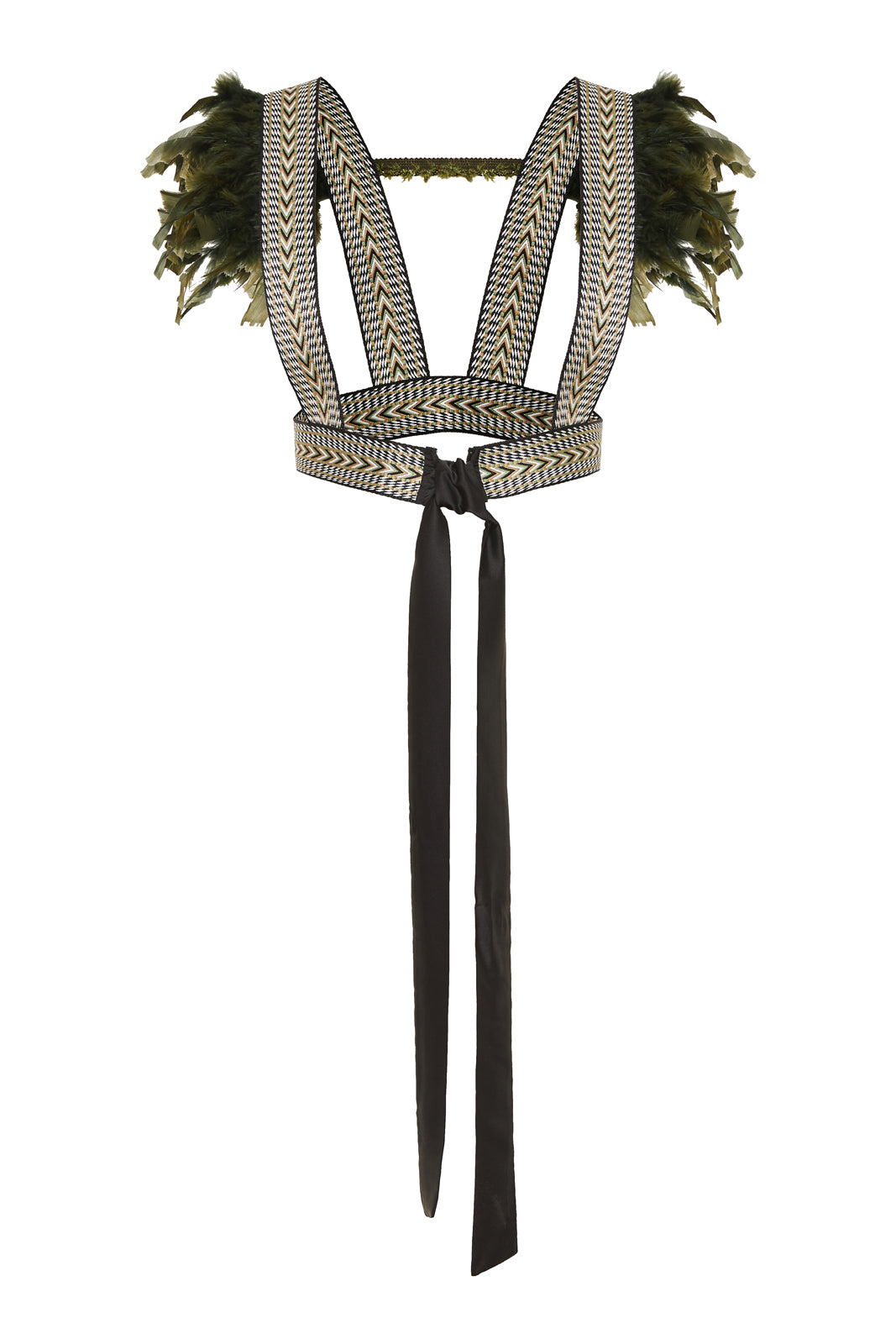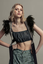 The Sachit Feathered Vest in army green is a bold statement piece featuring soft, delicate feather details that add a touch of glamour. Its structured yet lightweight design makes it perfect for layering, adding texture and depth to any outfit. Whether styled over a dress or paired with tailored pants, this vest brings effortless sophistication and a unique, fashion-forward edge.