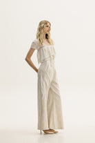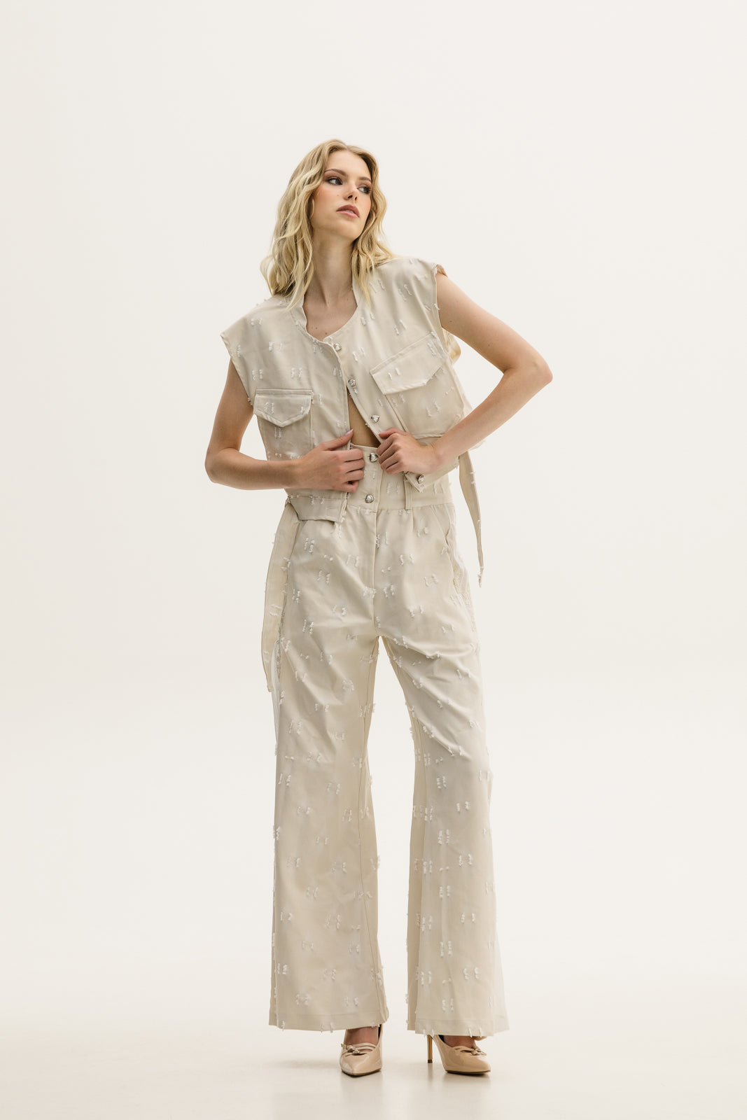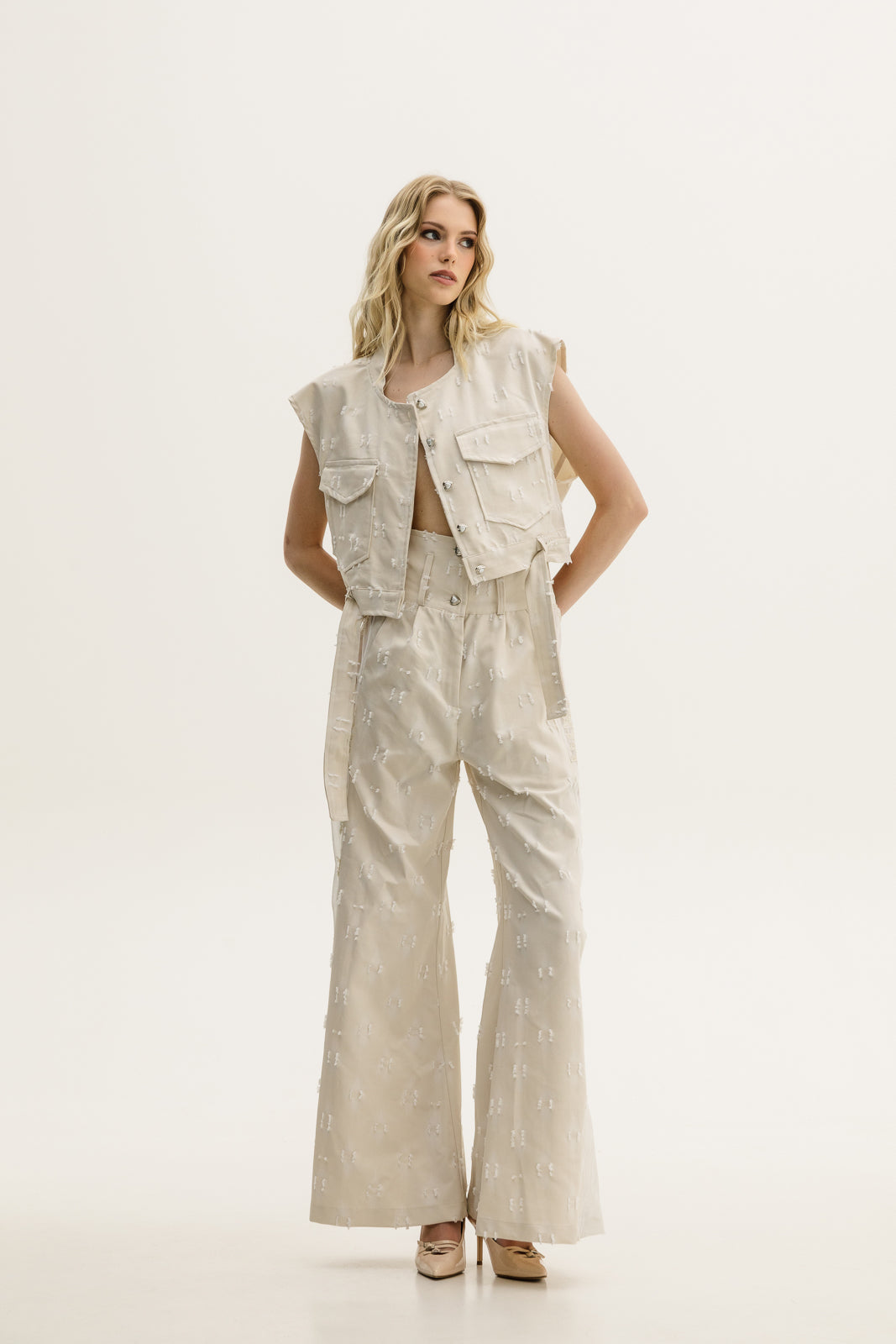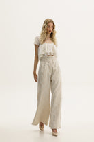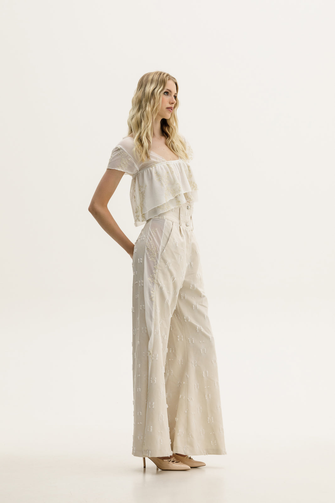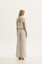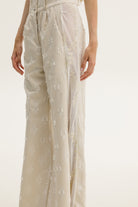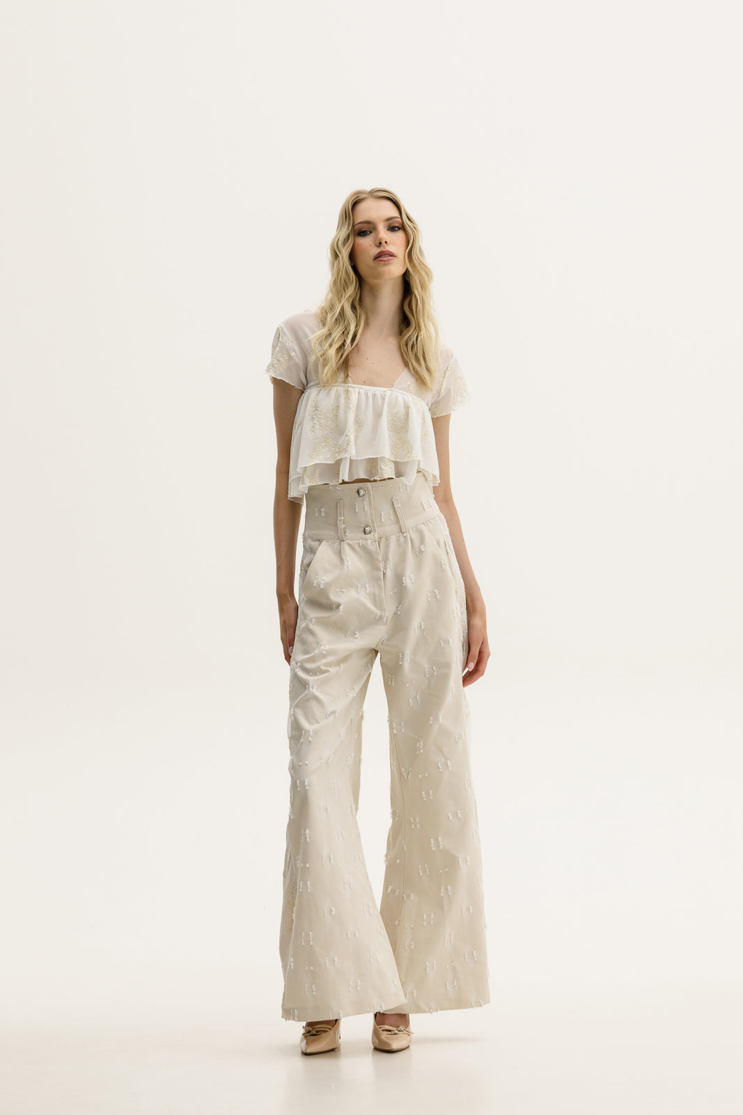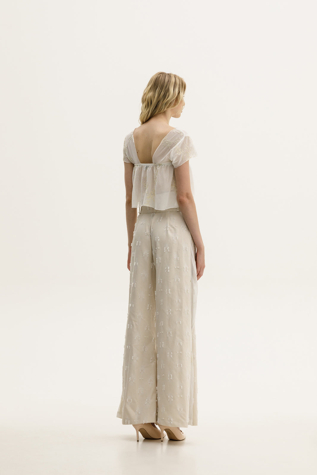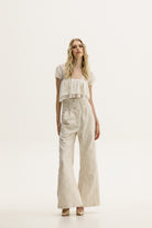 The signature Tansy Pants in vanilla combine a luxurious fabric blend that offers both comfort and structure. The soft, breathable denim drapes beautifully,and combines perfectly with the pink tulle detailing, enhancing the flared silhouette that adds a retro-inspired flair. With a relaxed fit and graceful flare, these pants create a flattering, feminine shape that’s perfect for casual or semi-casual looks.