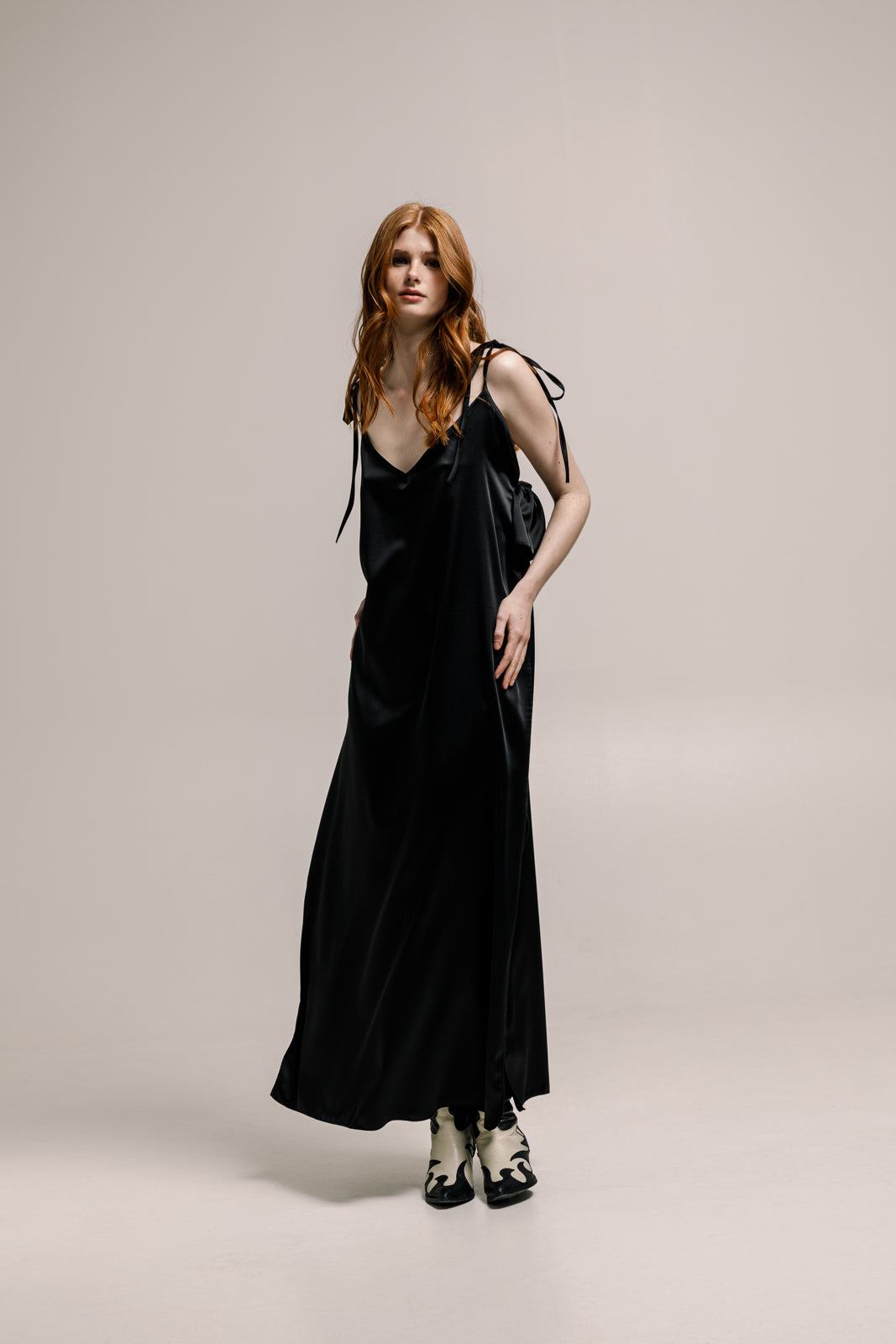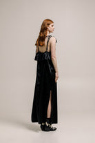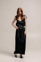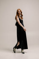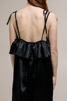 The Tarlo Dress in black features a soft, flowing design with a light, feminine silhouette. Its subtle, elegant tone makes it perfect for various occasions, offering effortless style and versatility. Both sides slits and ruffled back detailing. Made in a satin, stunning fabrication is ideal for layering or wearing solo, this dress is a timeless addition to any wardrobe, with a flattering fit that moves gracefully with you.